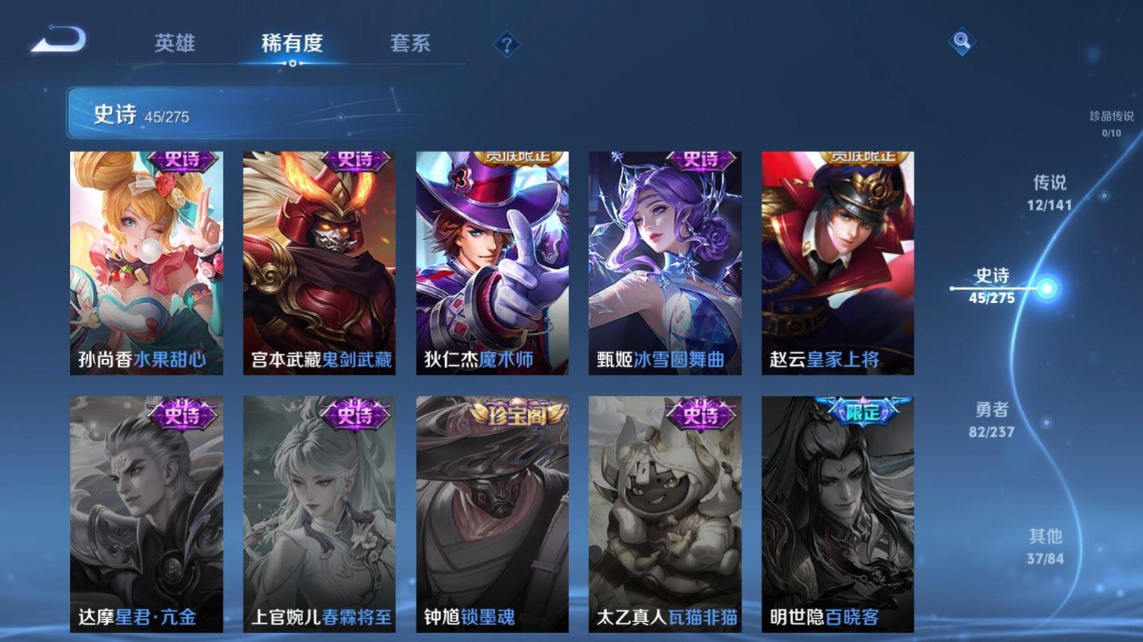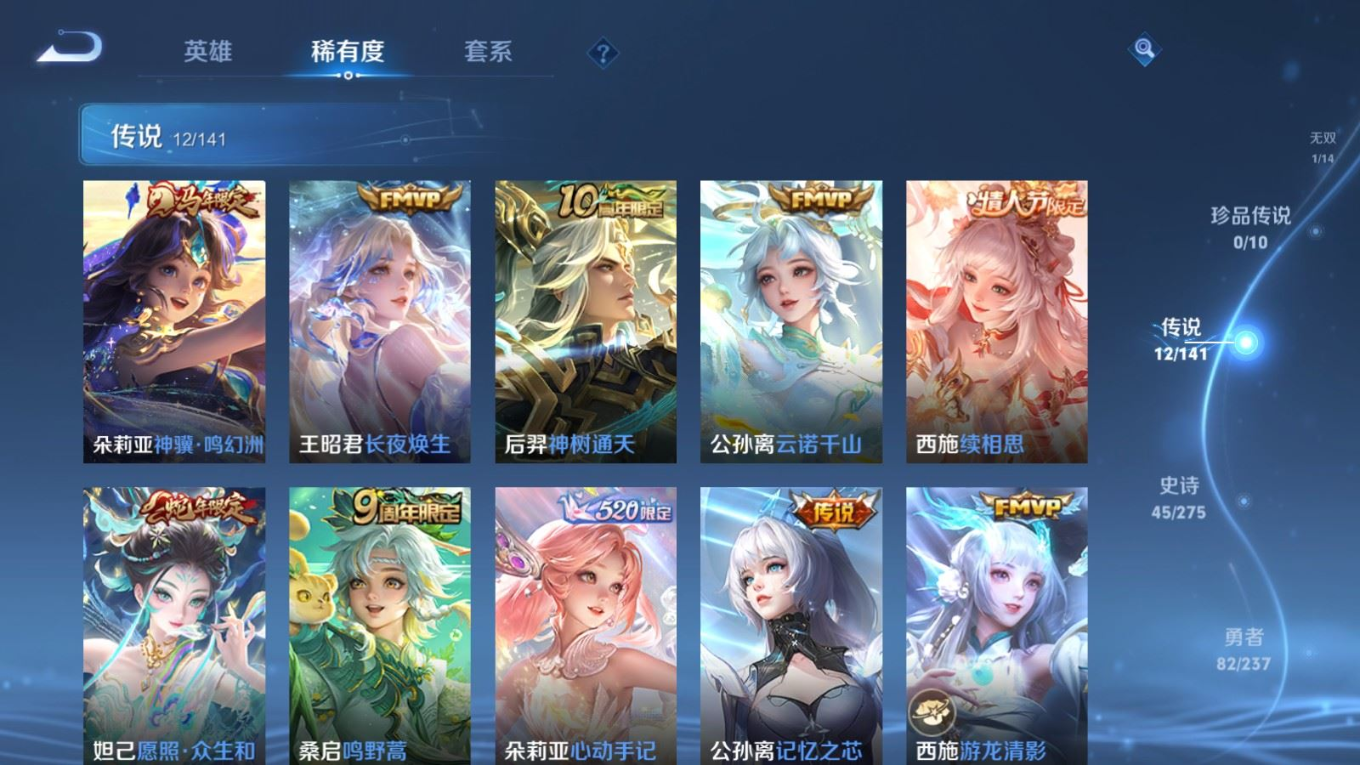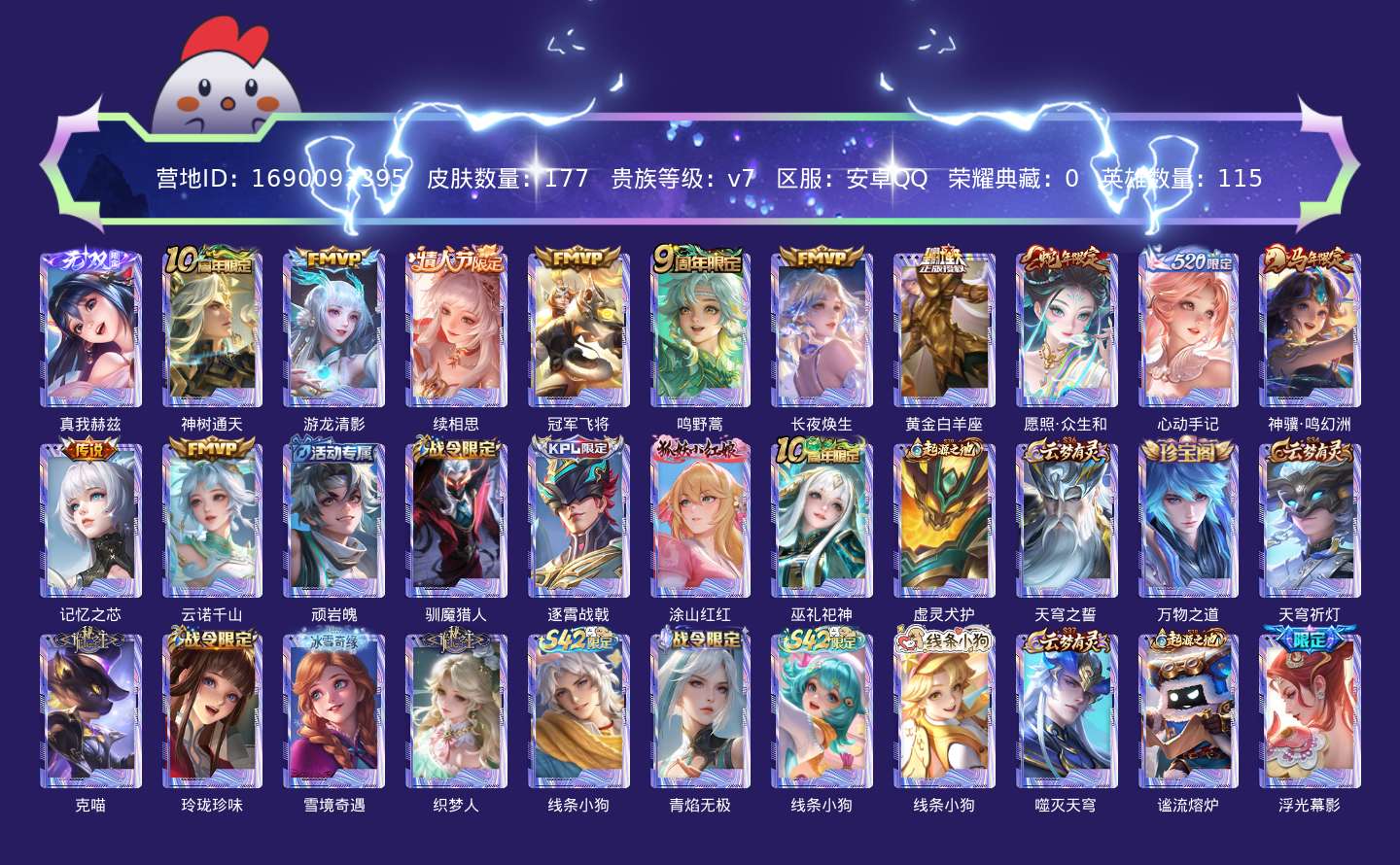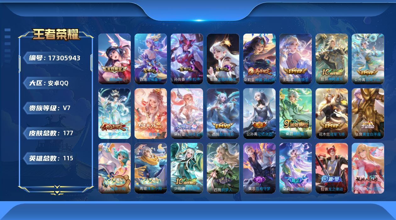 贵族等级:v7皮肤数:177传说品质12 情人节限定1 生肖限定4 无双1 英雄数:115