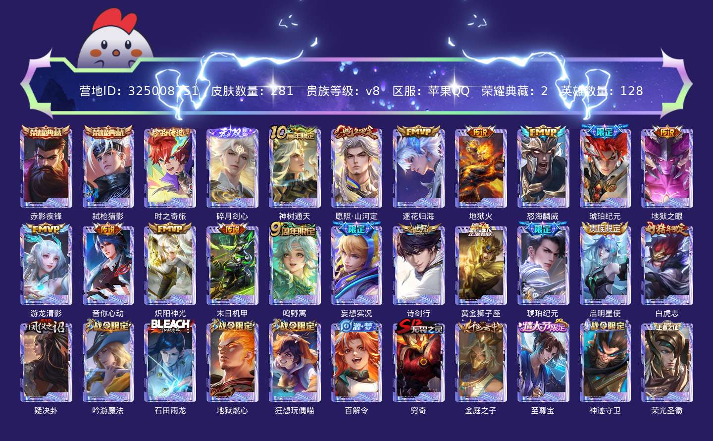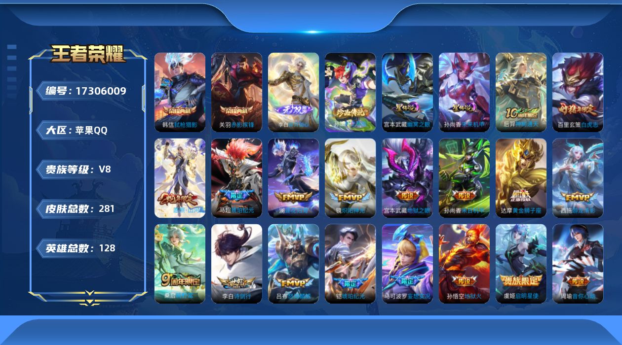 贵族等级:v8皮肤数:281传说品质18 荣耀典藏2 生肖限定3 情人节限定1 无双1 珍品传说1 英雄数:128