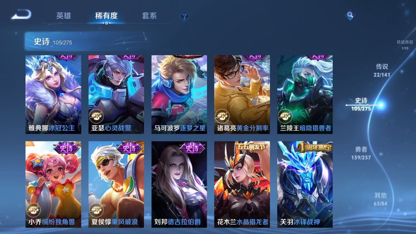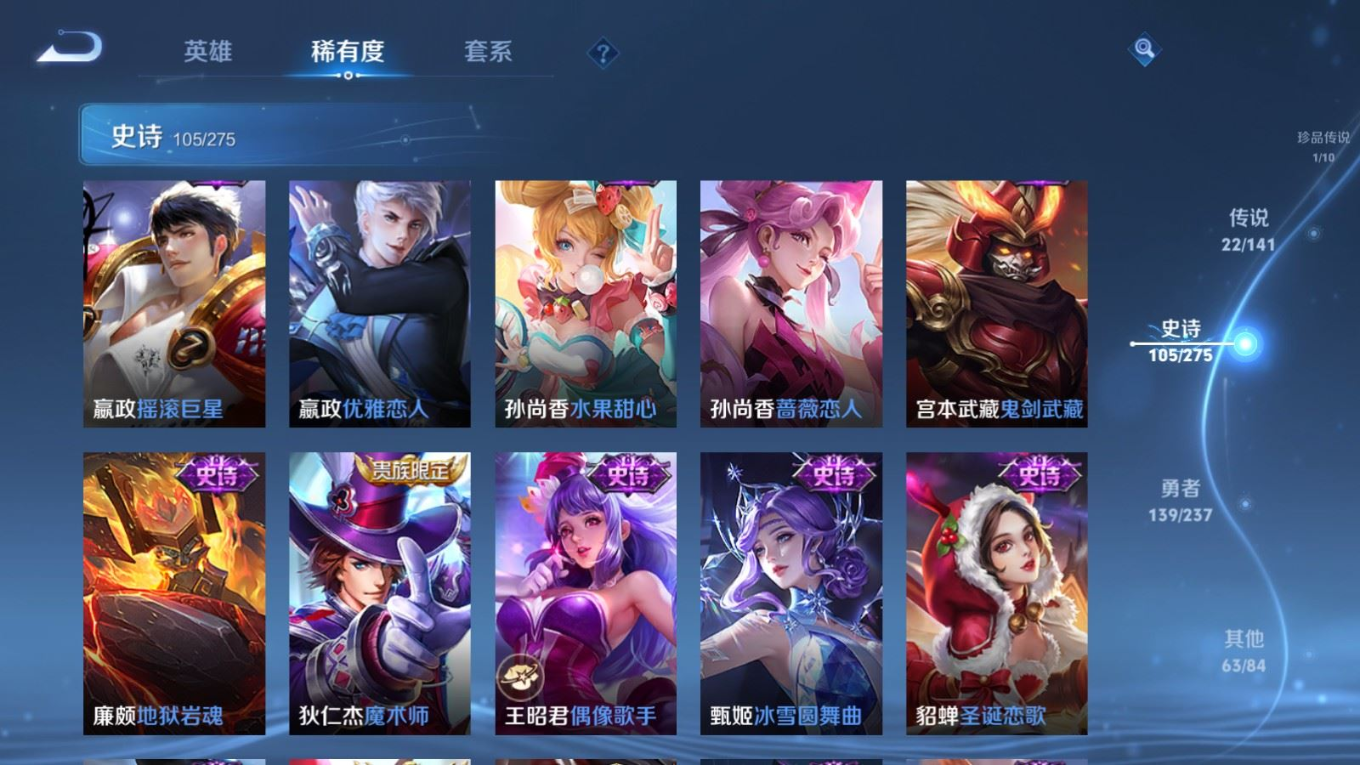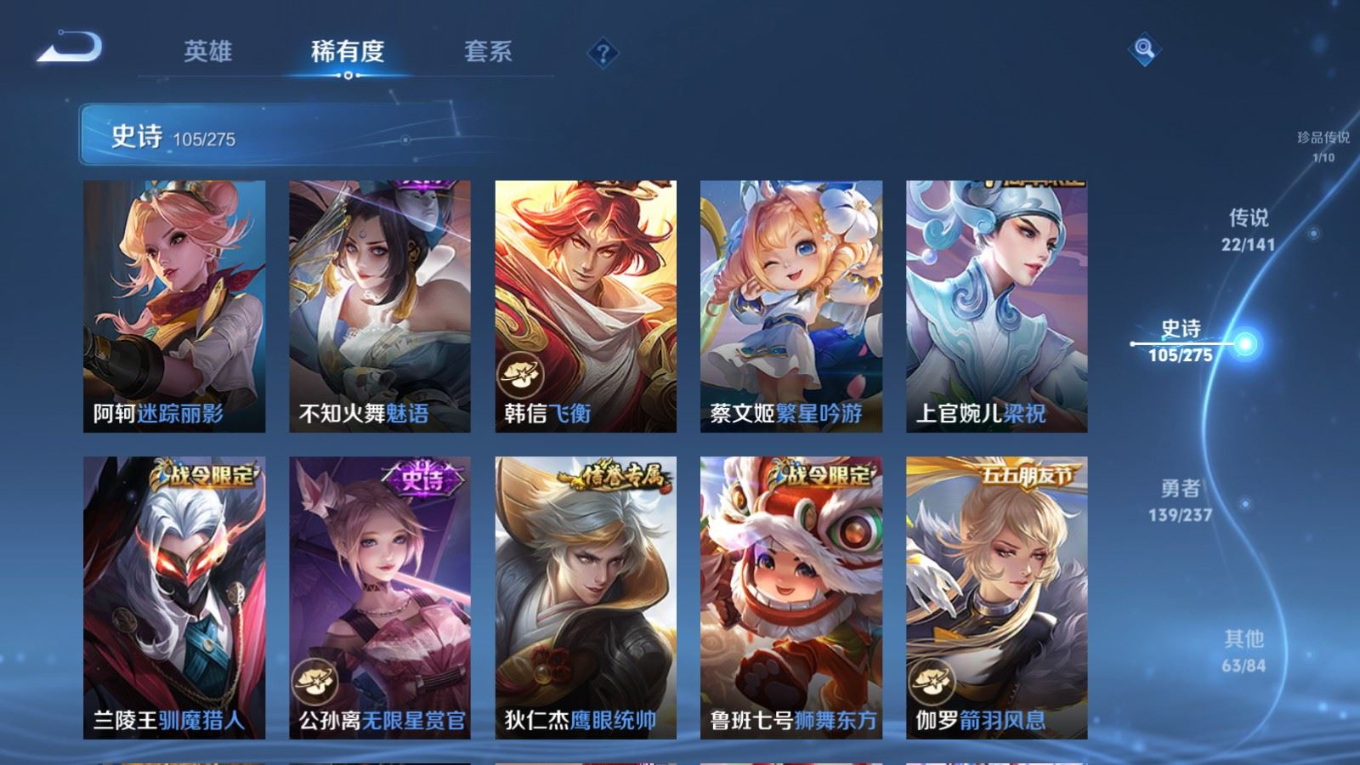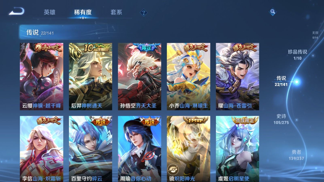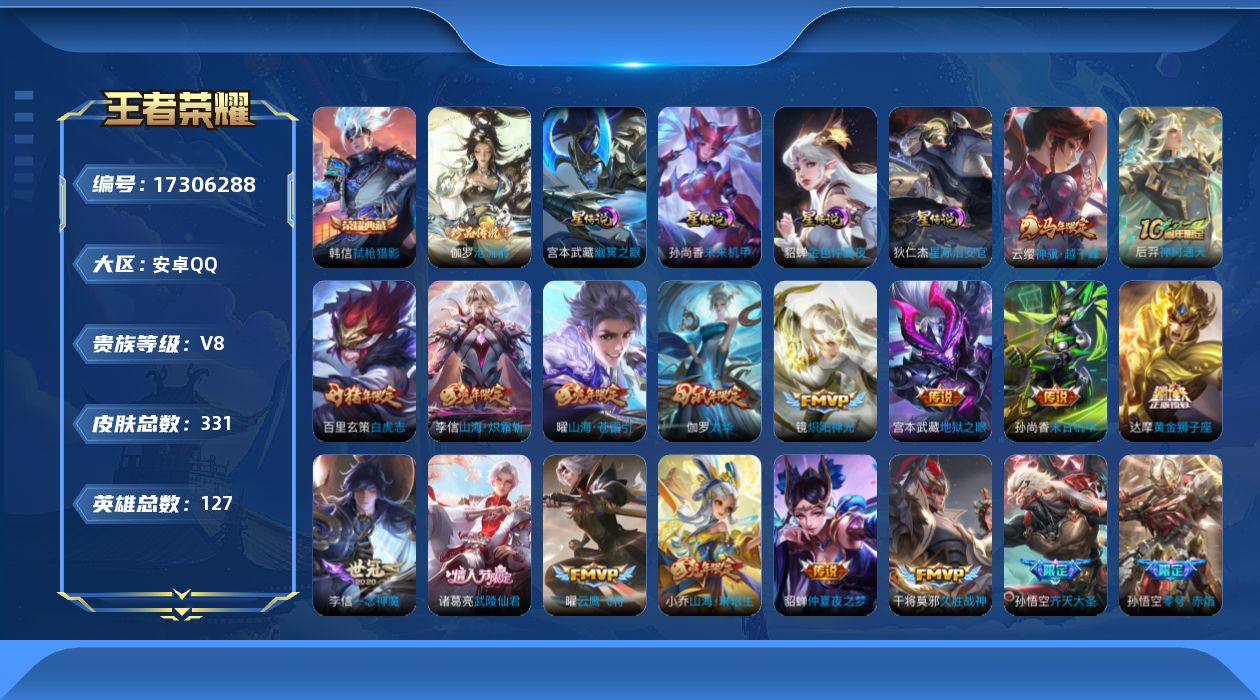 贵族等级:v8皮肤数:332生肖限定11 传说品质22 情人节限定3 珍品传说1 荣耀典藏1 英雄数:127