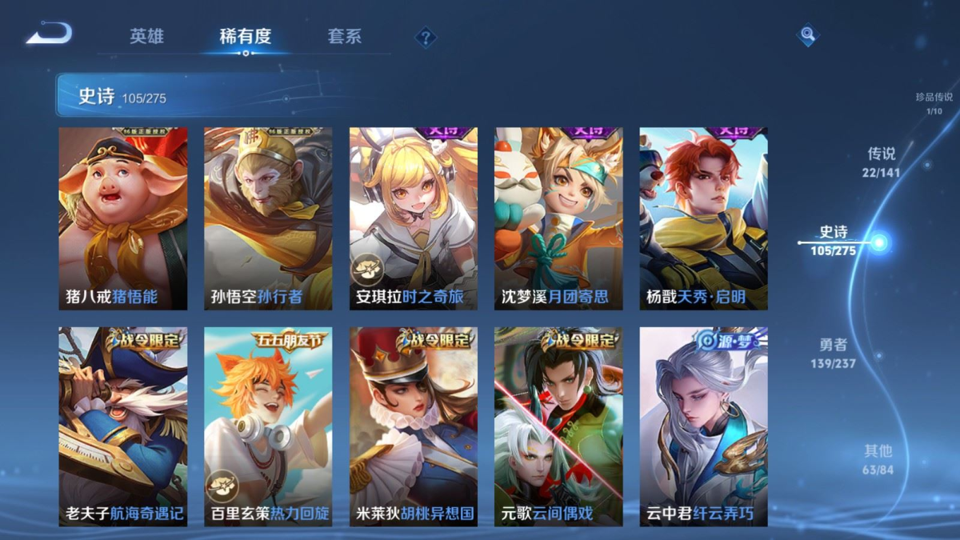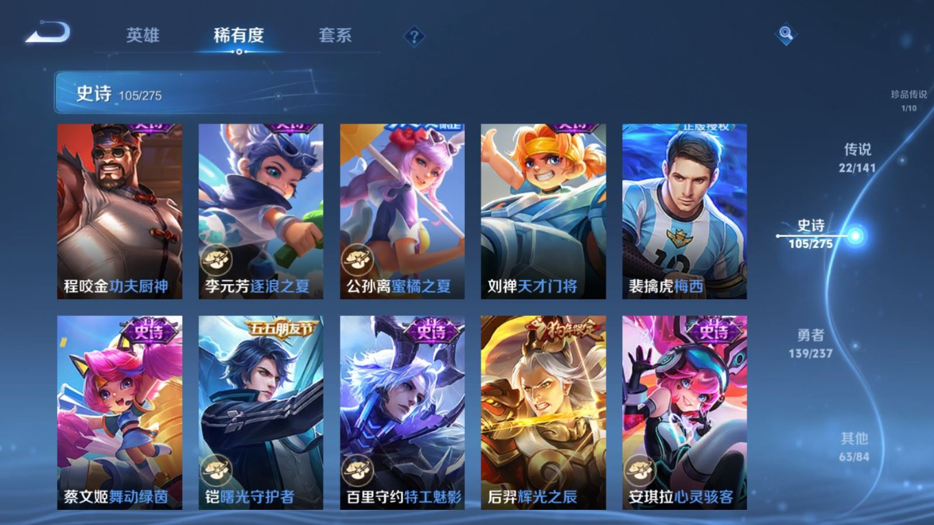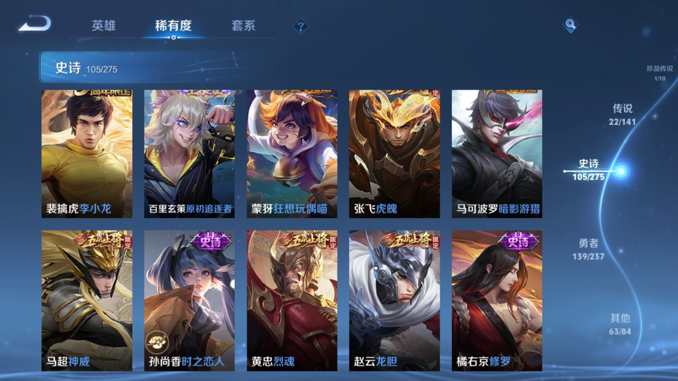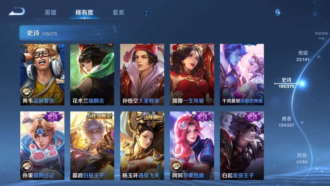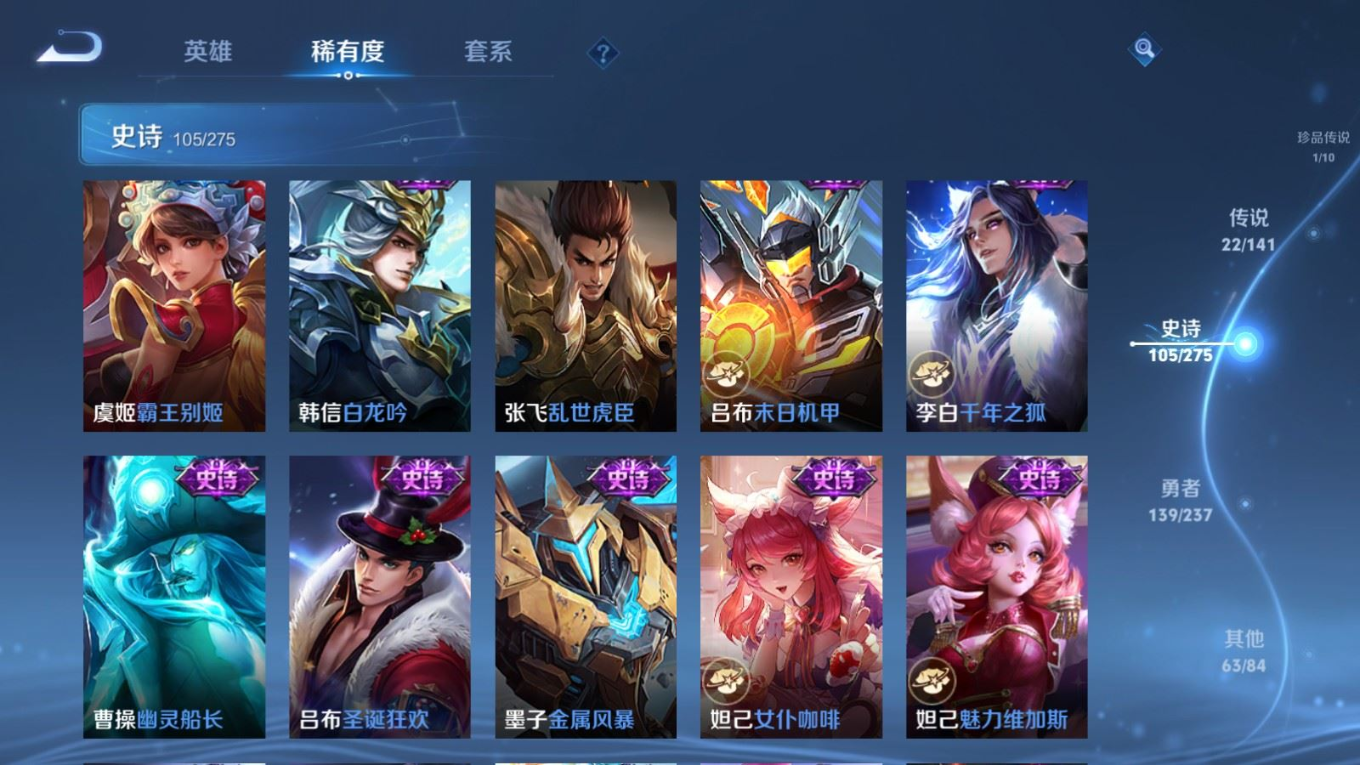 贵族等级:v8皮肤数:332生肖限定11 传说品质22 情人节限定3 珍品传说1 荣耀典藏1 英雄数:127