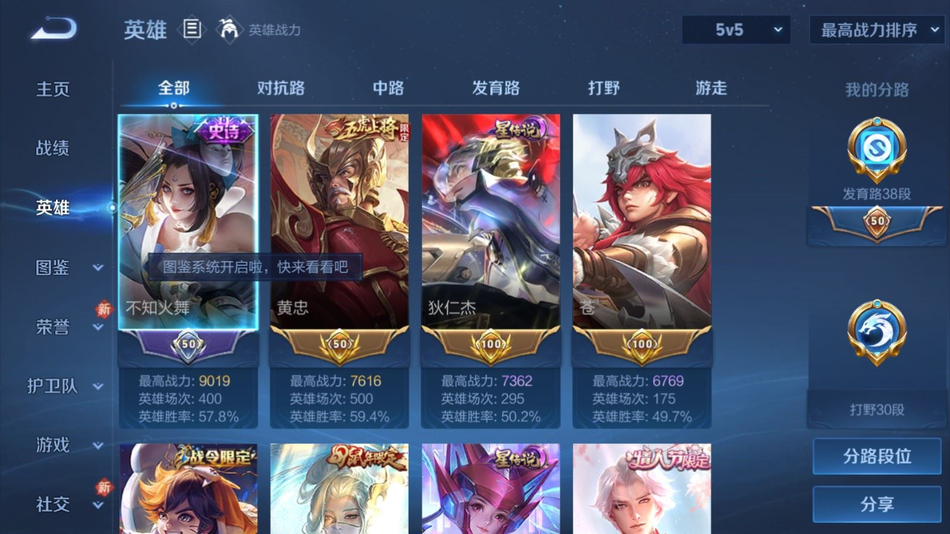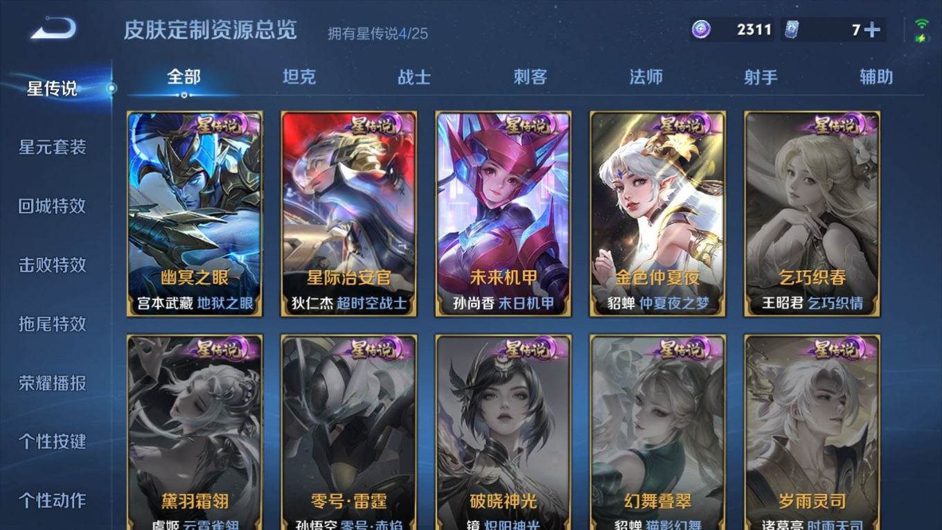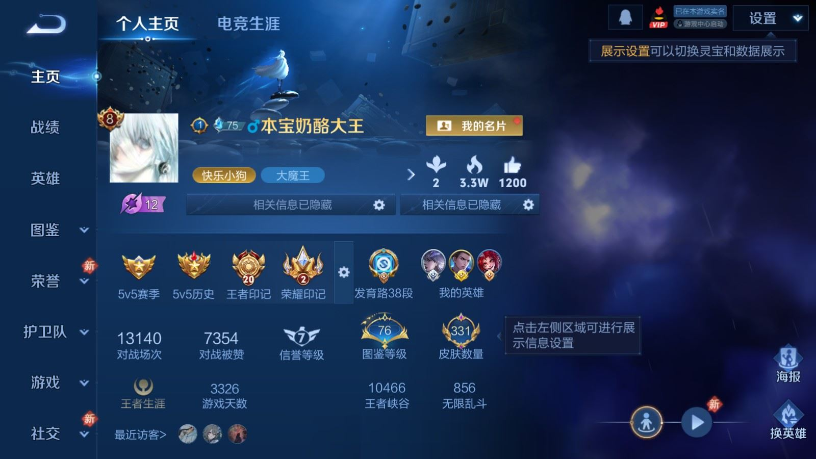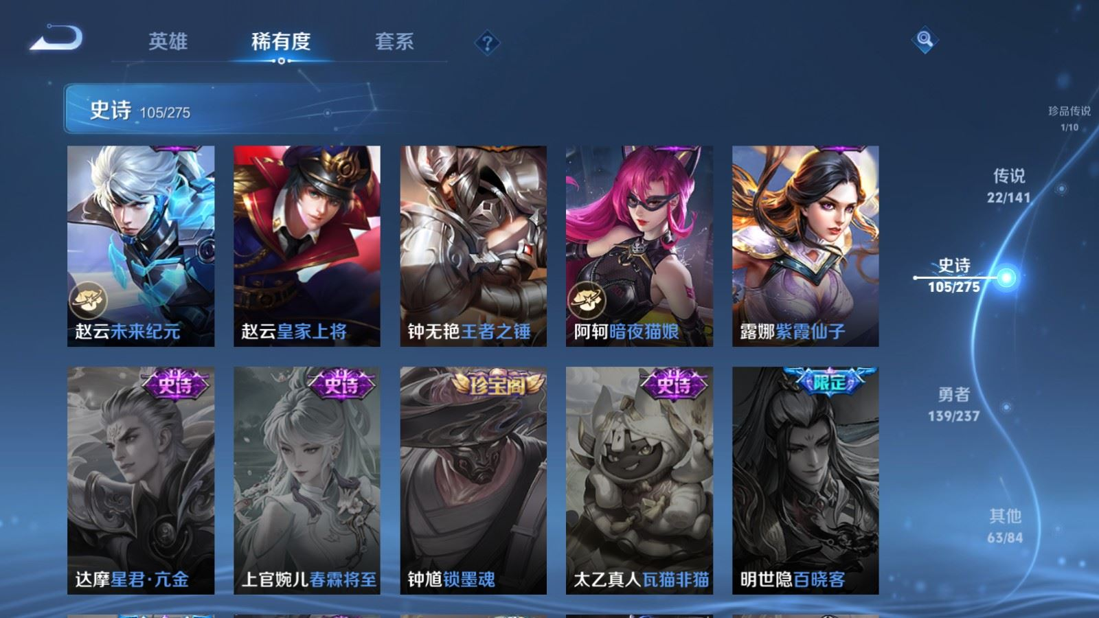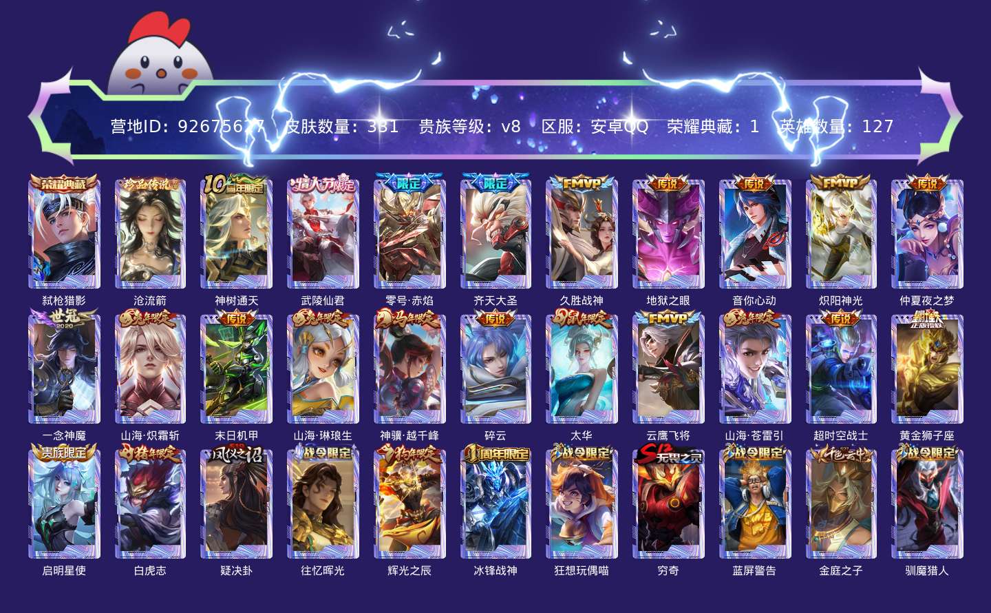 贵族等级:v8皮肤数:332生肖限定11 传说品质22 情人节限定3 珍品传说1 荣耀典藏1 英雄数:127