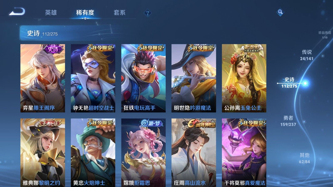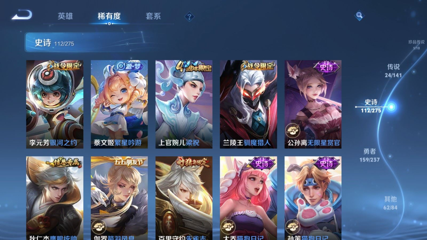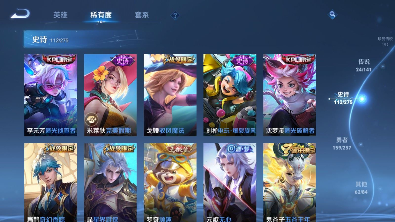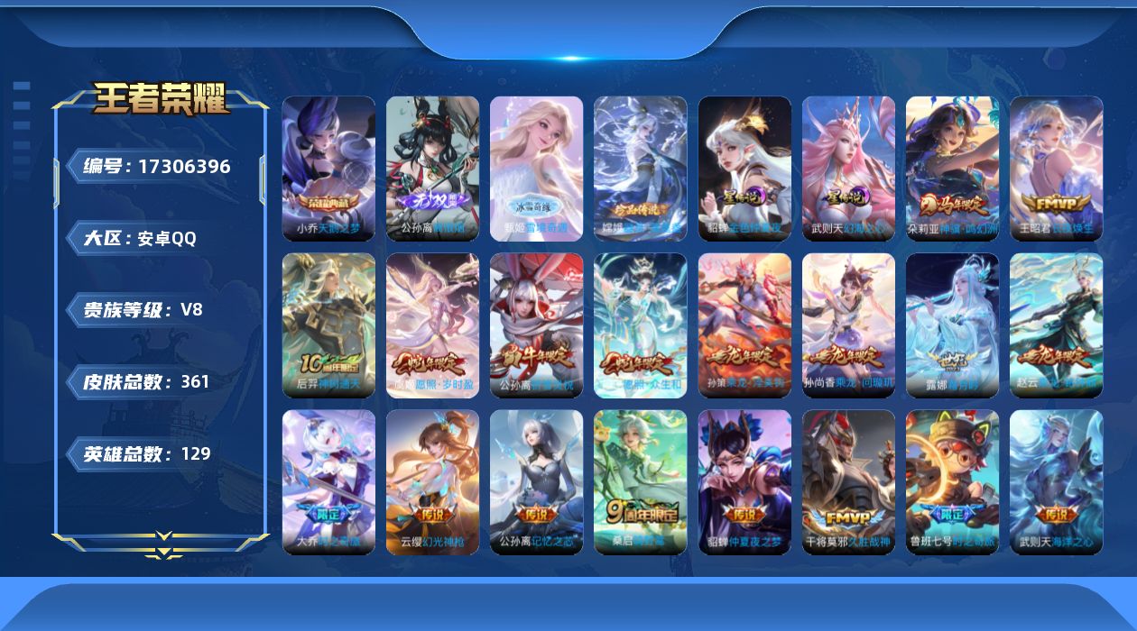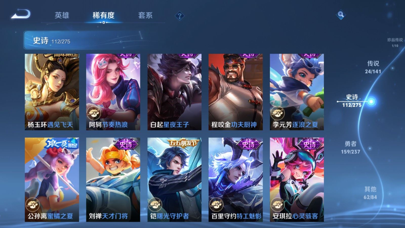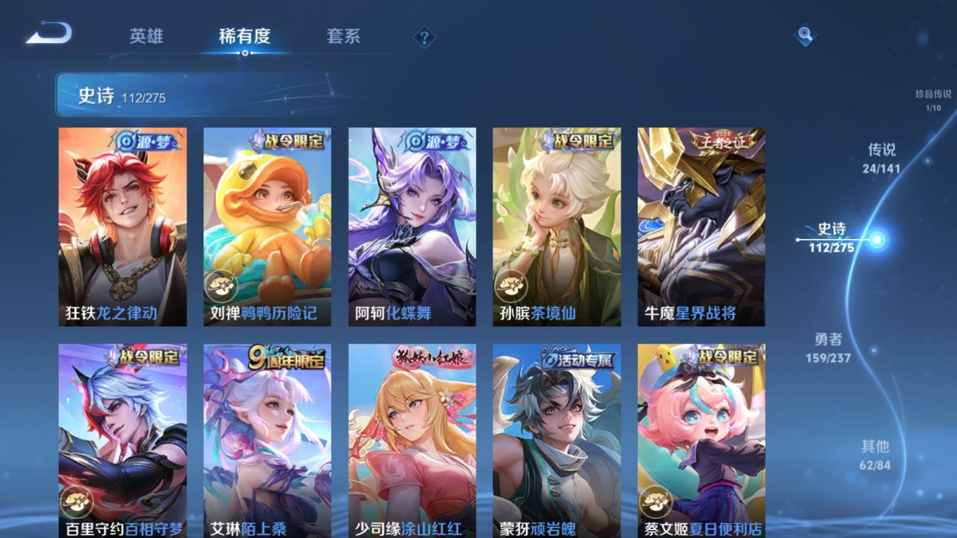 贵族等级:v8皮肤数:362传说品质24 生肖限定10 荣耀典藏1 珍品传说1 无双2 情人节限定1 英雄数:129