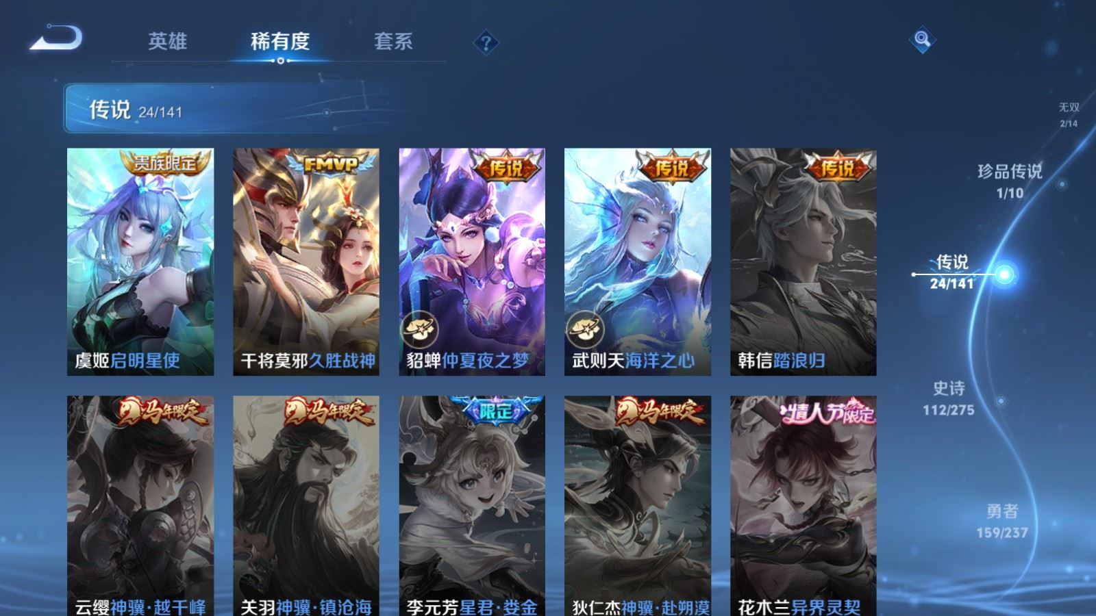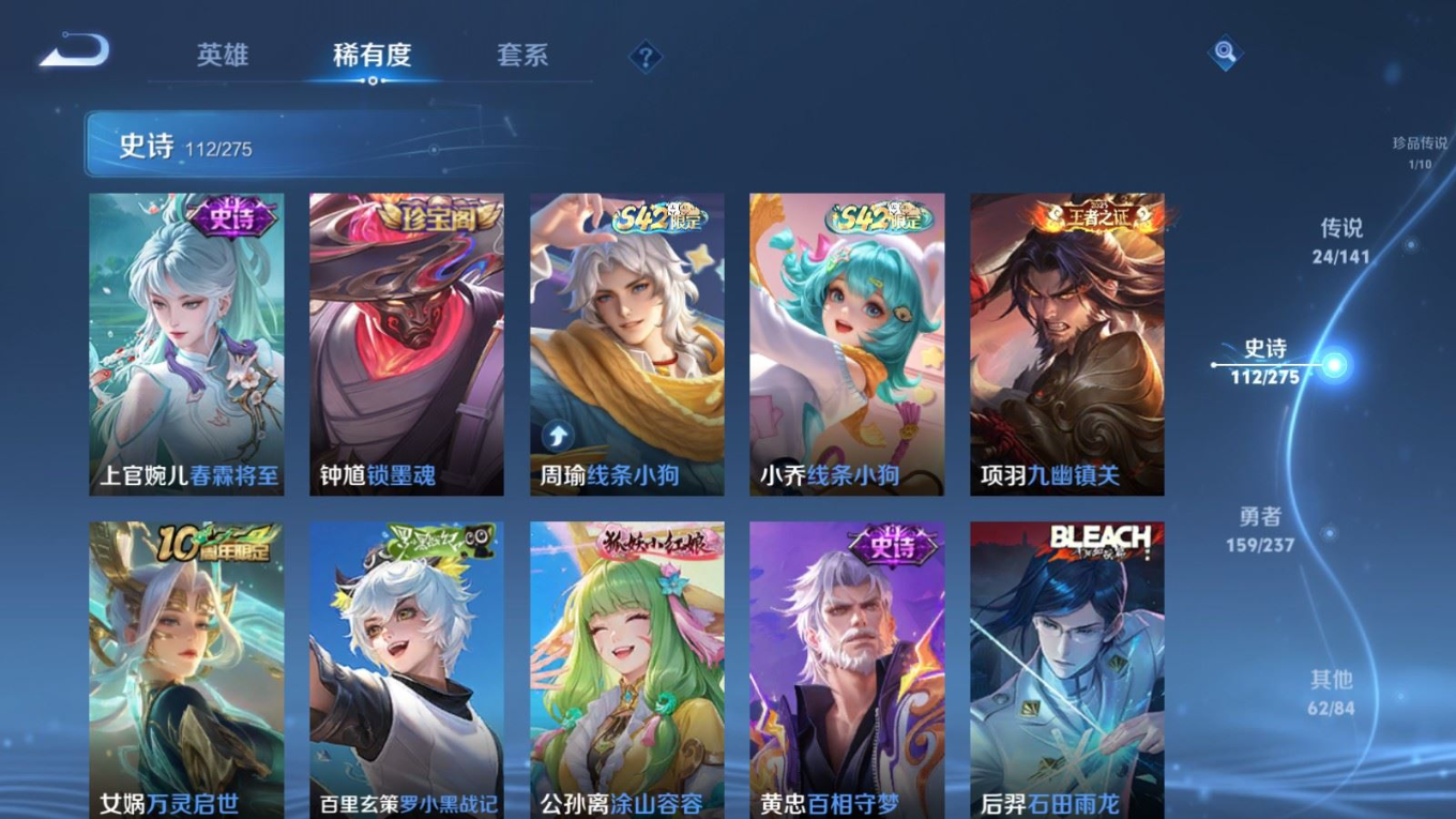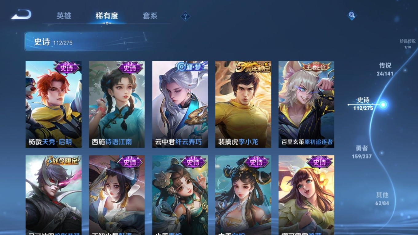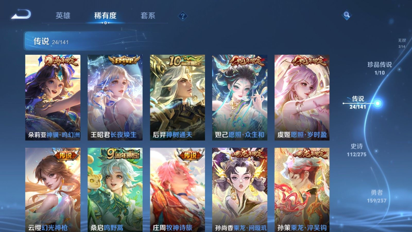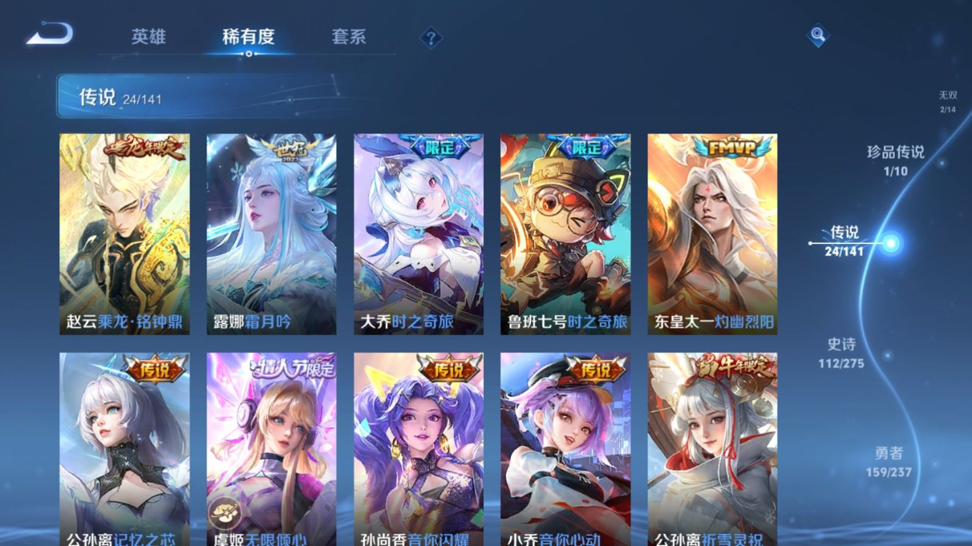 贵族等级:v8皮肤数:362传说品质24 生肖限定10 荣耀典藏1 珍品传说1 无双2 情人节限定1 英雄数:129