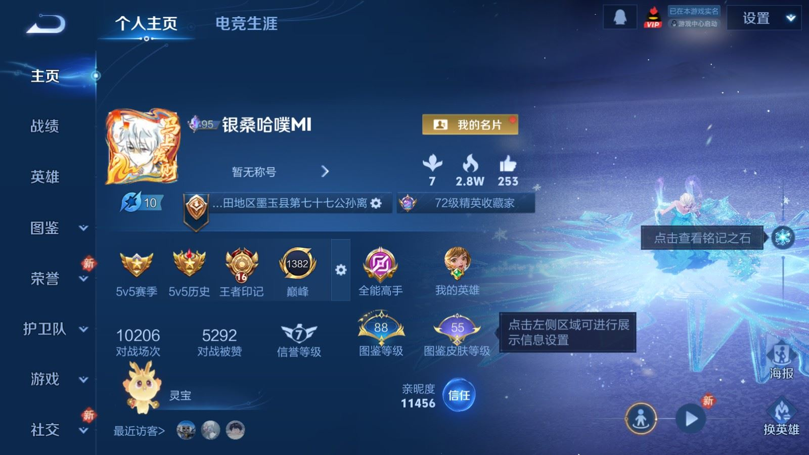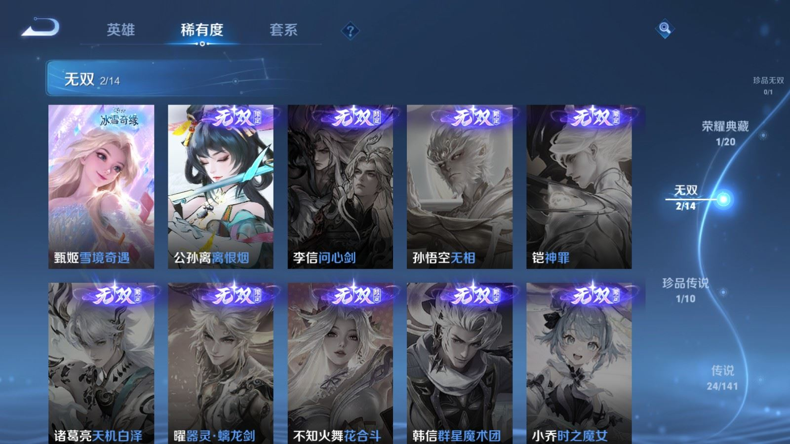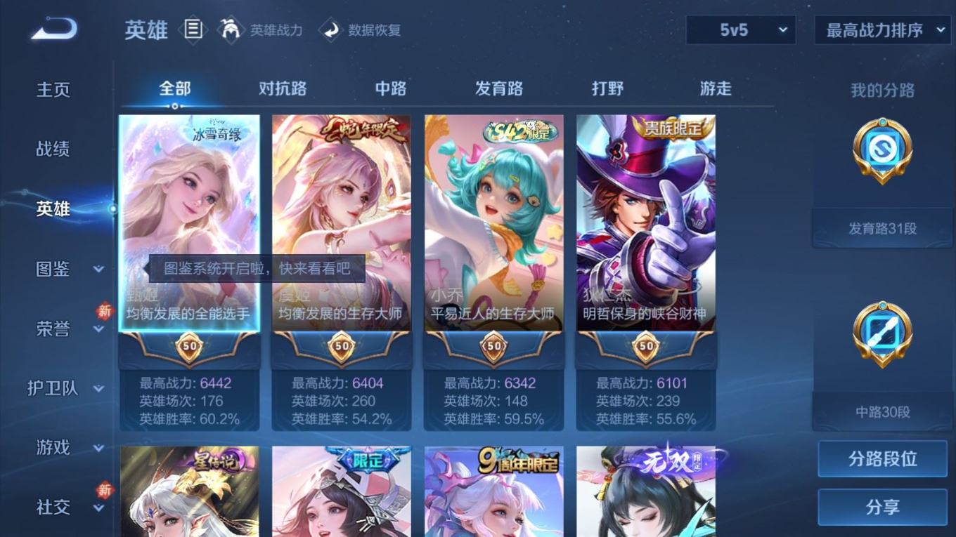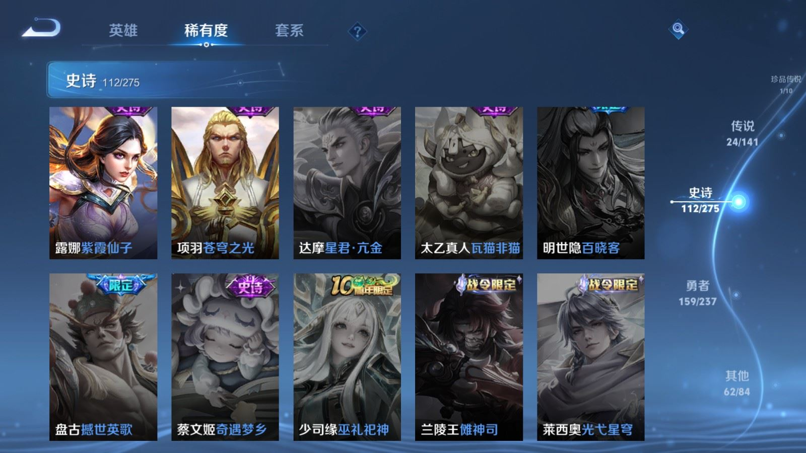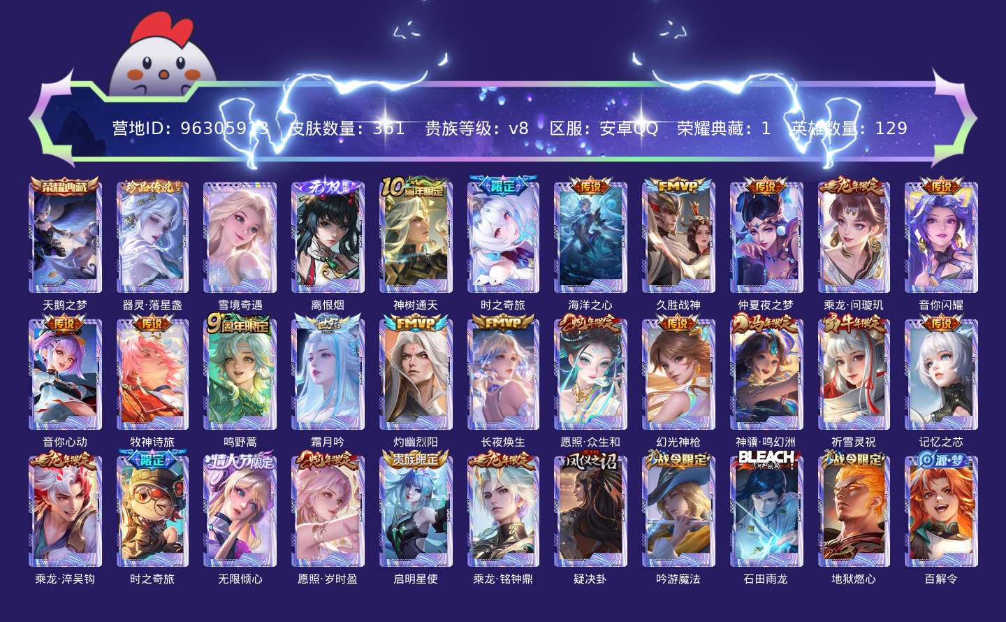 贵族等级:v8皮肤数:362传说品质24 生肖限定10 荣耀典藏1 珍品传说1 无双2 情人节限定1 英雄数:129