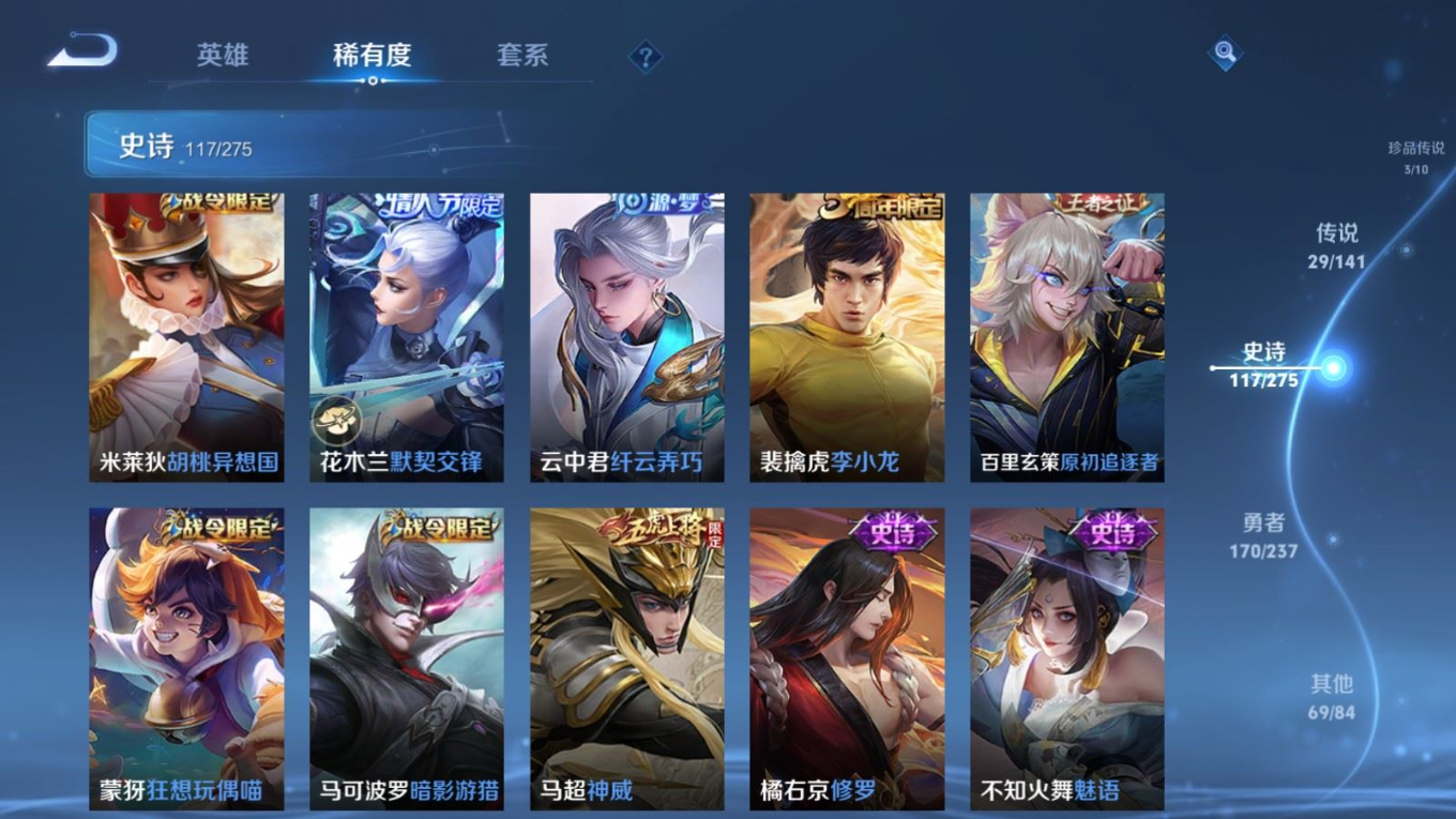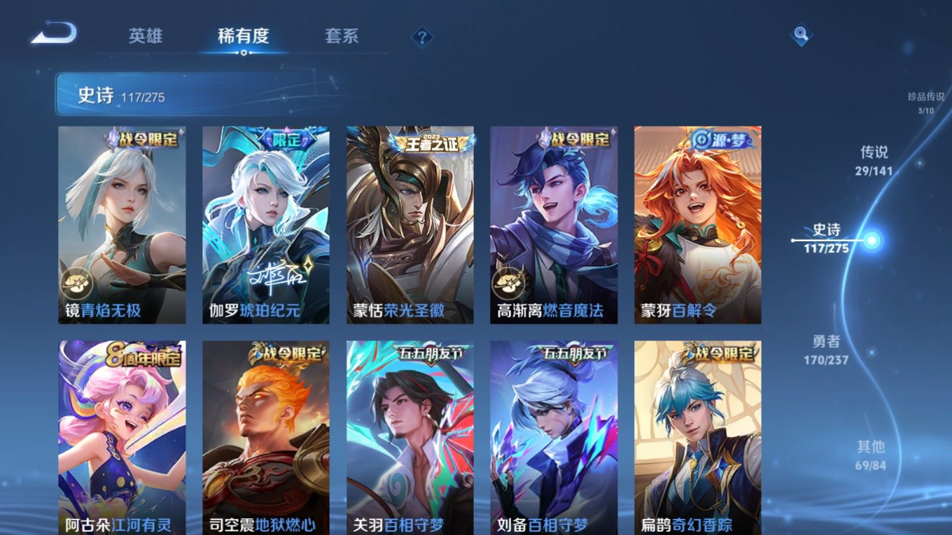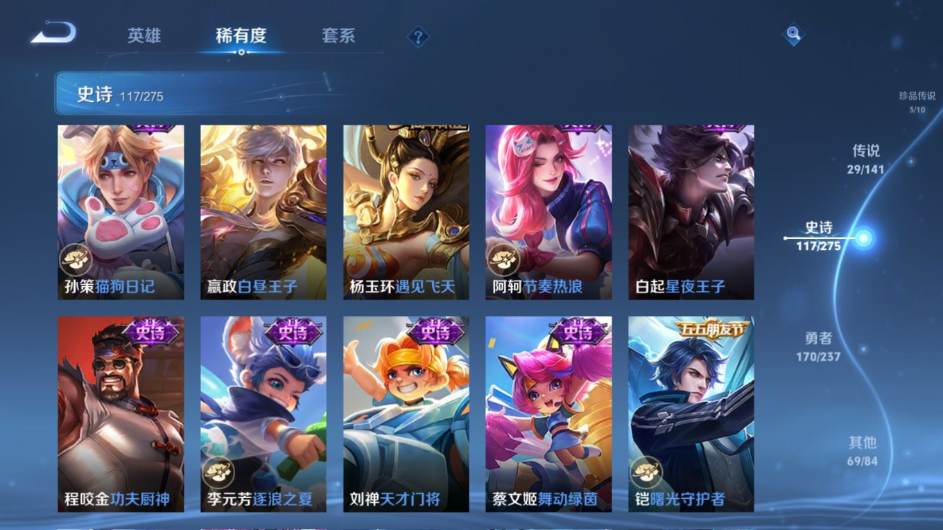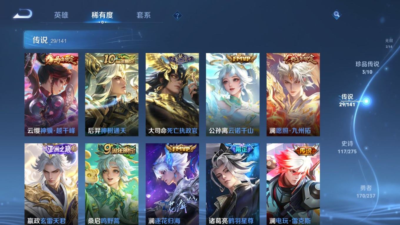 传说品质_后羿_黄金射手座传说品质_后羿_神树通天传说品质_澜_电玩·雷克斯传说品质_澜_逐花归海传说品质_澜_愿照·九州拓传说品质_诸葛亮_鹤羽星尊传说品质_孙悟空_齐天大圣传说品质_吕布_怒海麟威传说品质_马超_无双飞将传说品质_宫本武藏_地狱之眼传说品质_镜_炽阳神光传说品质_貂蝉_仲夏夜之梦传说品质_李信_一念神魔传说品质_孙尚香_异界灵契传说品质_桑启_鸣野蒿传说品质_云缨_神骥·越千峰传说品质_李白_凤求凰传说品质_张飞_百相守梦传说品质_大司命_死亡执政官传说品质_公孙离_云诺千山传说品质_夏洛特_浮生妄传说品质_曜_李逍遥 传说品质_达摩_黄金狮子座传说品质_虞姬_无限倾心传说品质_虞姬_启明星使传说品质_嬴政_玄雷天君传说品质_李元芳_飞鸢探春传说品质_百里玄策_白虎志传说品质_裴擒虎_寅虎·赤拳
