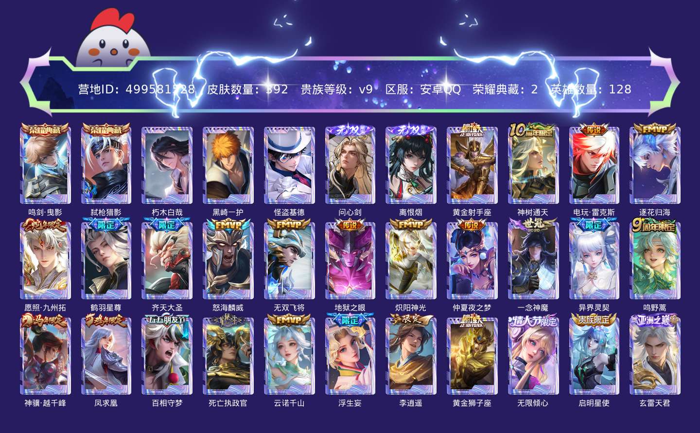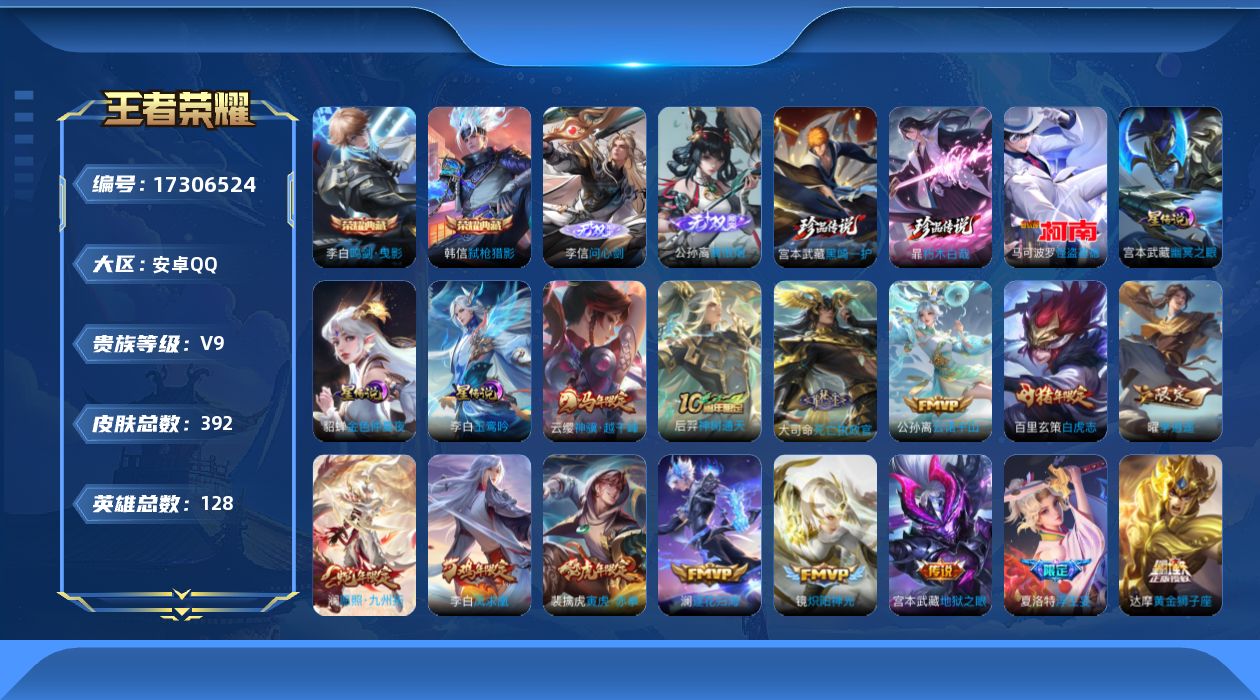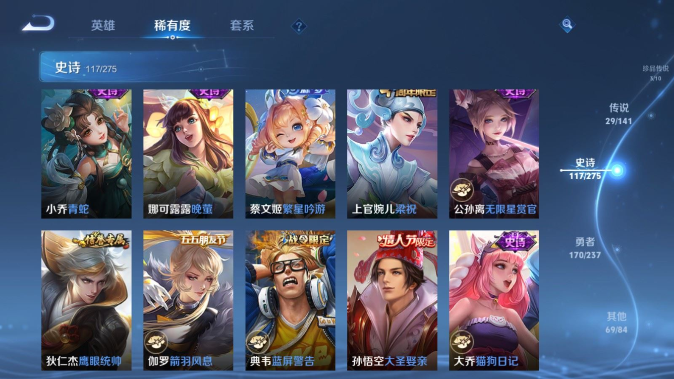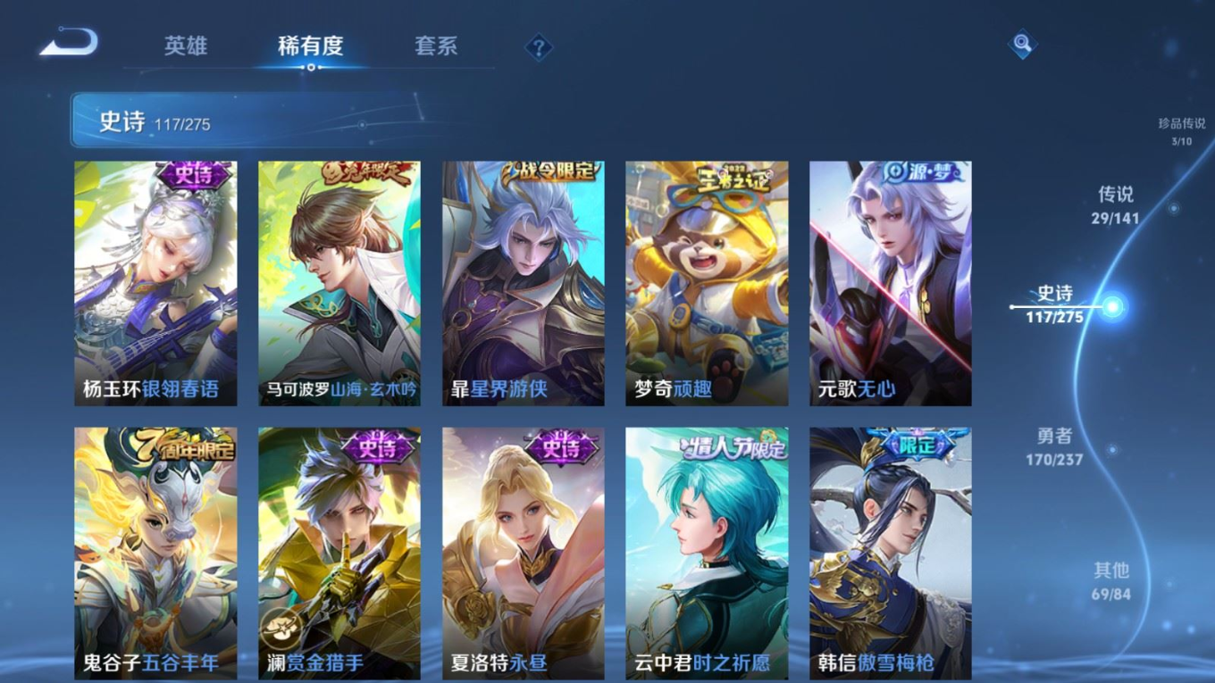 传说品质_后羿_黄金射手座传说品质_后羿_神树通天传说品质_澜_电玩·雷克斯传说品质_澜_逐花归海传说品质_澜_愿照·九州拓传说品质_诸葛亮_鹤羽星尊传说品质_孙悟空_齐天大圣传说品质_吕布_怒海麟威传说品质_马超_无双飞将传说品质_宫本武藏_地狱之眼传说品质_镜_炽阳神光传说品质_貂蝉_仲夏夜之梦传说品质_李信_一念神魔传说品质_孙尚香_异界灵契传说品质_桑启_鸣野蒿传说品质_云缨_神骥·越千峰传说品质_李白_凤求凰传说品质_张飞_百相守梦传说品质_大司命_死亡执政官传说品质_公孙离_云诺千山传说品质_夏洛特_浮生妄传说品质_曜_李逍遥 传说品质_达摩_黄金狮子座传说品质_虞姬_无限倾心传说品质_虞姬_启明星使传说品质_嬴政_玄雷天君传说品质_李元芳_飞鸢探春传说品质_百里玄策_白虎志传说品质_裴擒虎_寅虎·赤拳