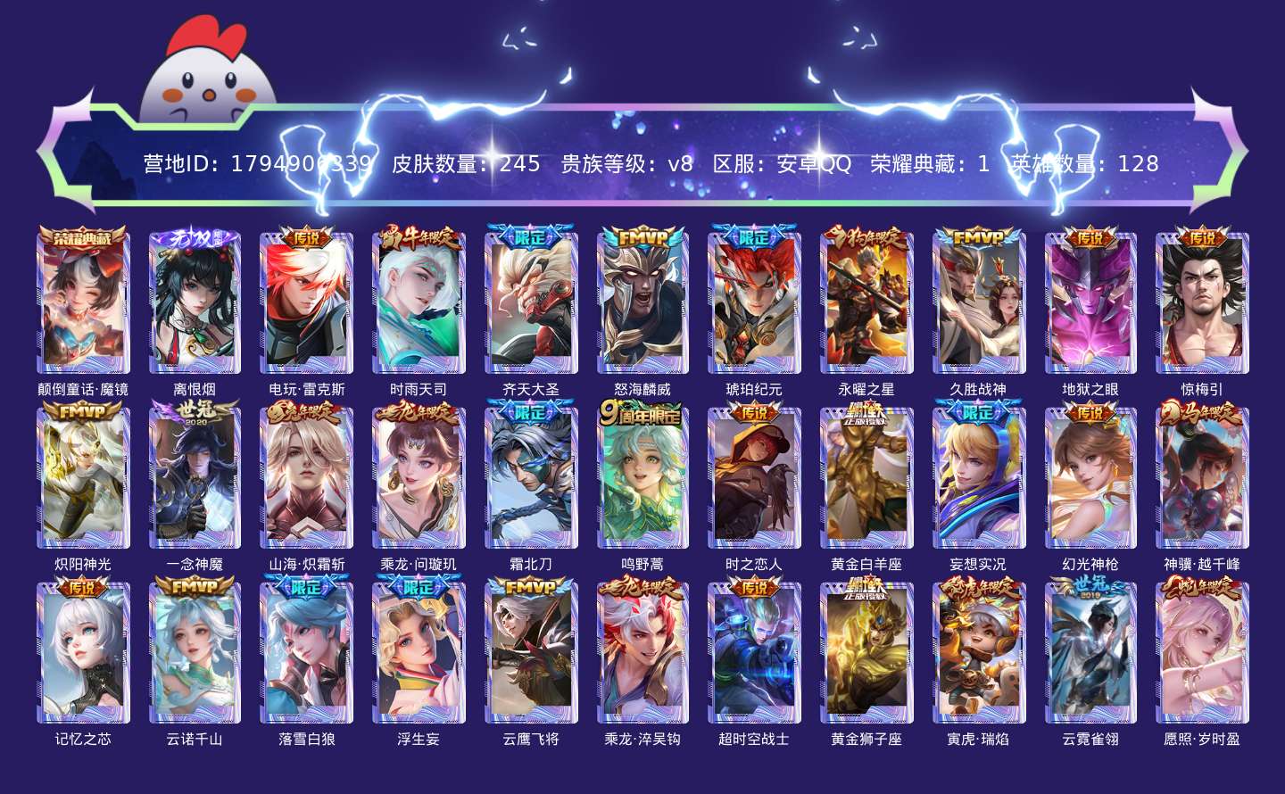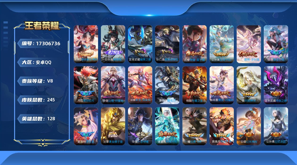 传说品质_澜_电玩·雷克斯传说品质_诸葛亮_时雨天司传说品质_孙悟空_齐天大圣传说品质_吕布_怒海麟威传说品质_马超_琥珀纪元传说品质_杨戬_永曜之星传说品质_干将莫邪_久胜战神传说品质_宫本武藏_地狱之眼传说品质_宫本武藏_惊梅引传说品质_镜_炽阳神光传说品质_李信_一念神魔传说品质_李信_山海·炽霜斩传说品质_孙尚香_乘龙·问璇玑传说品质_夏侯惇_霜北刀传说品质_桑启_鸣野蒿传说品质_刘备_时之恋人传说品质_张良_黄金白羊座传说品质_马可波罗_妄想实况传说品质_云缨_幻光神枪传说品质_云缨_神骥·越千峰传说品质_公孙离_记忆之芯传说品质_公孙离_云诺千山传说品质_亚连_落雪白狼传说品质_夏洛特_浮生妄传说品质_曜_云鹰飞将传说品质_孙策_乘龙·淬吴钩传说品质_狄仁杰_超时空战士传说品质_达摩_黄金狮子座传说品质_鲁班七号_寅虎·瑞焰传说品质_虞姬_云霓雀翎传说品质_虞姬_愿照·岁时盈传说品质_虞姬_启明星使传说品质_裴擒虎_祥瑞亨通