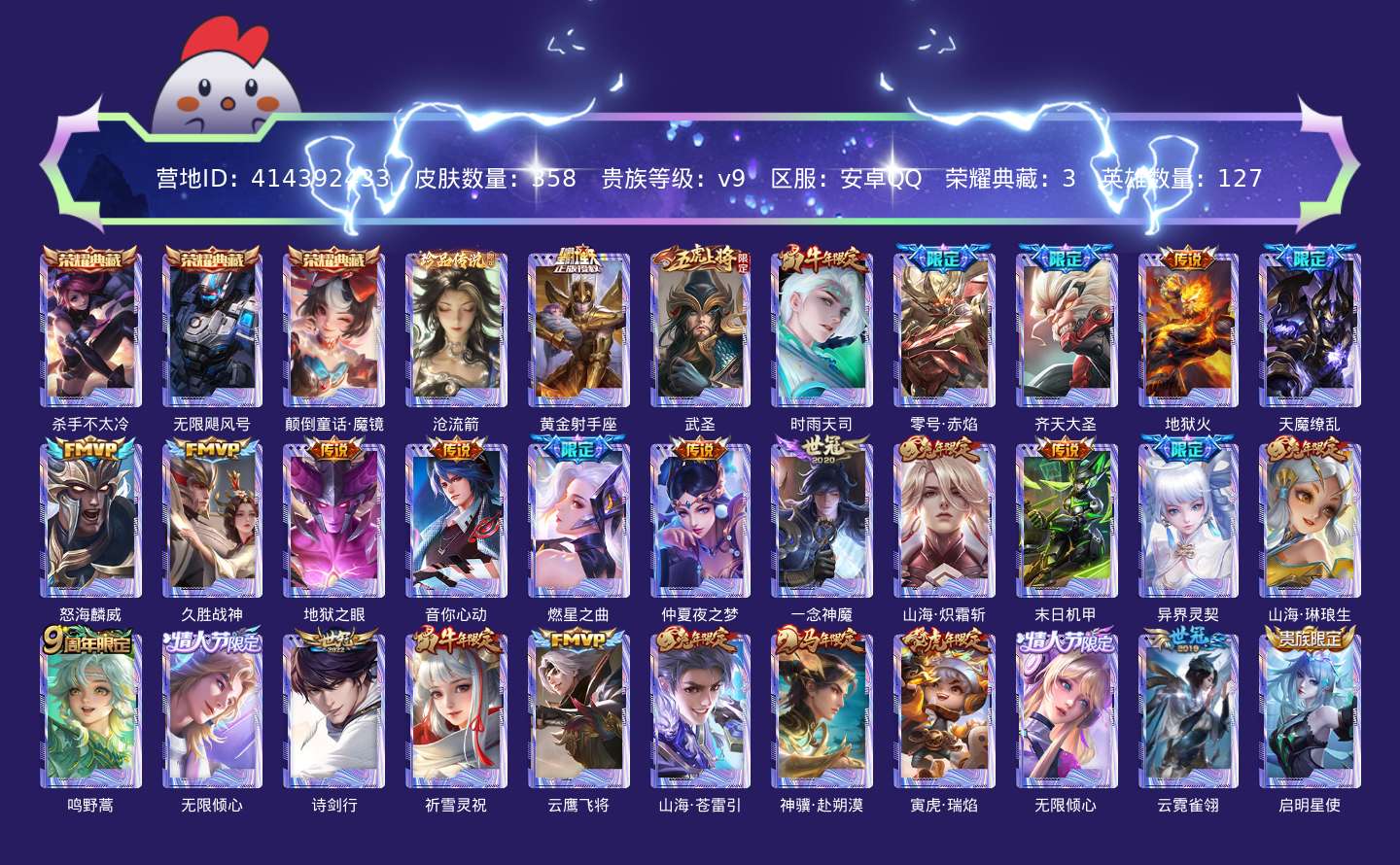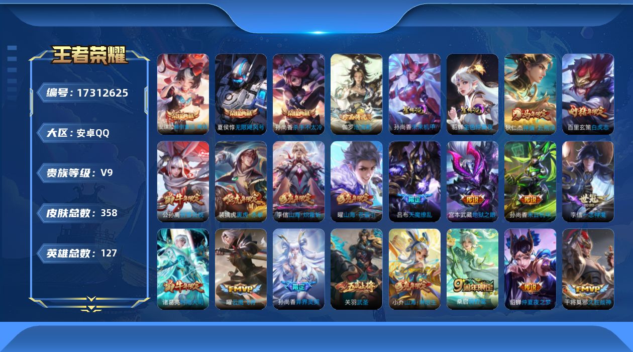 贵族等级:v9皮肤数:358传说品质33 生肖限定17 情人节限定4 荣耀典藏3 珍品传说1 英雄数:127
