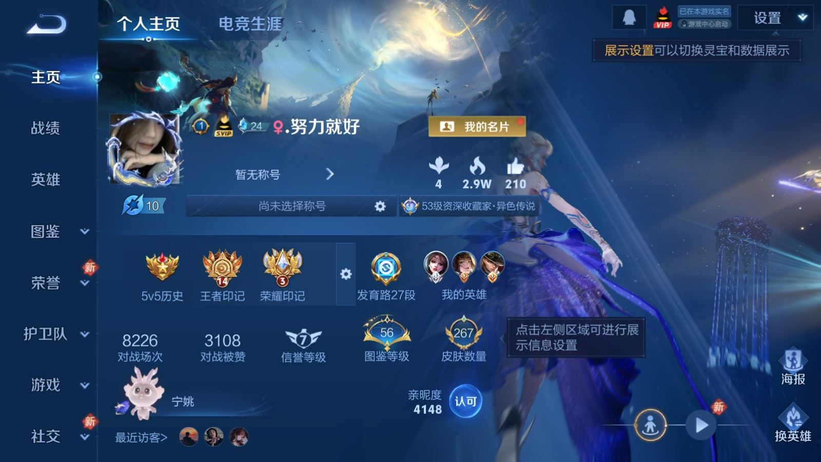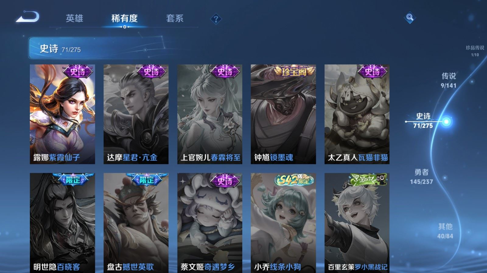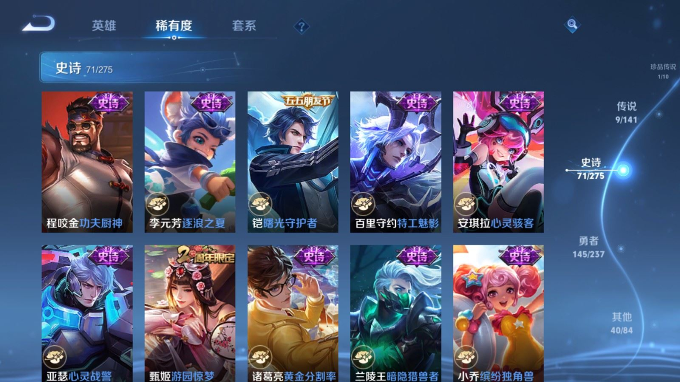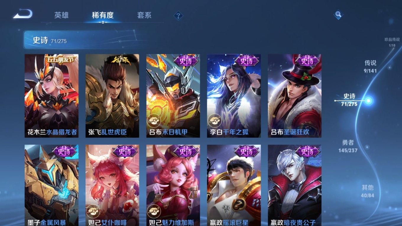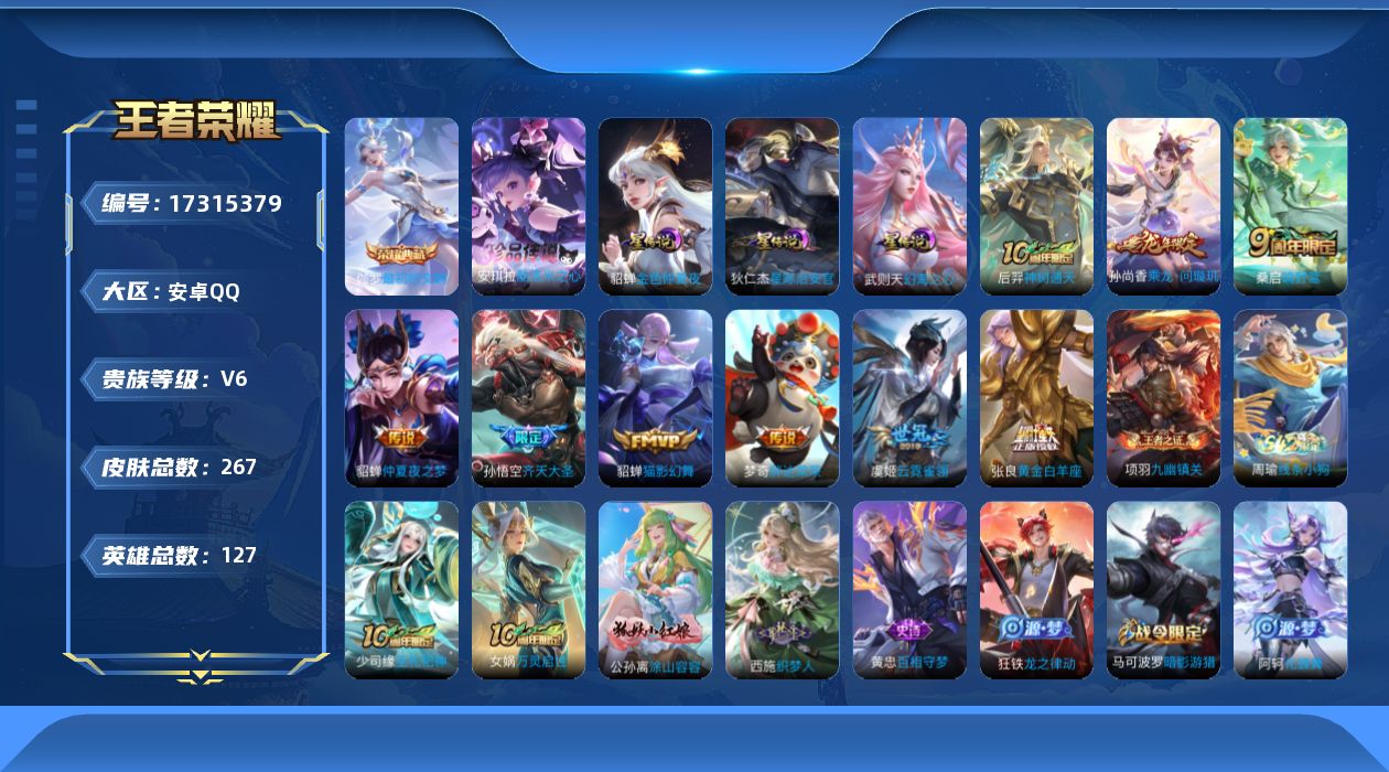 贵族等级:v6皮肤数:267传说品质9 生肖限定1 珍品传说1 荣耀典藏1 英雄数:127