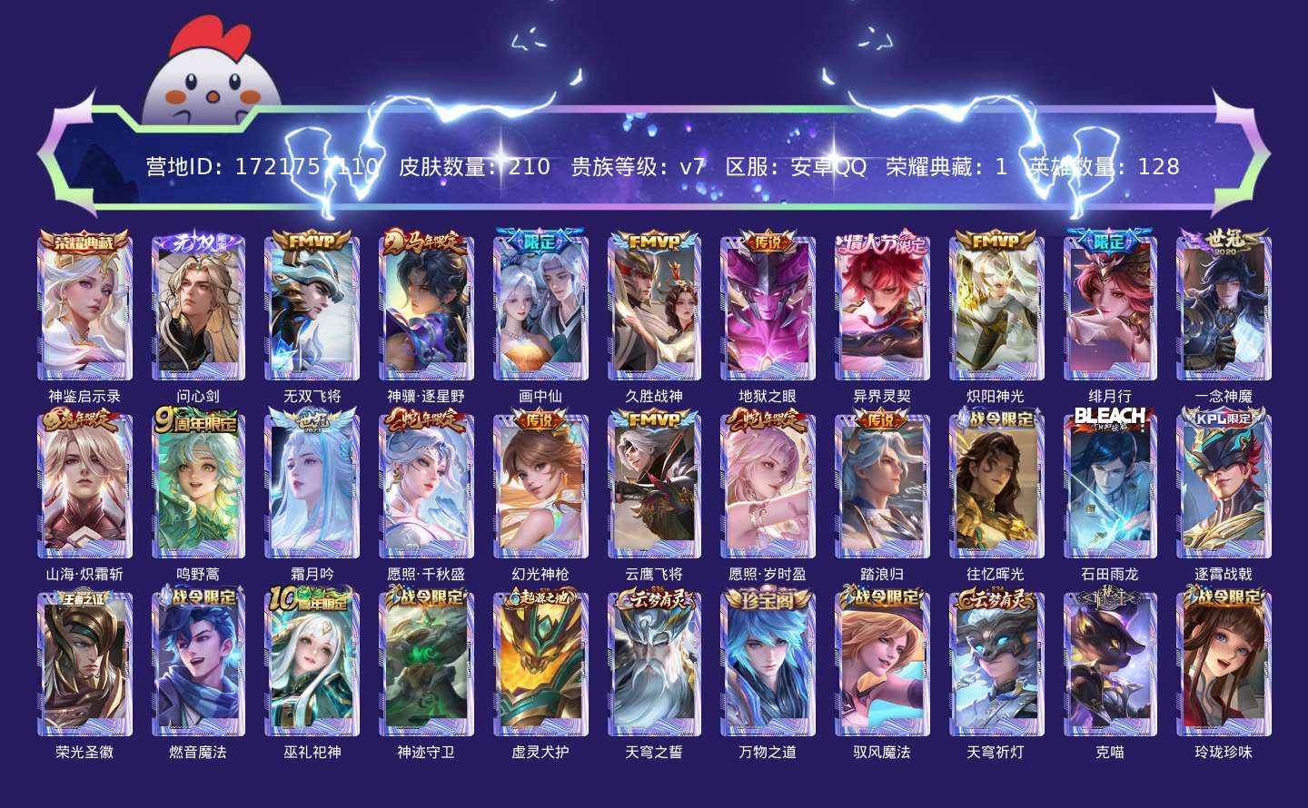 贵族等级:v7皮肤数:210传说品质17 生肖限定6 情人节限定1 无双1 荣耀典藏1 英雄数:128