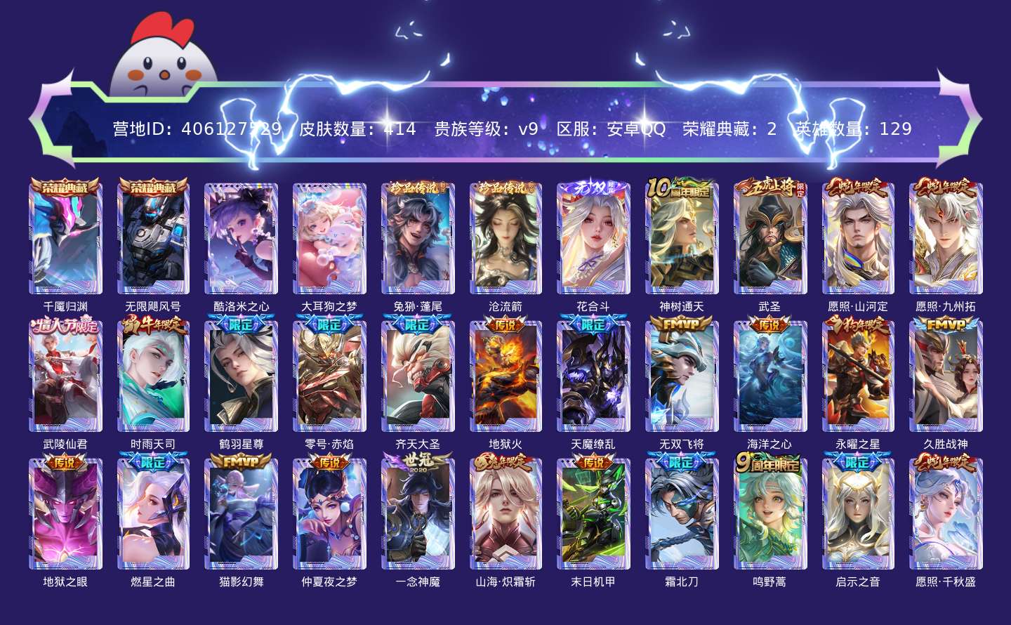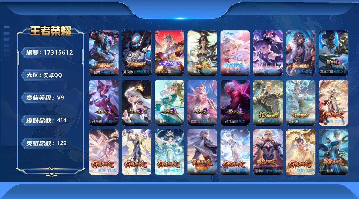 贵族等级:v9皮肤数:414生肖限定19 传说品质36 情人节限定4 荣耀典藏2 无双1 珍品传说4 英雄数:129