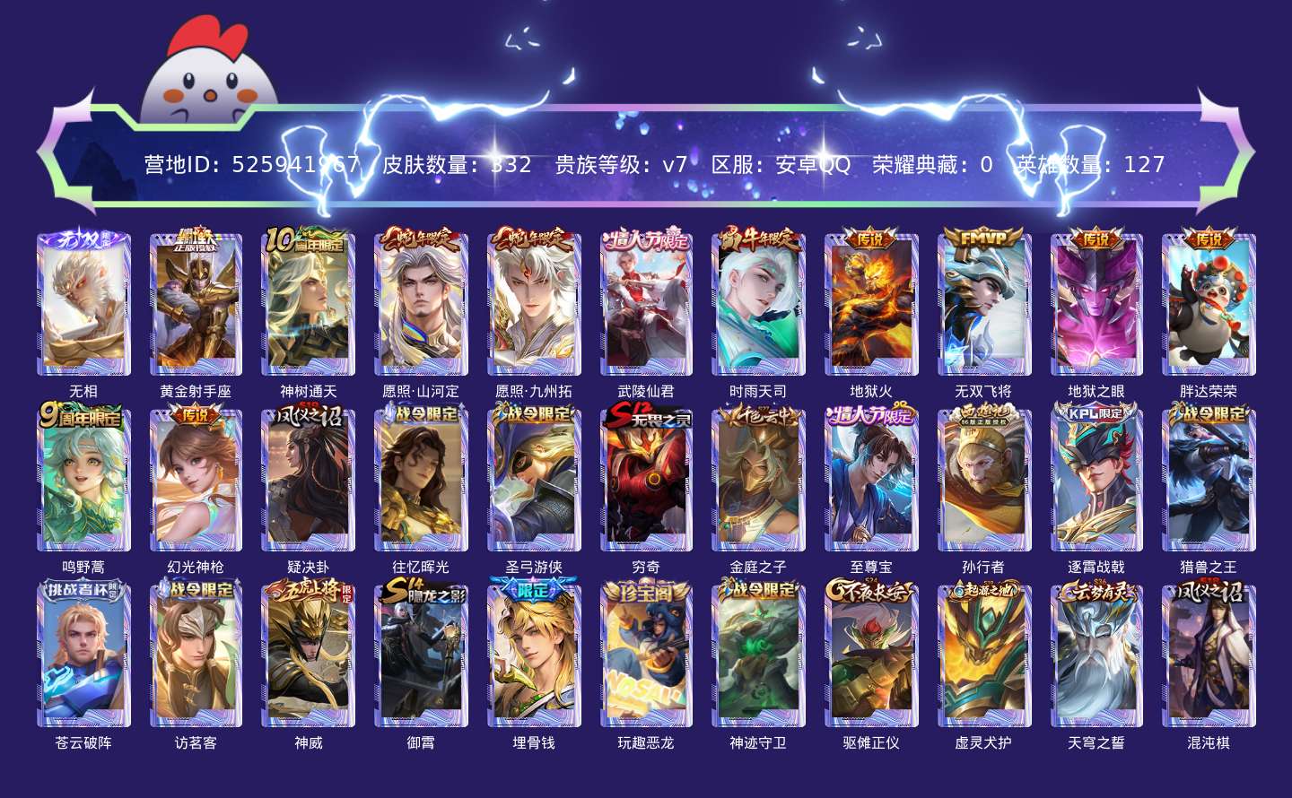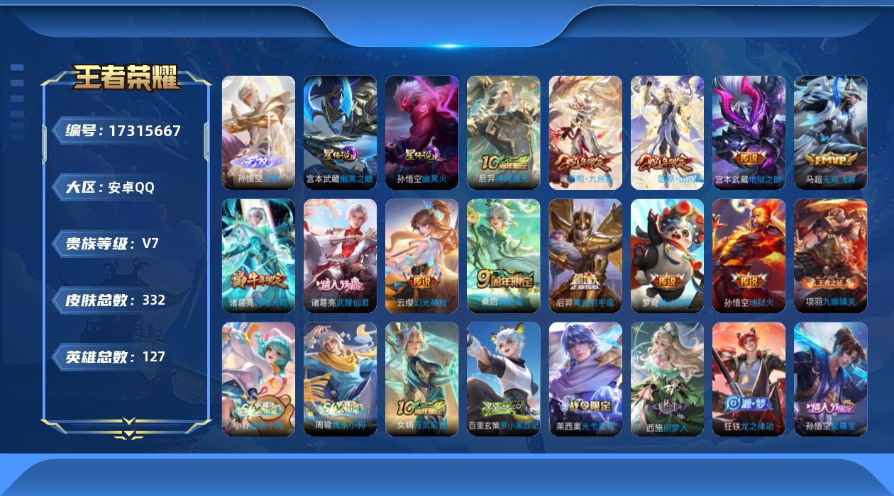 贵族等级:v7皮肤数:332传说品质12 生肖限定5 情人节限定3 无双1 英雄数:127