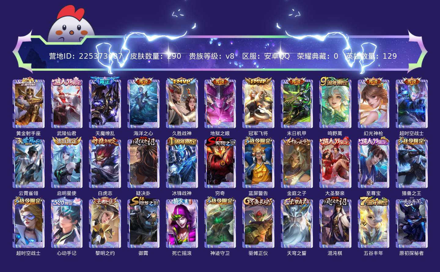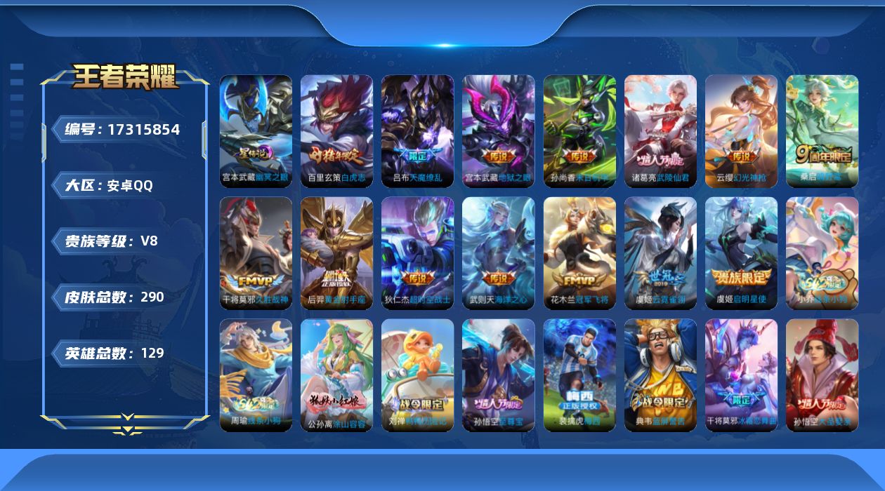 贵族等级:v8皮肤数:290传说品质14 情人节限定3 生肖限定3 英雄数:129