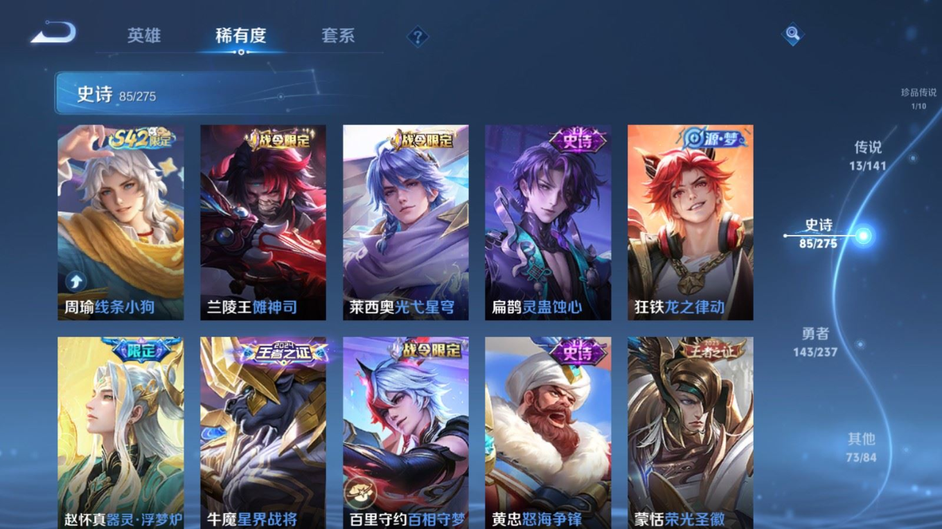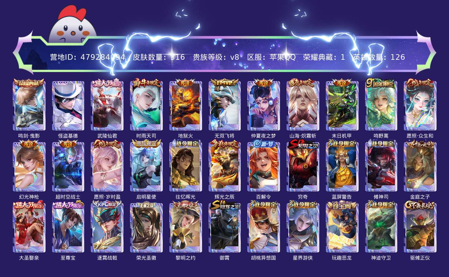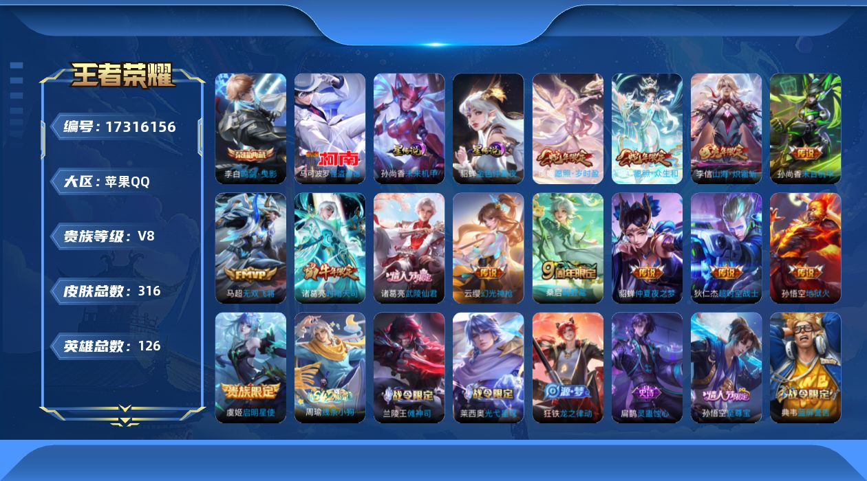 贵族等级:v8皮肤数:316生肖限定8 传说品质13 情人节限定3 珍品传说1 荣耀典藏1 英雄数:126