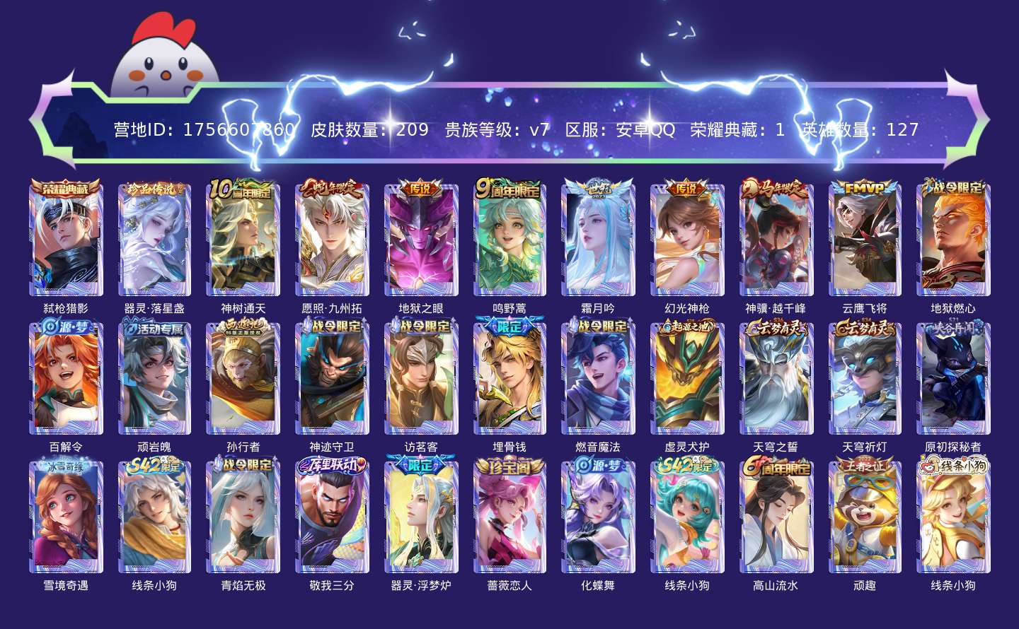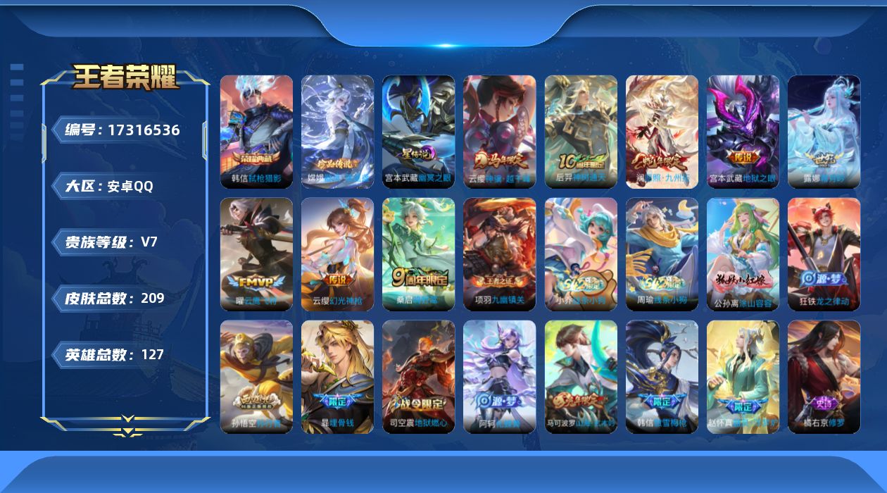 贵族等级:v7皮肤数:209传说品质8 生肖限定3 珍品传说1 荣耀典藏1 英雄数:127