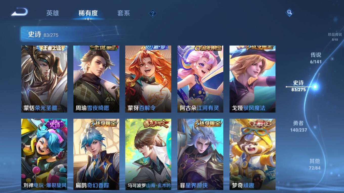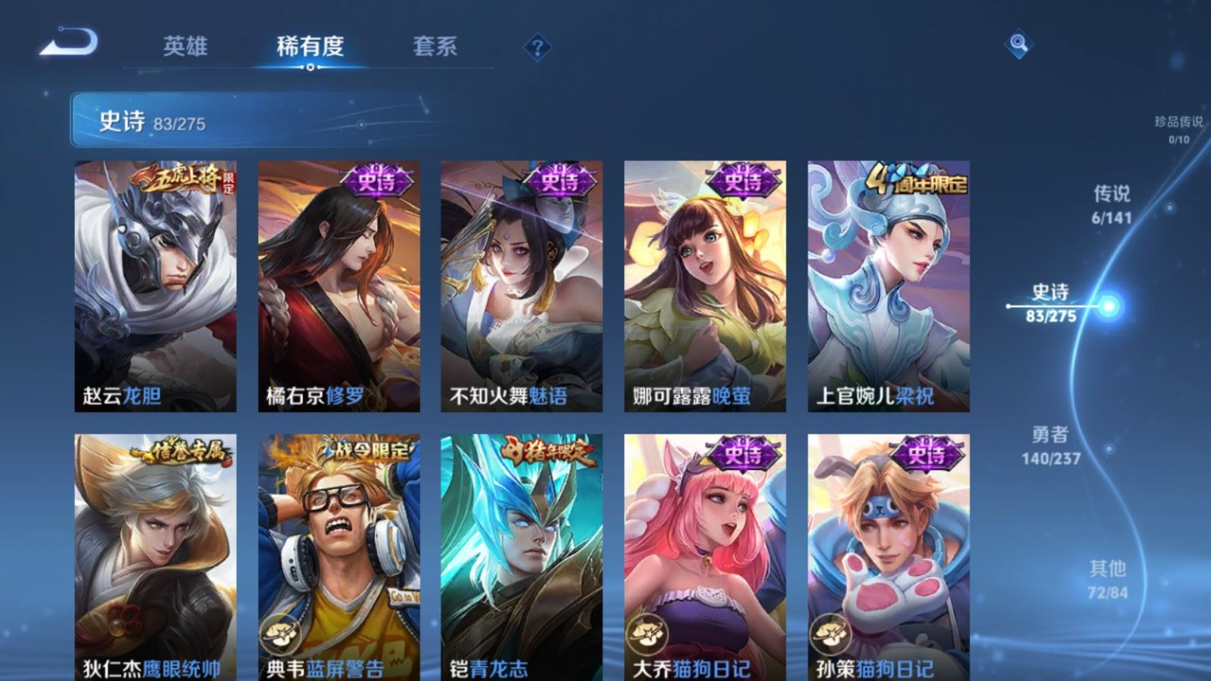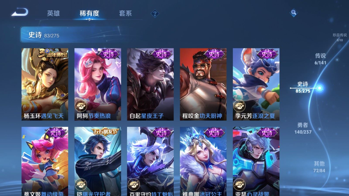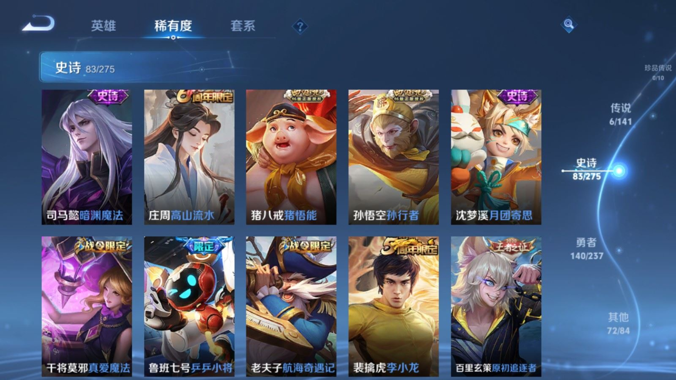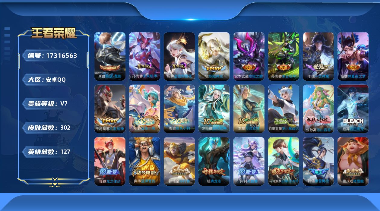 贵族等级:v7皮肤数:302生肖限定3 传说品质6 情人节限定1 荣耀典藏1 英雄数:127
