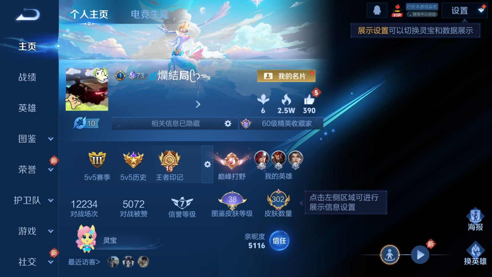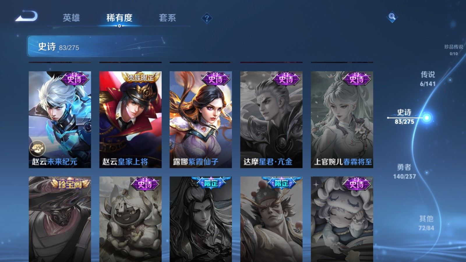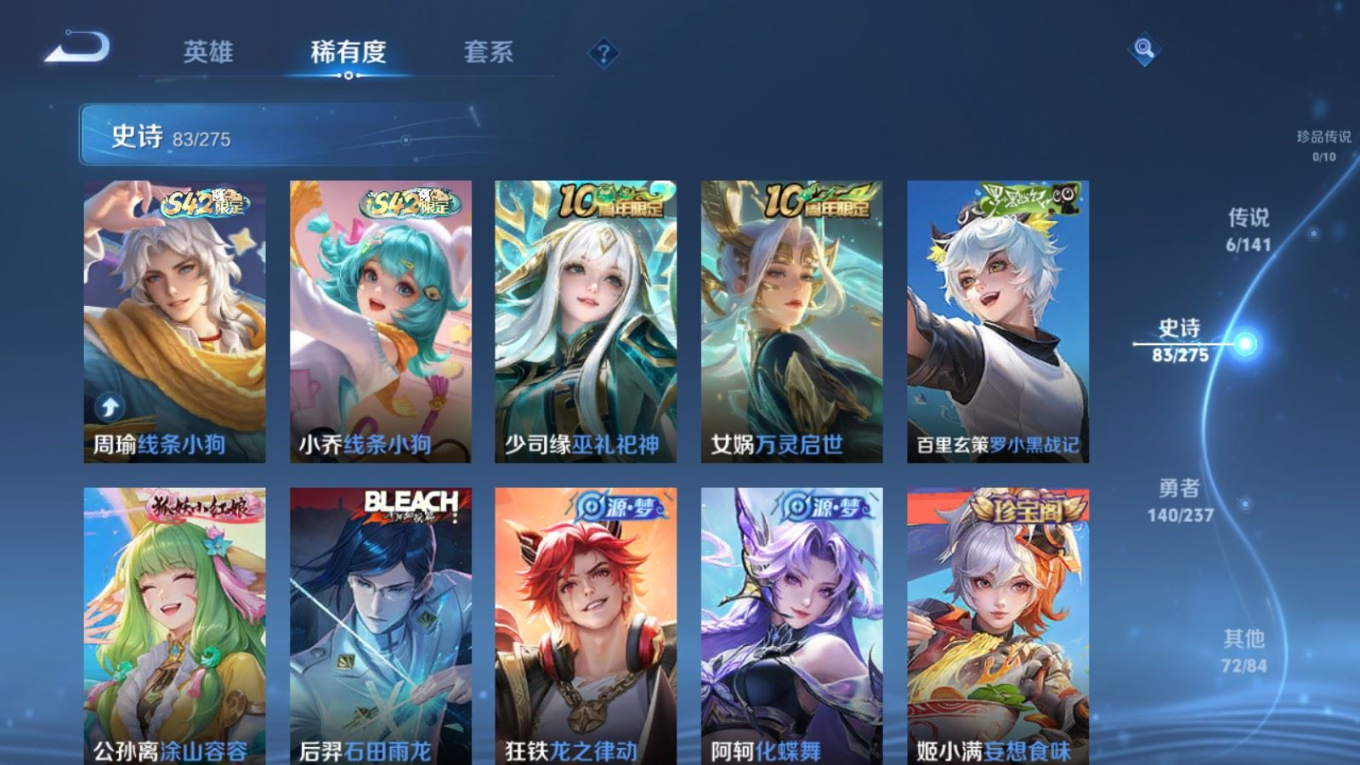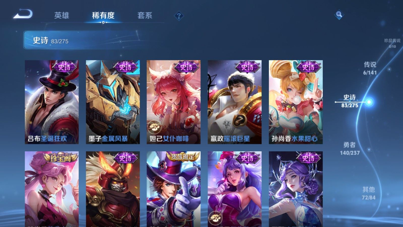 贵族等级:v7皮肤数:302生肖限定3 传说品质6 情人节限定1 荣耀典藏1 英雄数:127