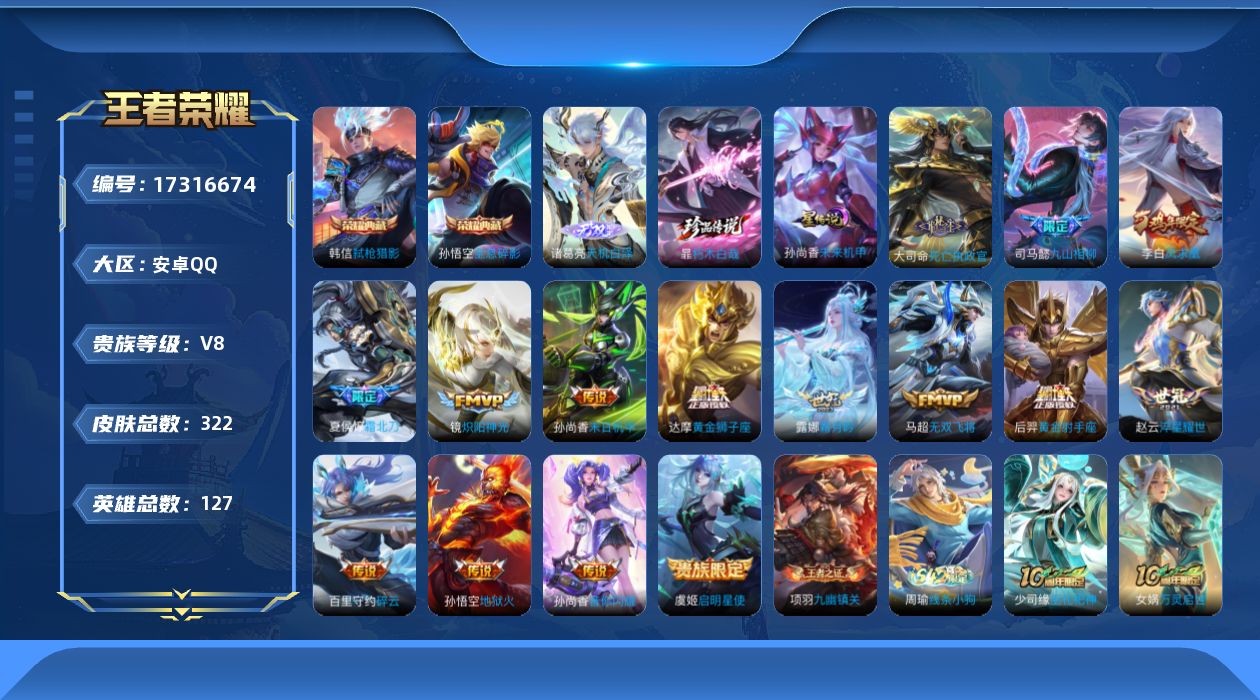 贵族等级:v8皮肤数:322传说品质15 情人节限定2 无双1 荣耀典藏2 珍品传说1 生肖限定1 英雄数:127