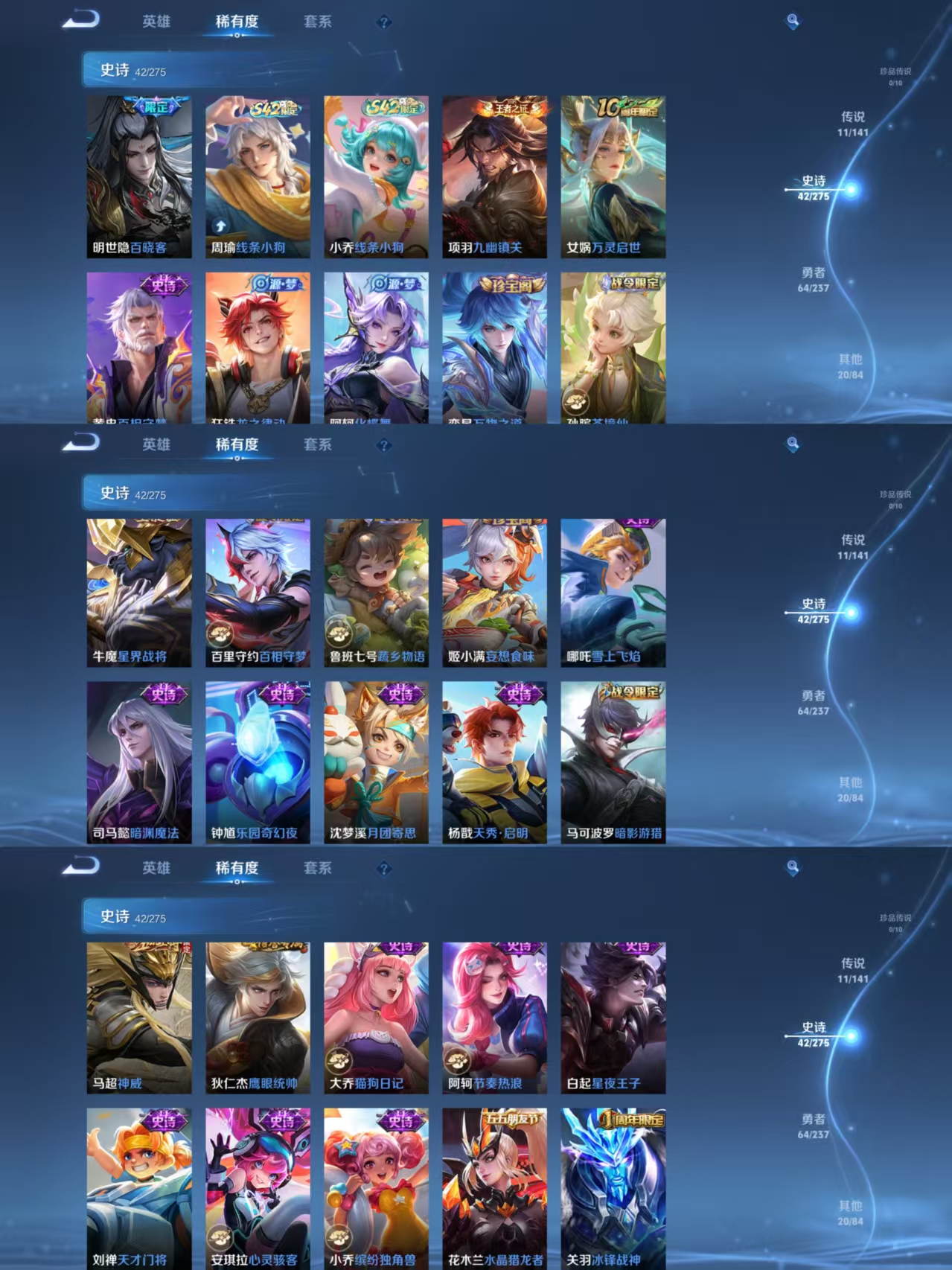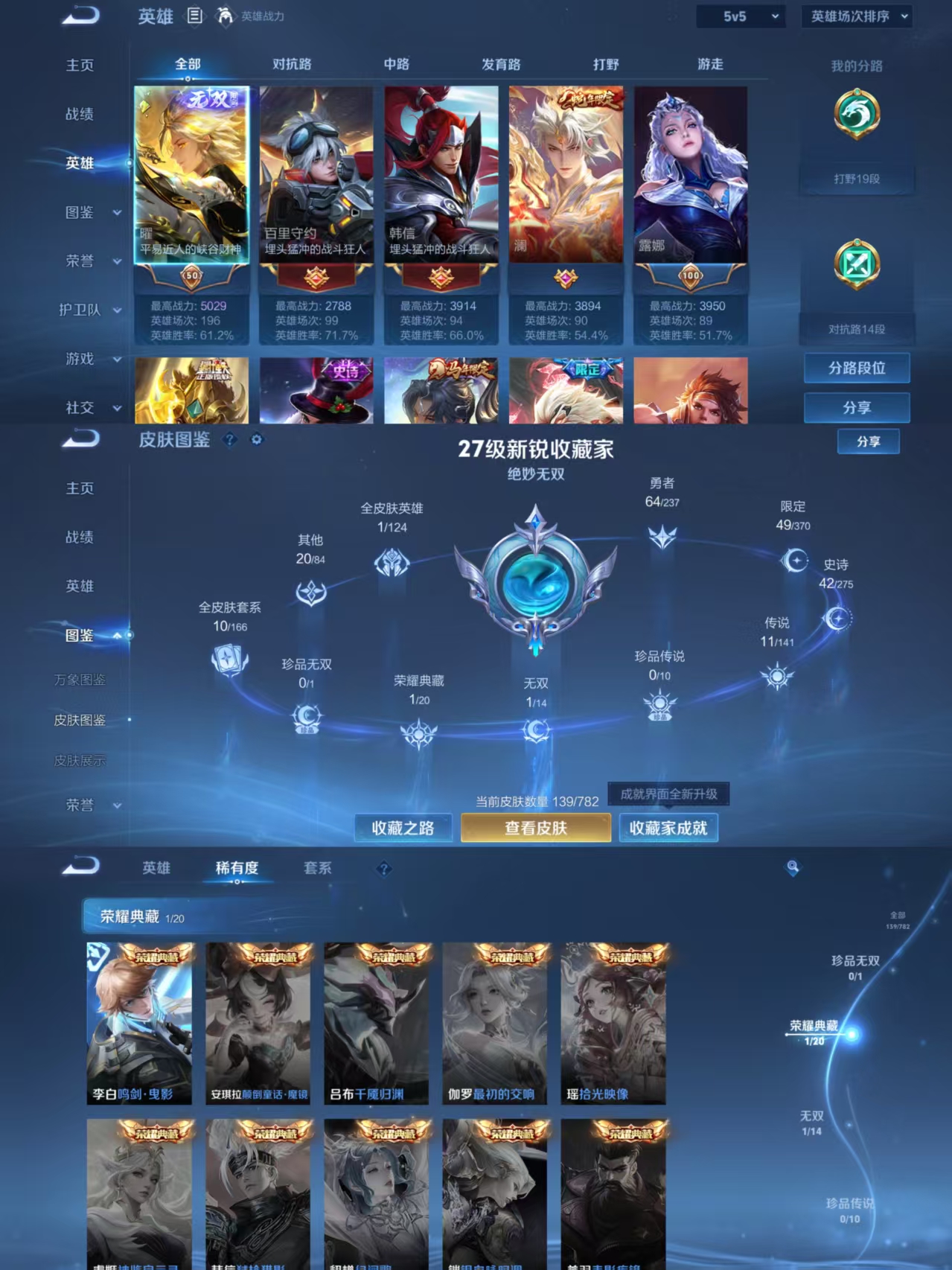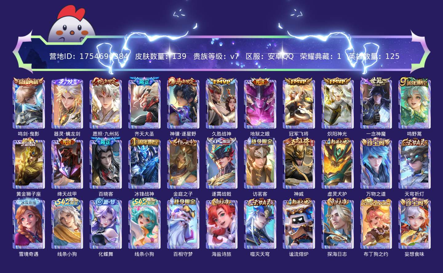 贵族等级:v7皮肤数:139传说品质11 生肖限定2 荣耀典藏1 无双1 英雄数:125