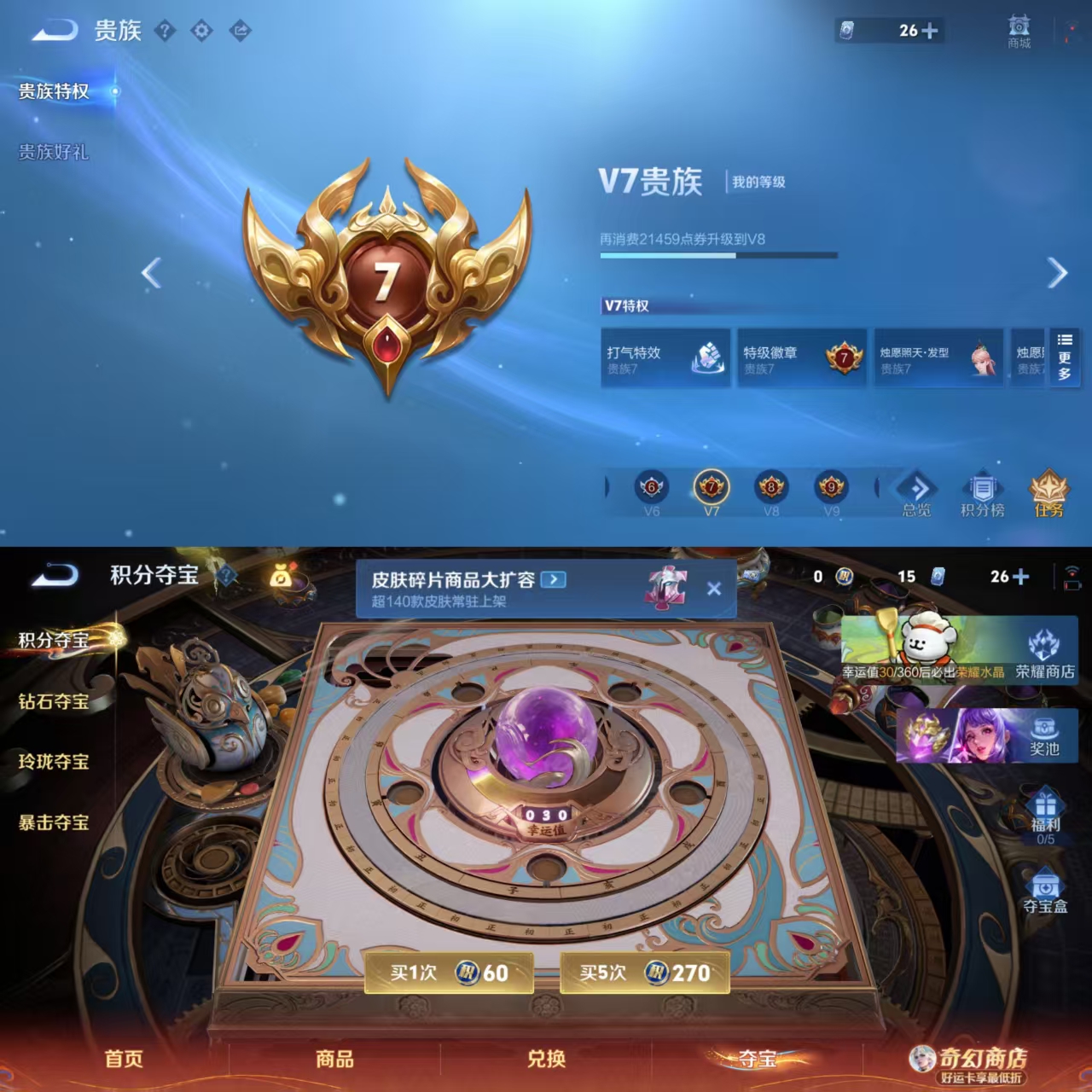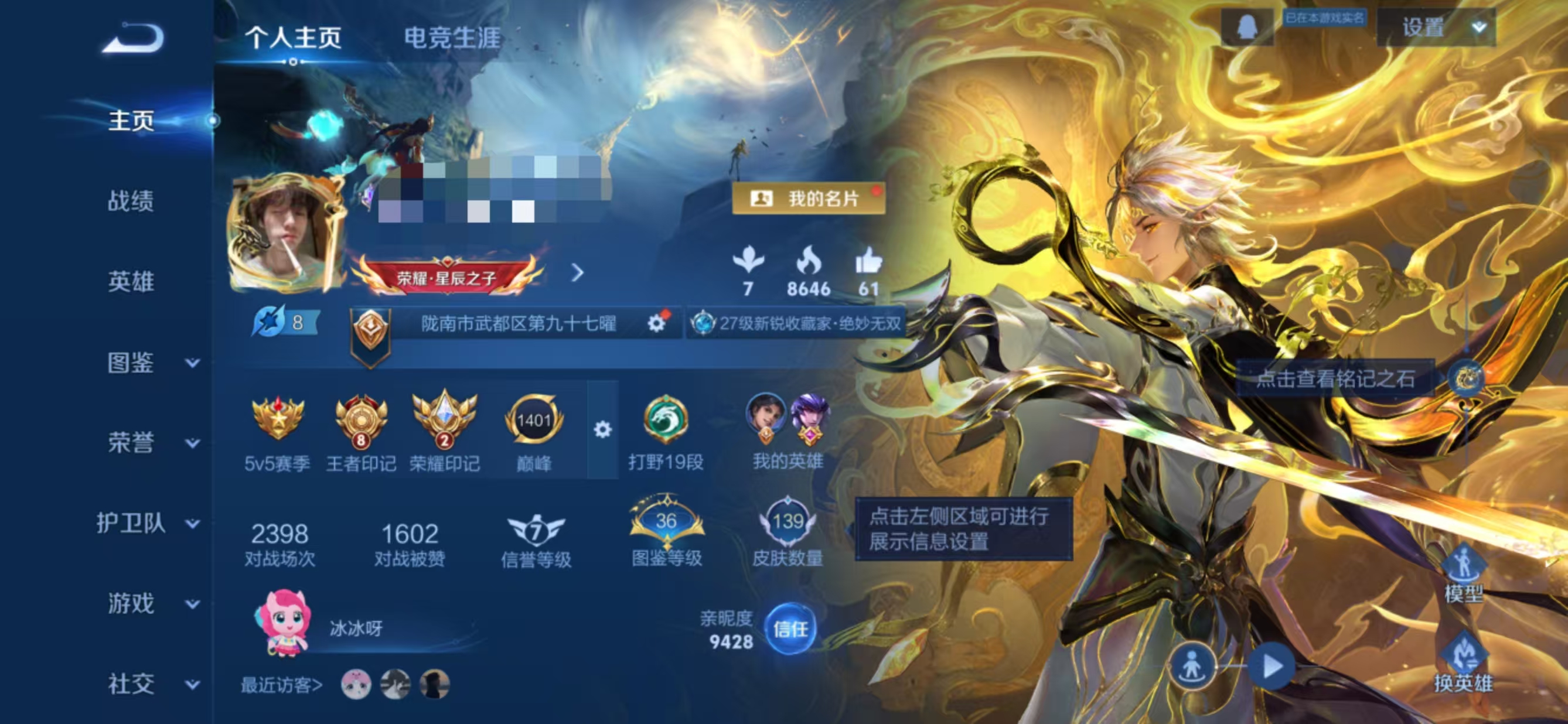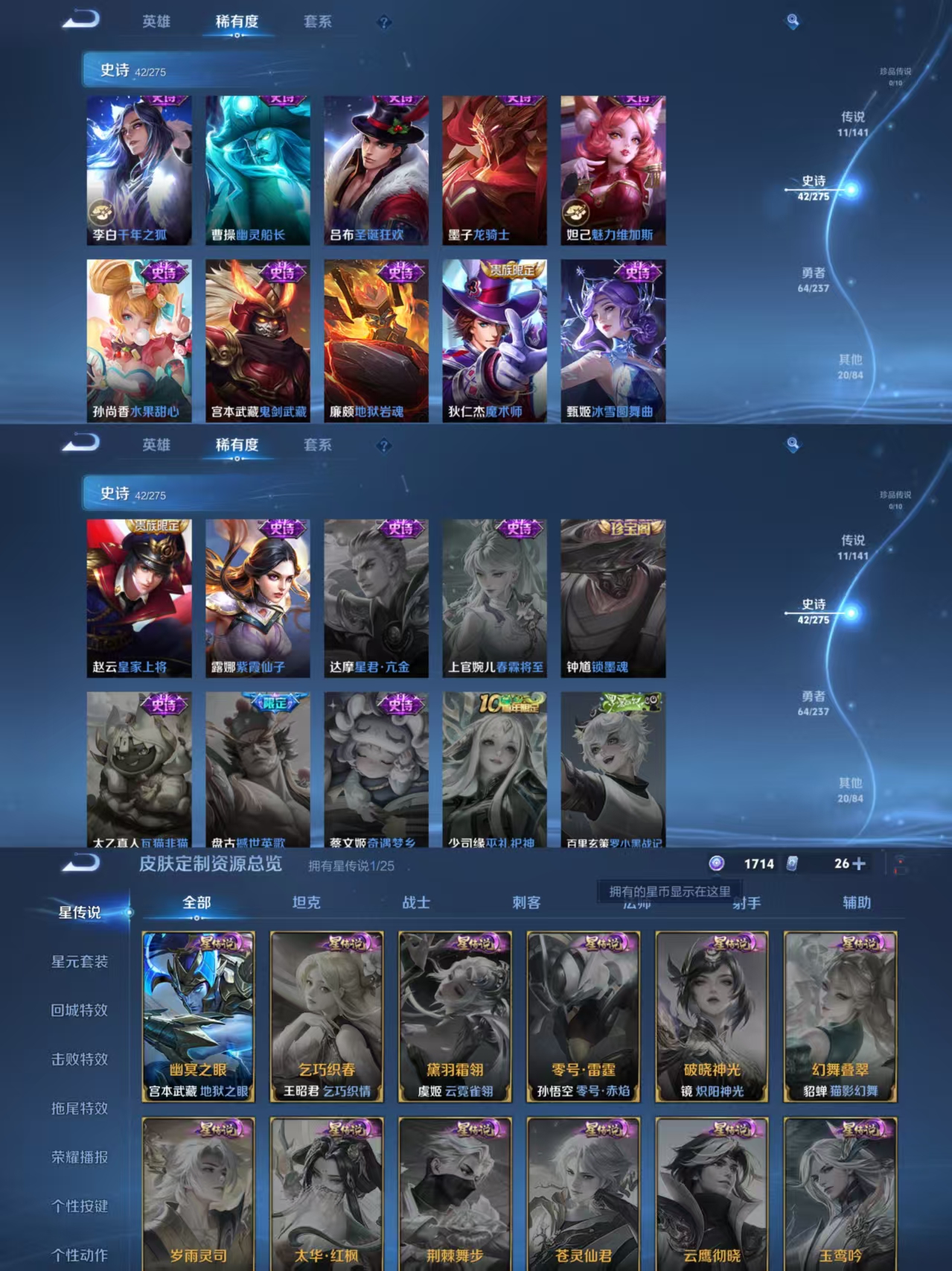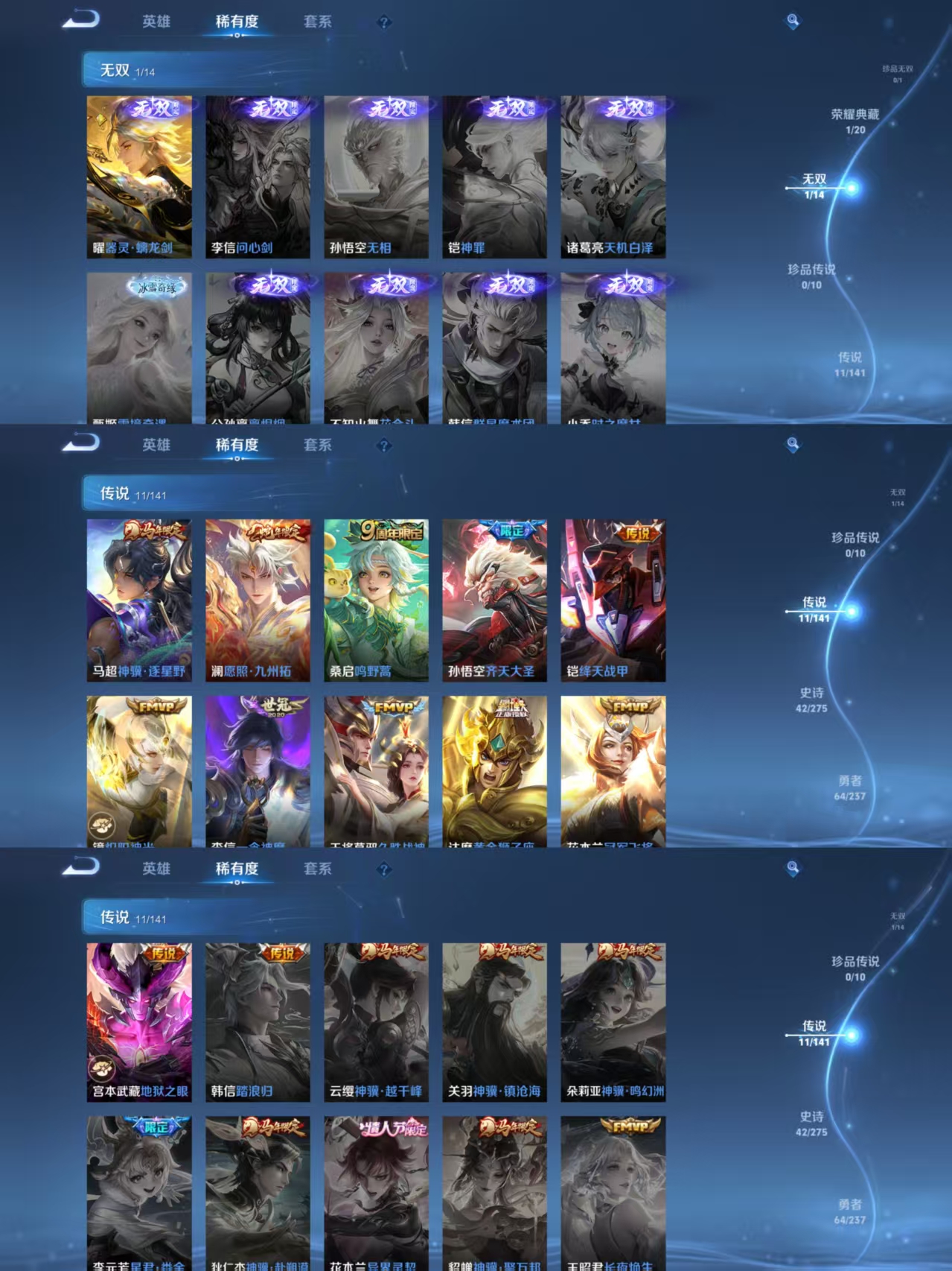 贵族等级:v7皮肤数:139传说品质11 生肖限定2 荣耀典藏1 无双1 英雄数:125