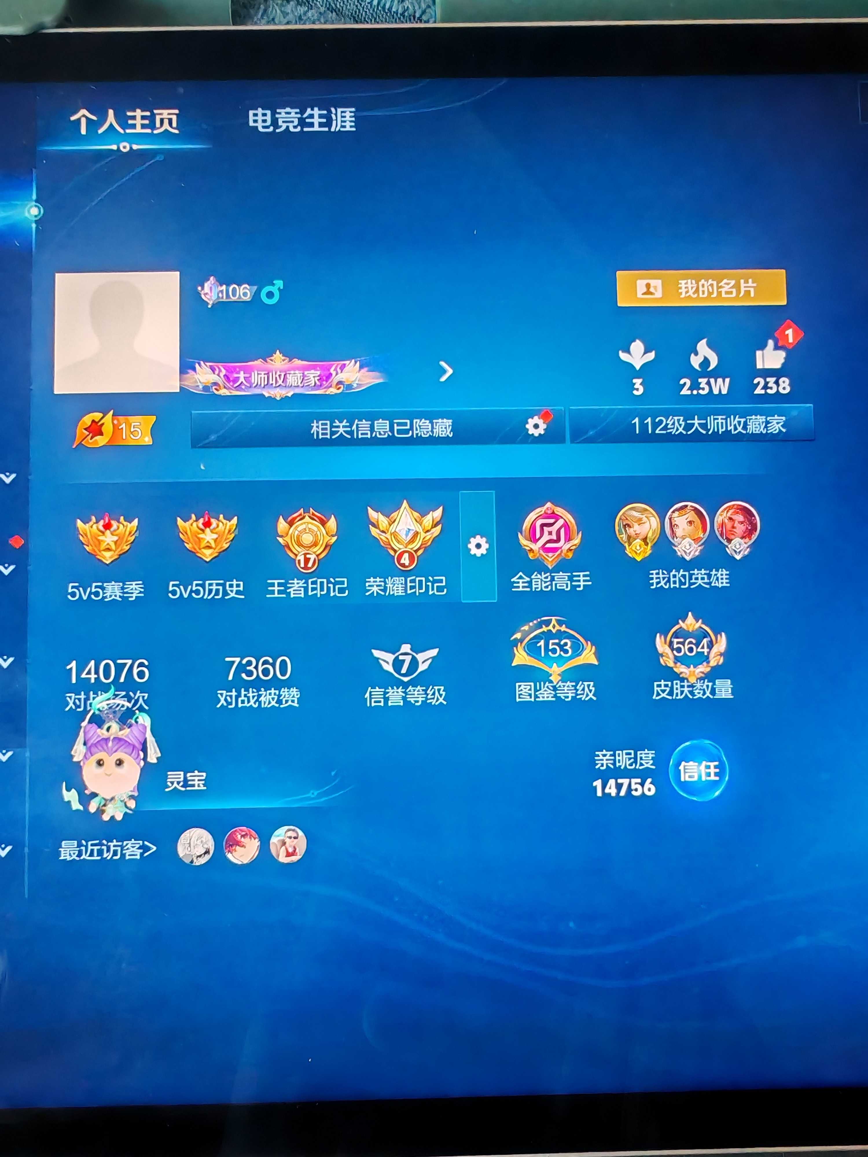 贵族等级:v10皮肤数:564传说品质86 生肖限定28 情人节限定11 荣耀典藏10 珍品传说3 无双2 英雄数:129