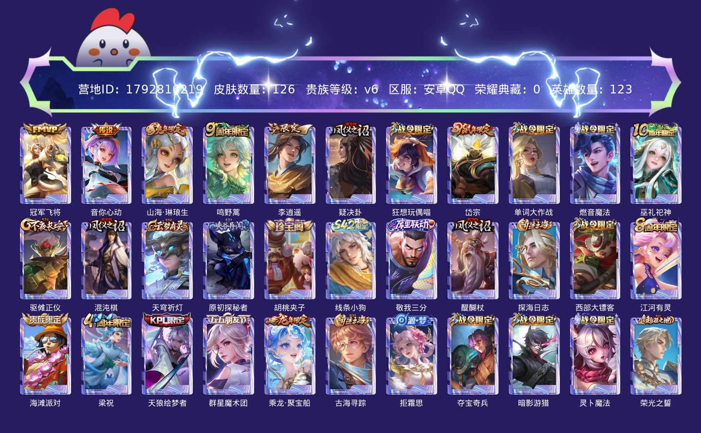贵族等级:v6皮肤数:126生肖限定3 传说品质5 英雄数:123