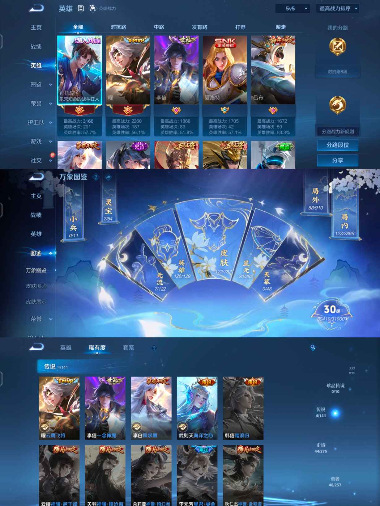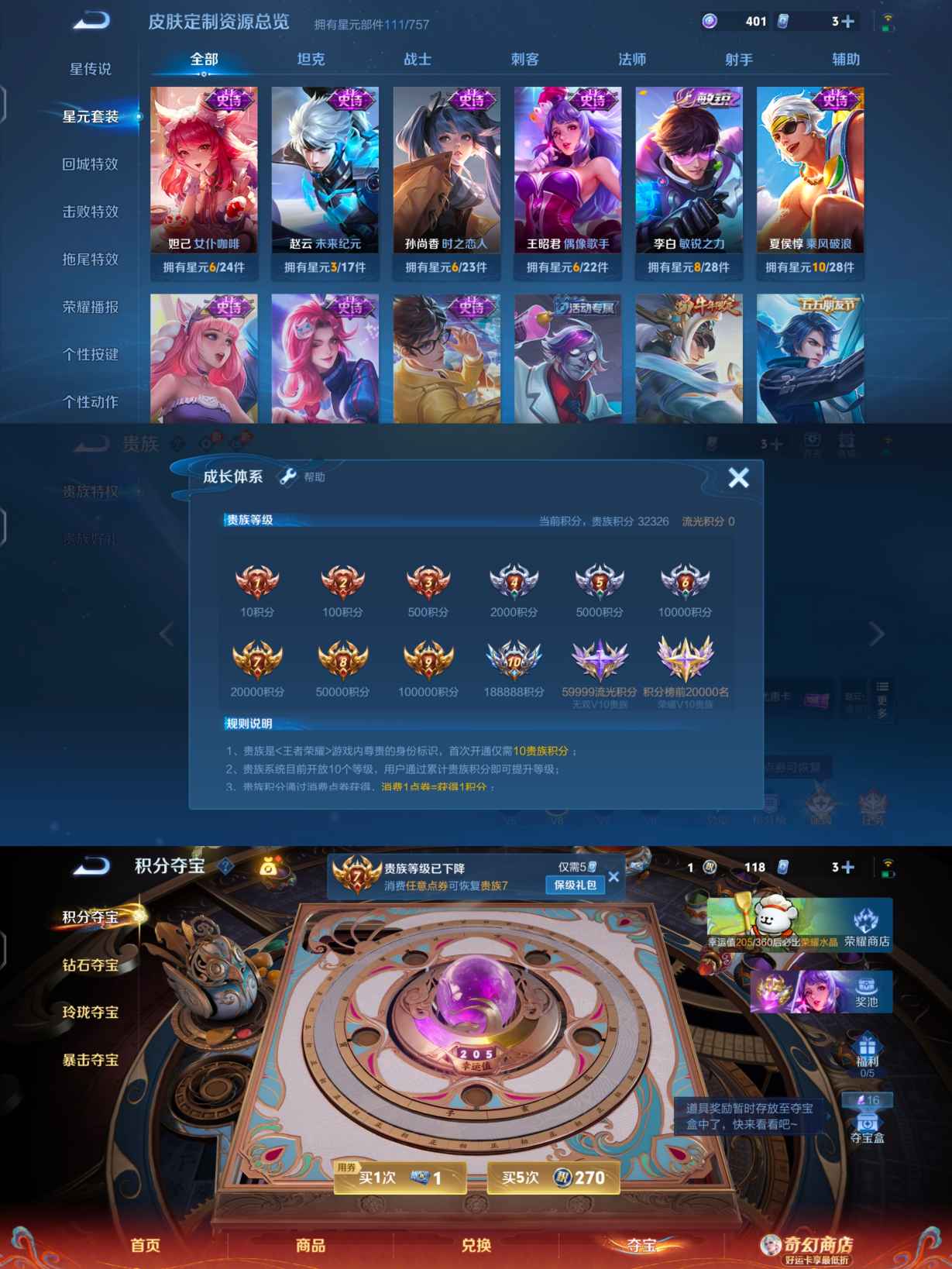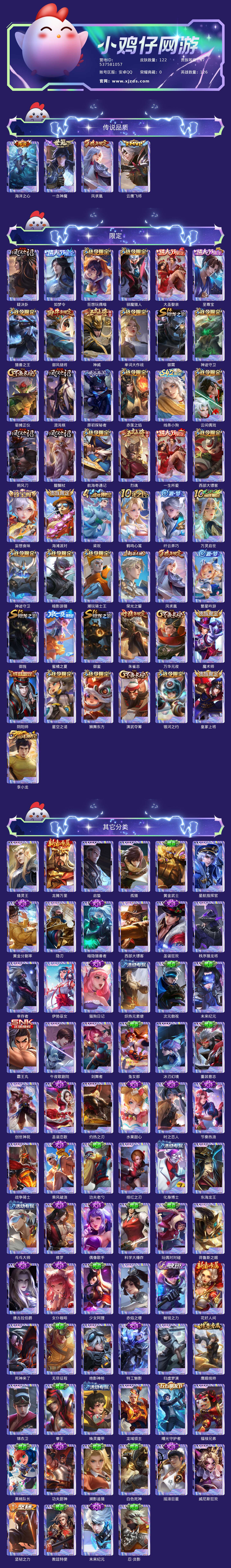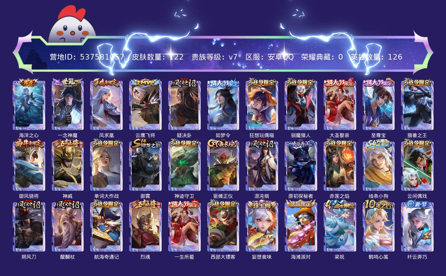 贵族等级:v7皮肤数:122情人节限定4 生肖限定3 传说品质4 英雄数:126