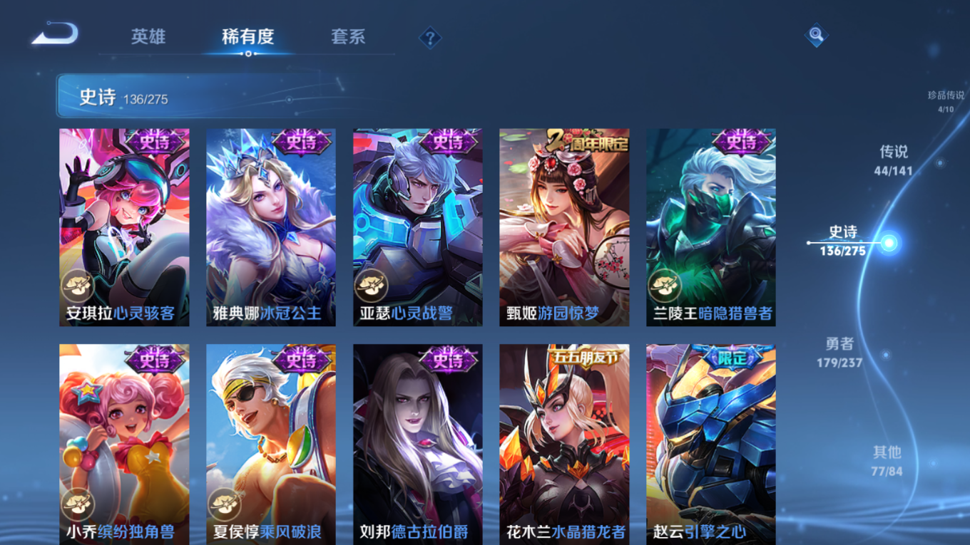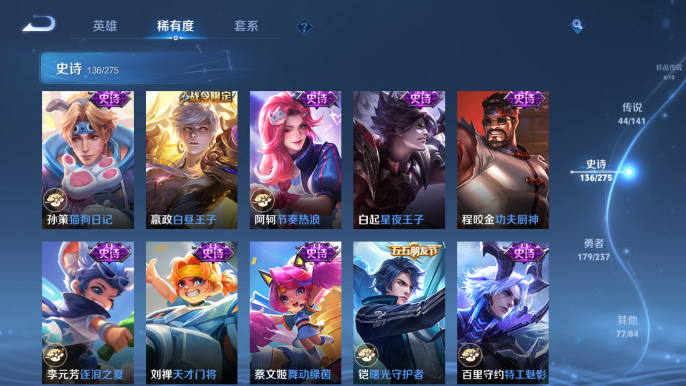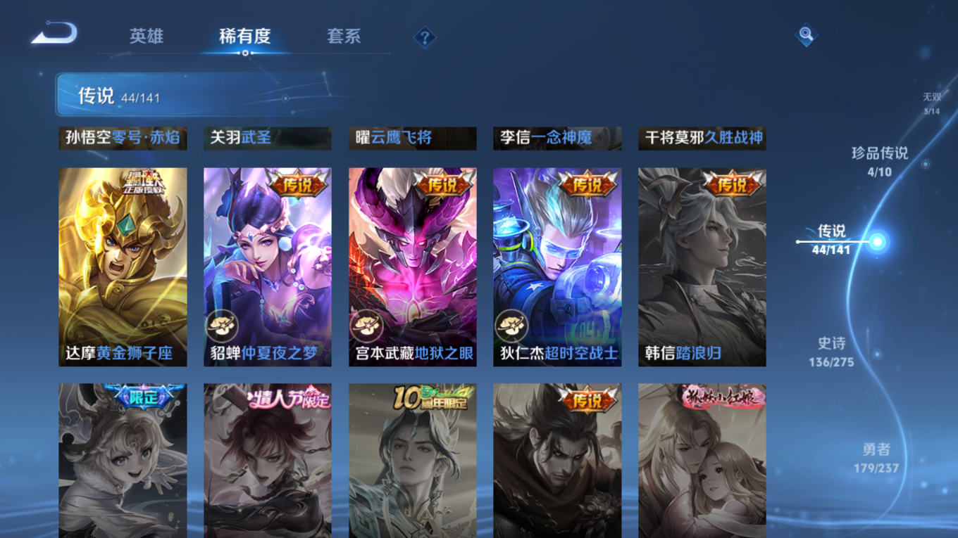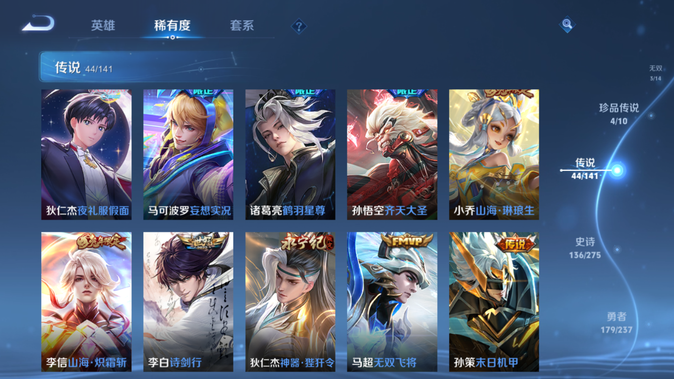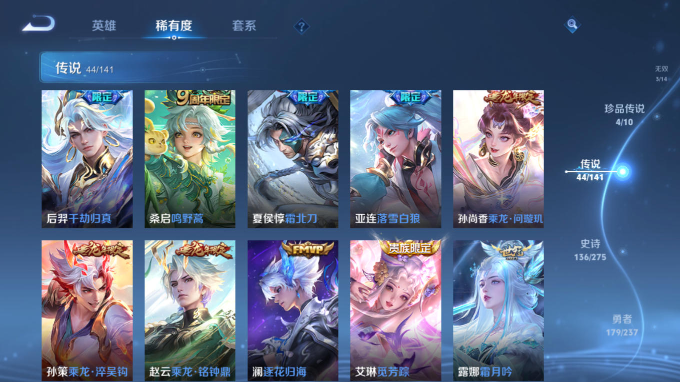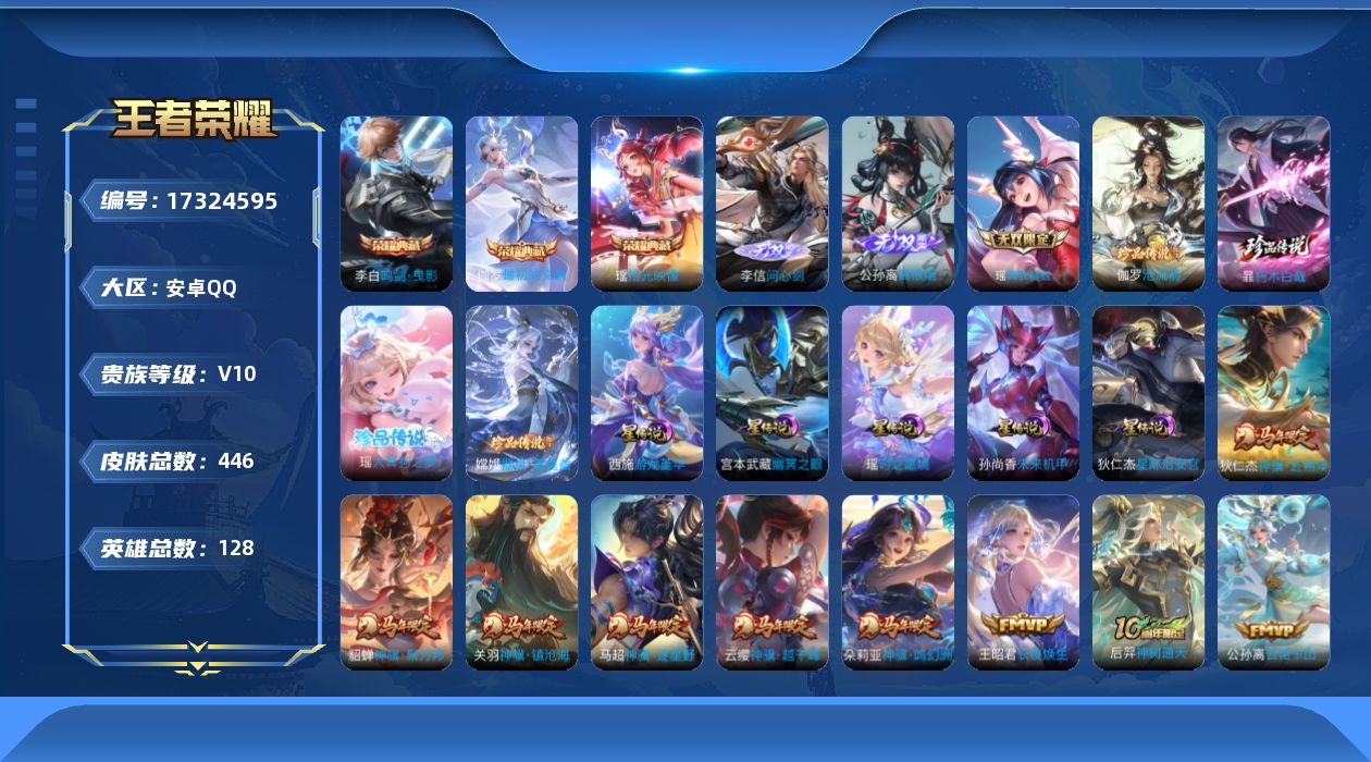 贵族等级:v10皮肤数:446传说品质44 生肖限定18 珍品传说4 情人节限定2 无双3 荣耀典藏3 英雄数:128