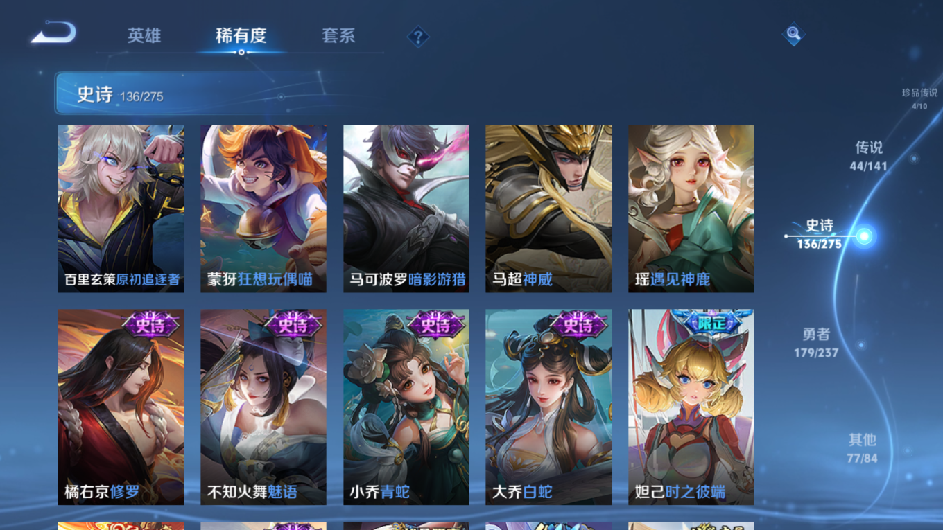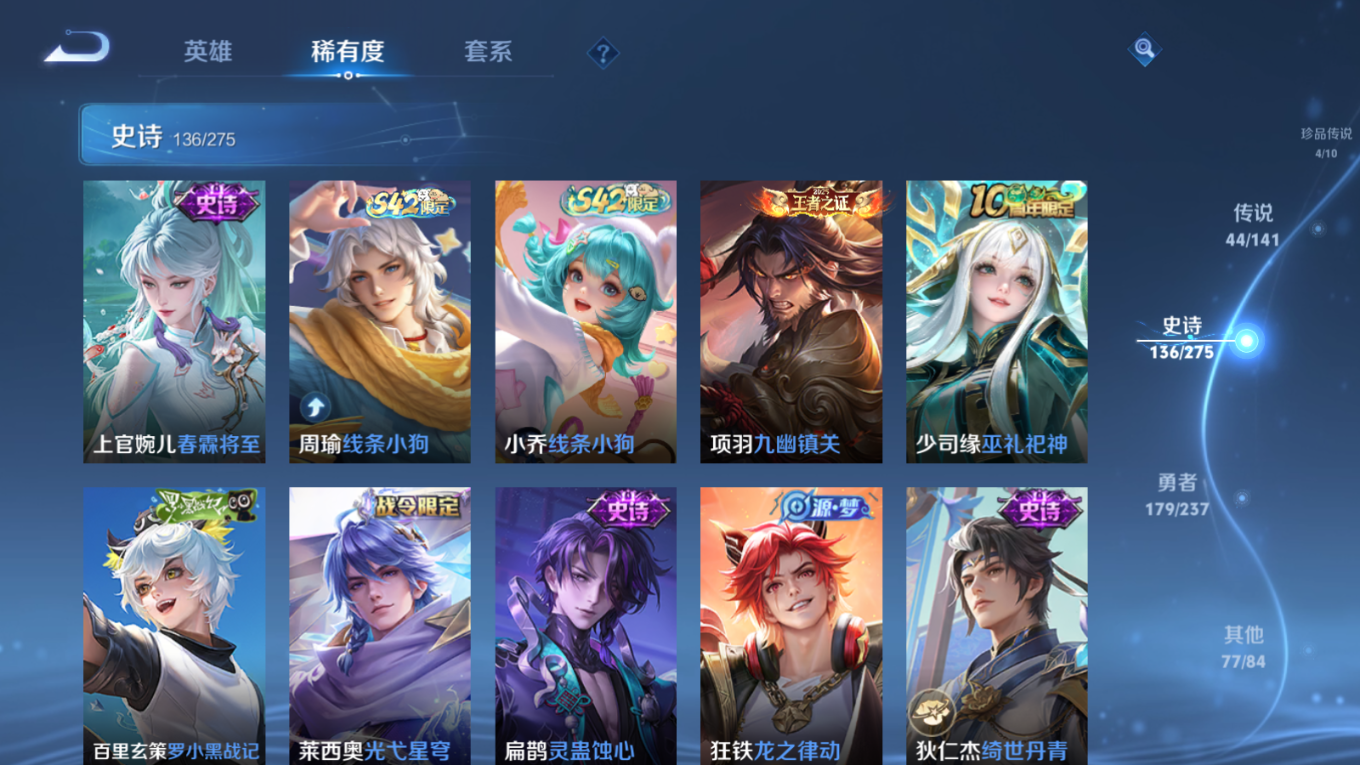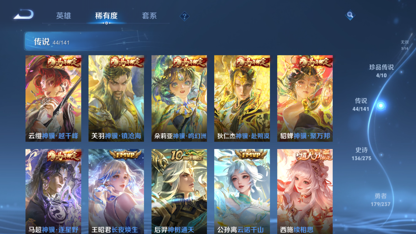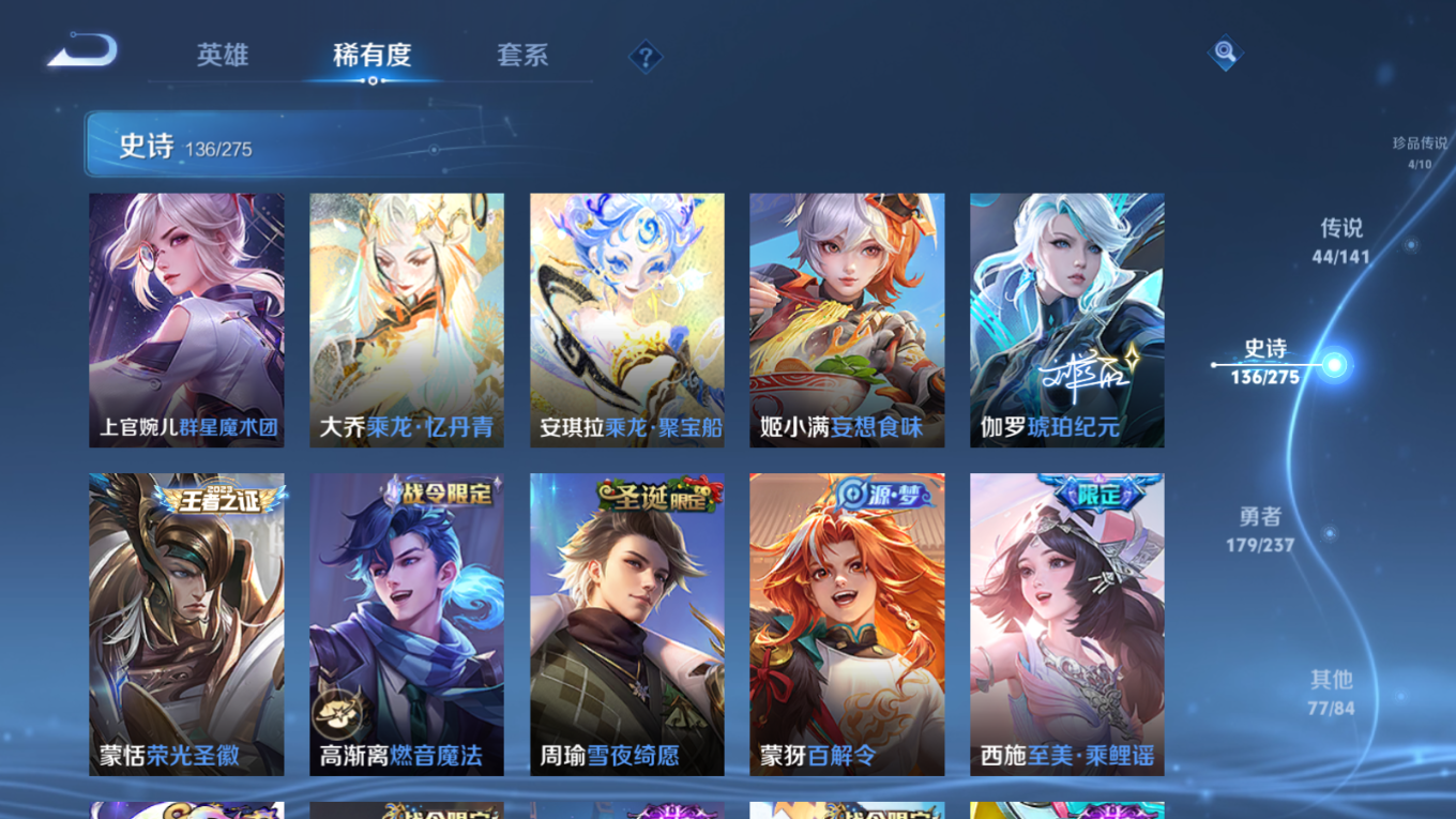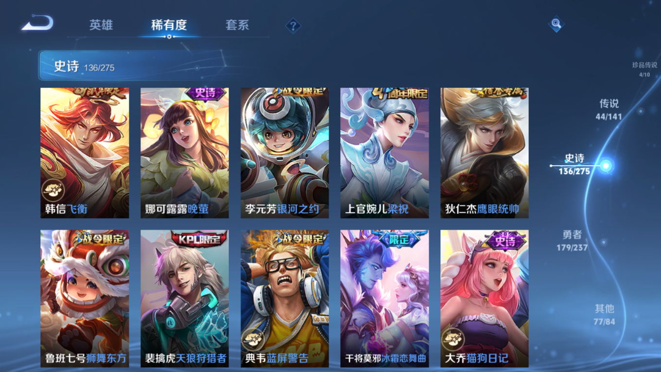 贵族等级:v10皮肤数:446传说品质44 生肖限定18 珍品传说4 情人节限定2 无双3 荣耀典藏3 英雄数:128