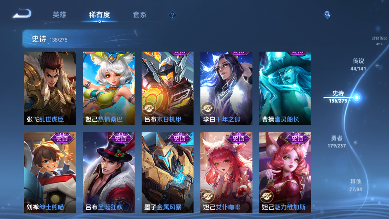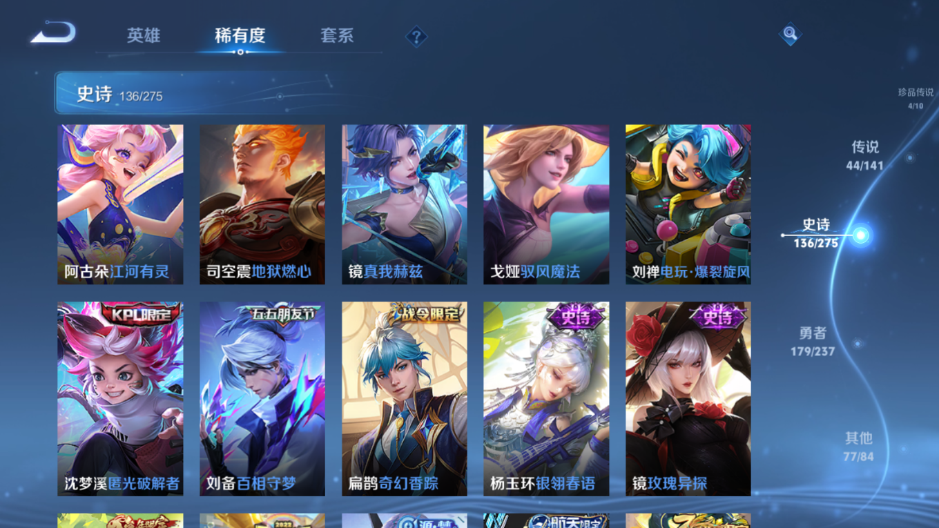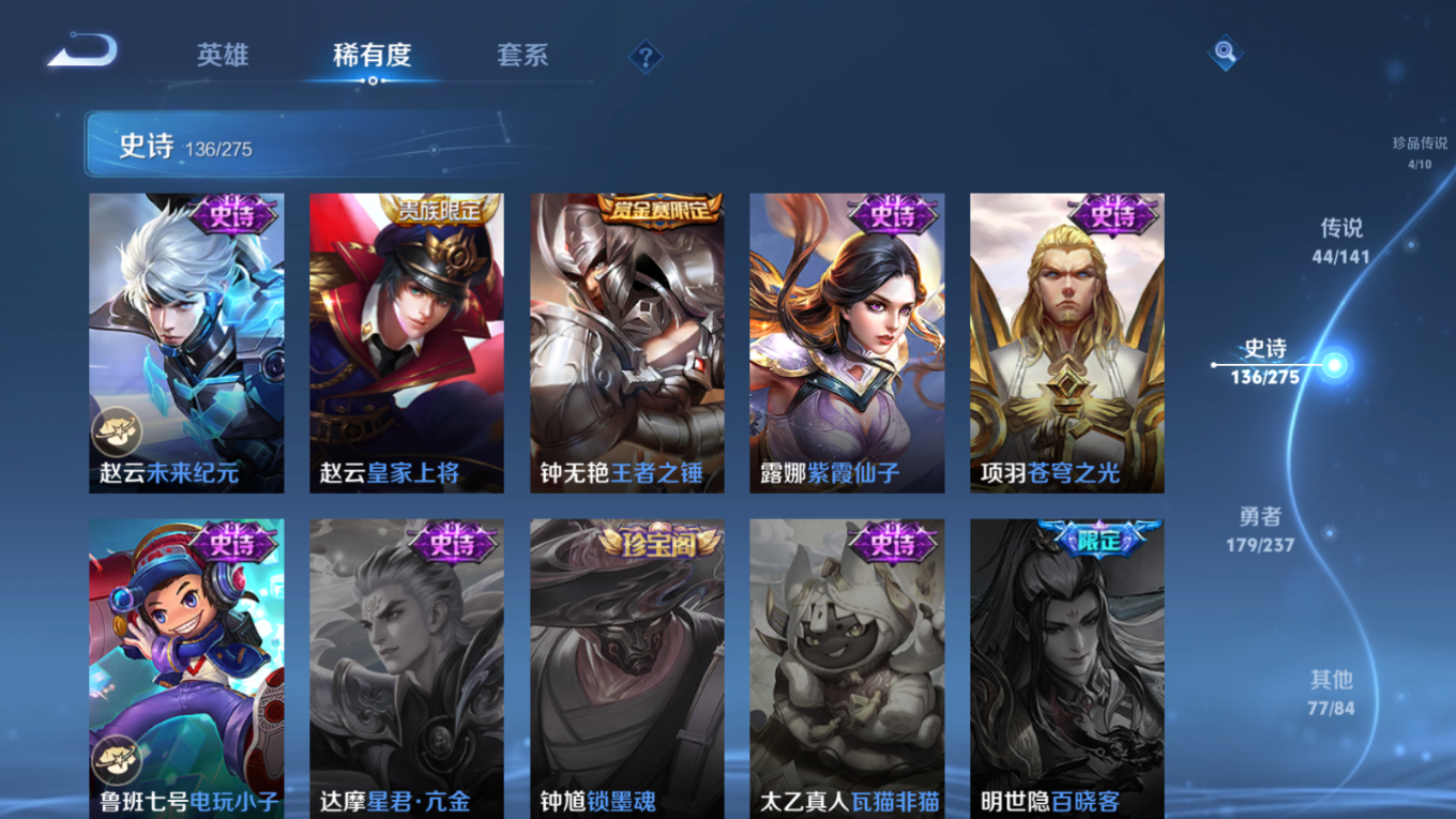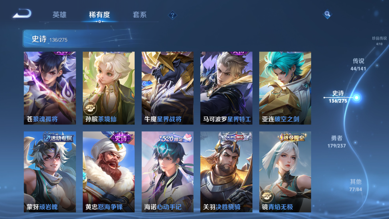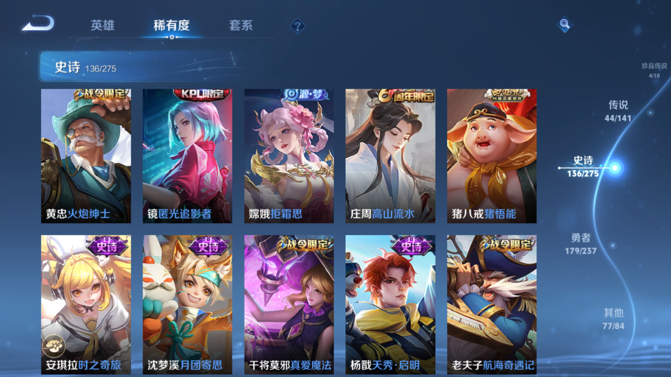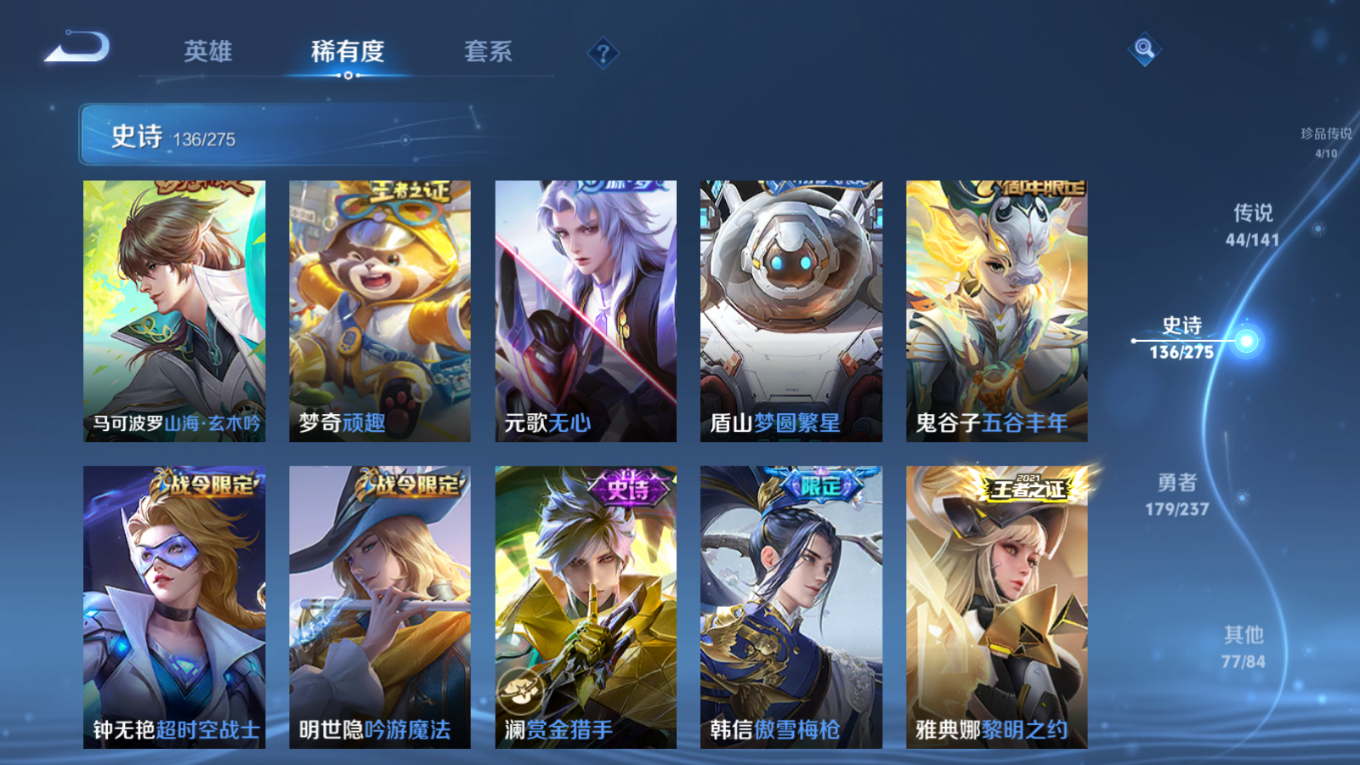 贵族等级:v10皮肤数:446传说品质44 生肖限定18 珍品传说4 情人节限定2 无双3 荣耀典藏3 英雄数:128
