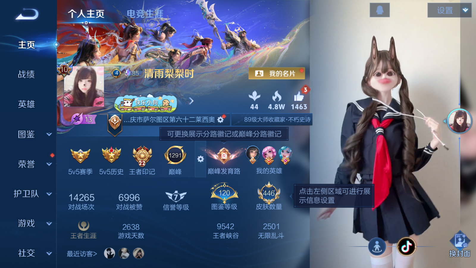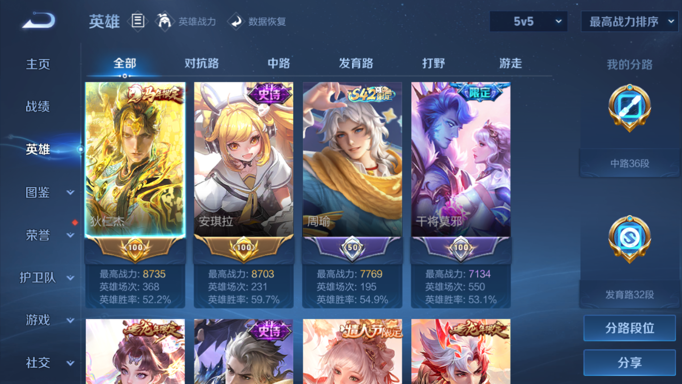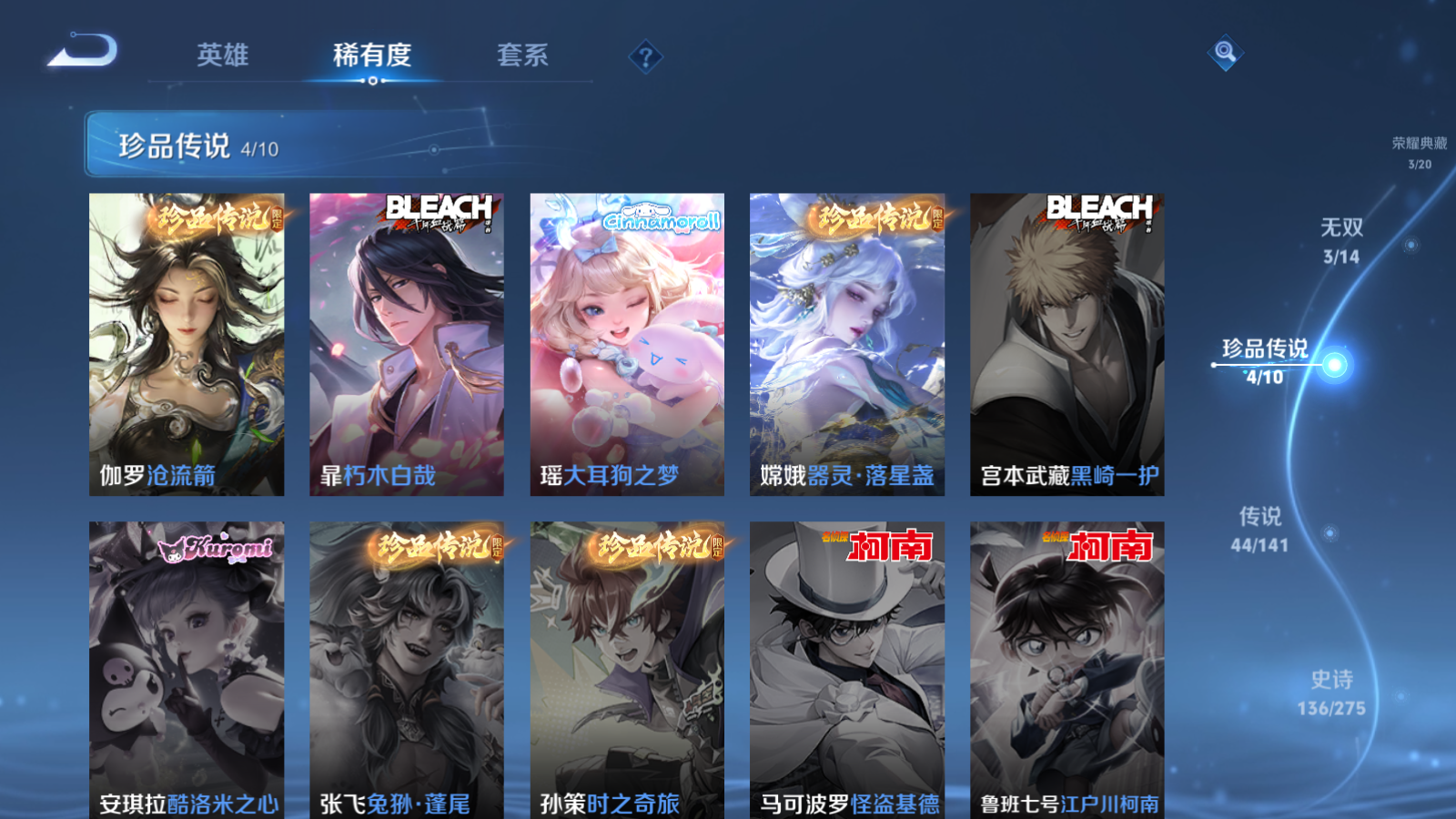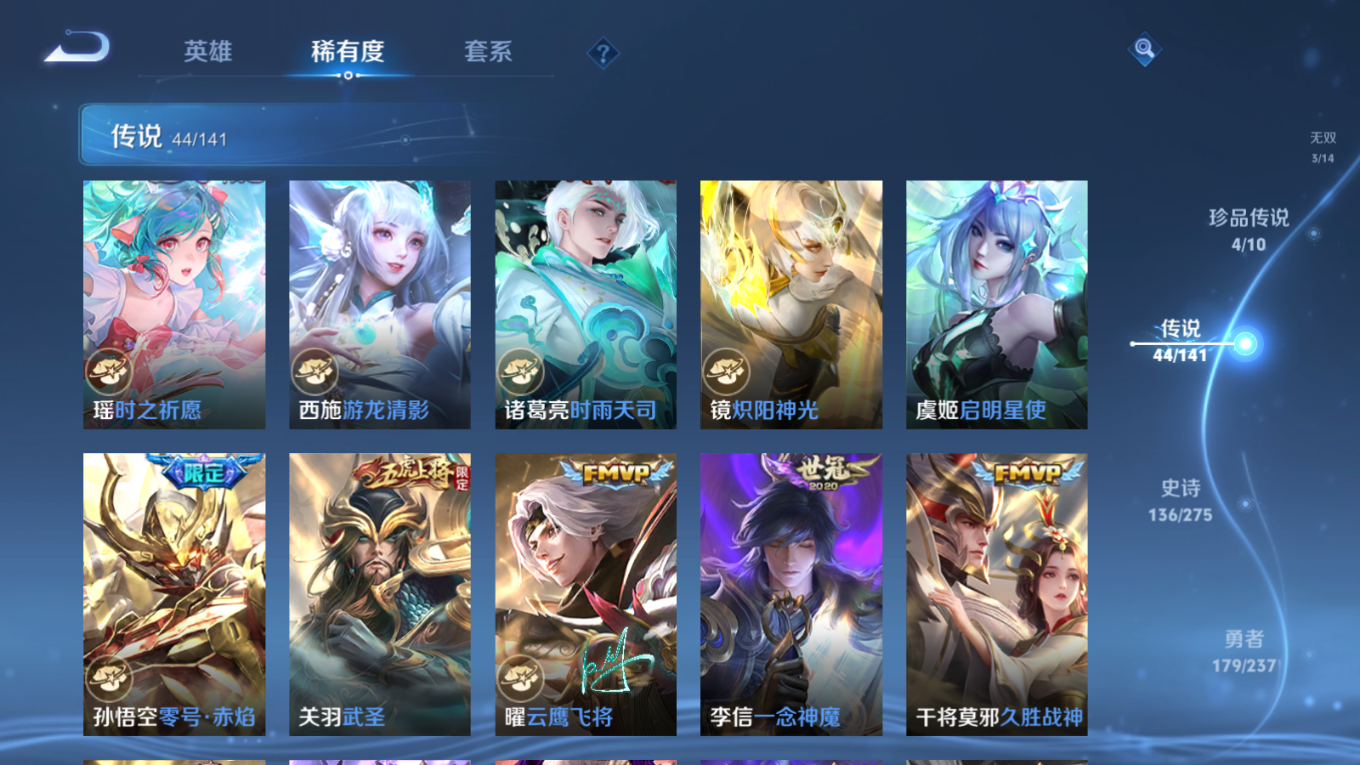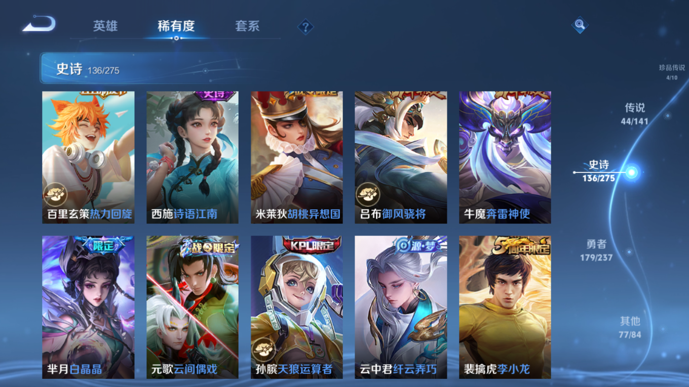 贵族等级:v10皮肤数:446传说品质44 生肖限定18 珍品传说4 情人节限定2 无双3 荣耀典藏3 英雄数:128