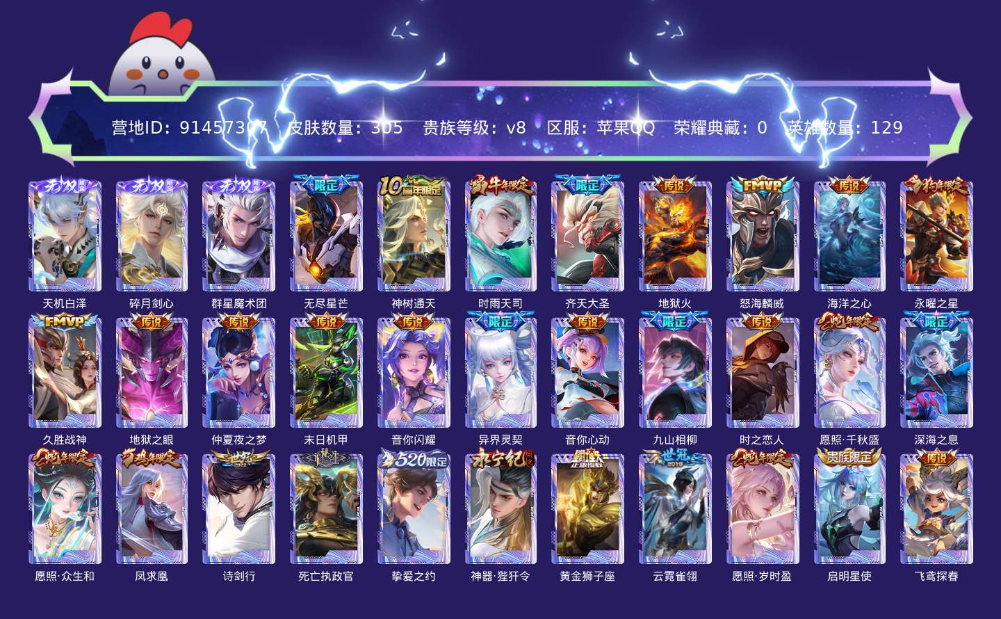 传说品质_后羿_无尽星芒传说品质_后羿_神树通天传说品质_诸葛亮_时雨天司传说品质_孙悟空_齐天大圣传说品质_孙悟空_地狱火传说品质_吕布_怒海麟威传说品质_武则天_海洋之心传说品质_杨戬_永曜之星传说品质_干将莫邪_久胜战神传说品质_宫本武藏_地狱之眼传说品质_貂蝉_仲夏夜之梦传说品质_孙尚香_末日机甲传说品质_孙尚香_音你闪耀传说品质_孙尚香_异界灵契传说品质_小乔_音你心动传说品质_司马懿_九山相柳传说品质_刘备_时之恋人传说品质_女娲_愿照·千秋盛传说品质_马可波罗_深海之息传说品质_妲己_愿照·众生和传说品质_李白_凤求凰传说品质_李白_诗剑行传说品质_大司命_死亡执政官传说品质_孙策_挚爱之约传说品质_狄仁杰_神器·狴犴令传说品质_达摩_黄金狮子座传说品质_虞姬_云霓雀翎传说品质_虞姬_愿照·岁时盈传说品质_虞姬_启明星使传说品质_李元芳_飞鸢探春