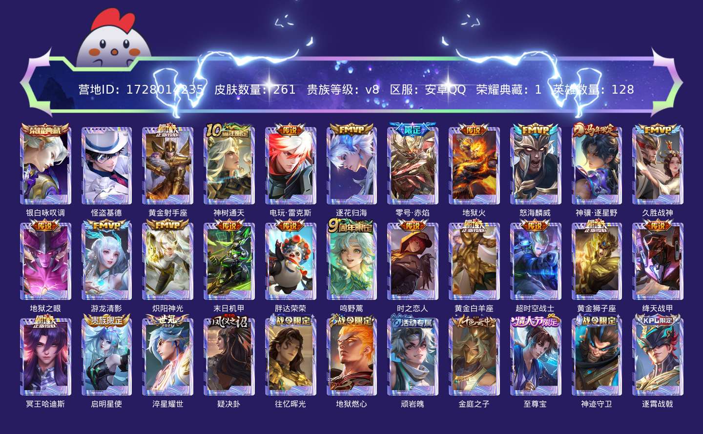 贵族等级:v8皮肤数:261传说品质23 情人节限定1 生肖限定1 珍品传说1 荣耀典藏1 英雄数:128