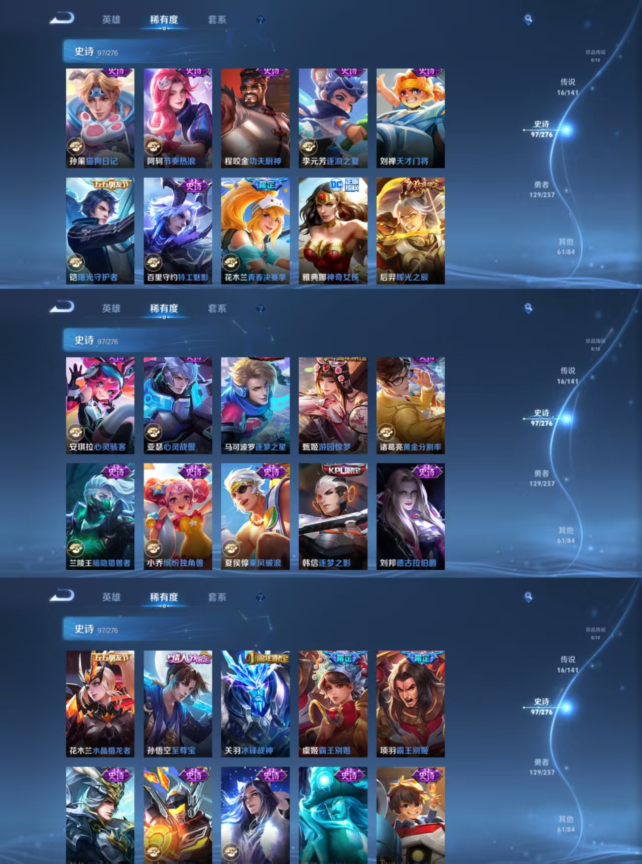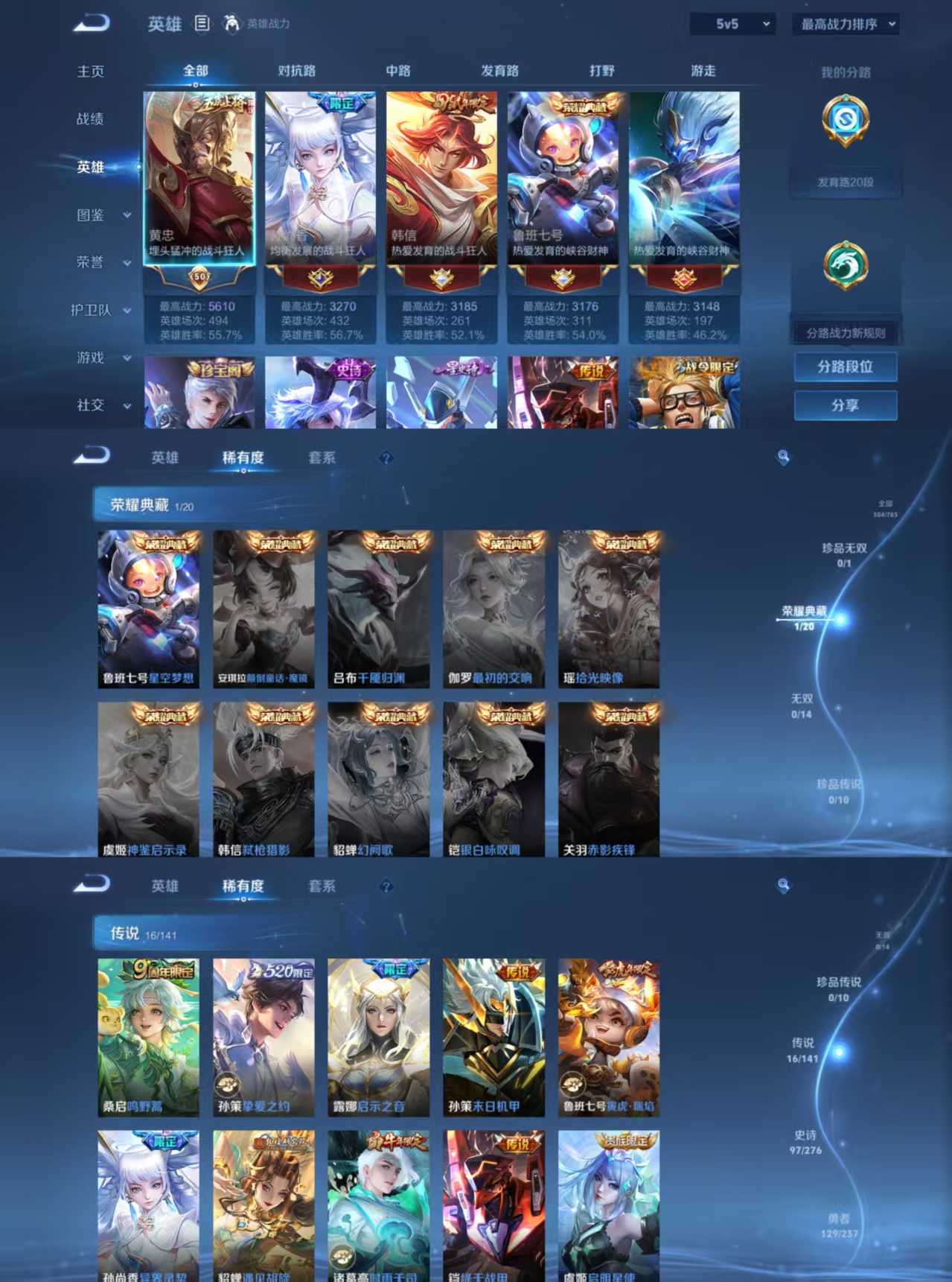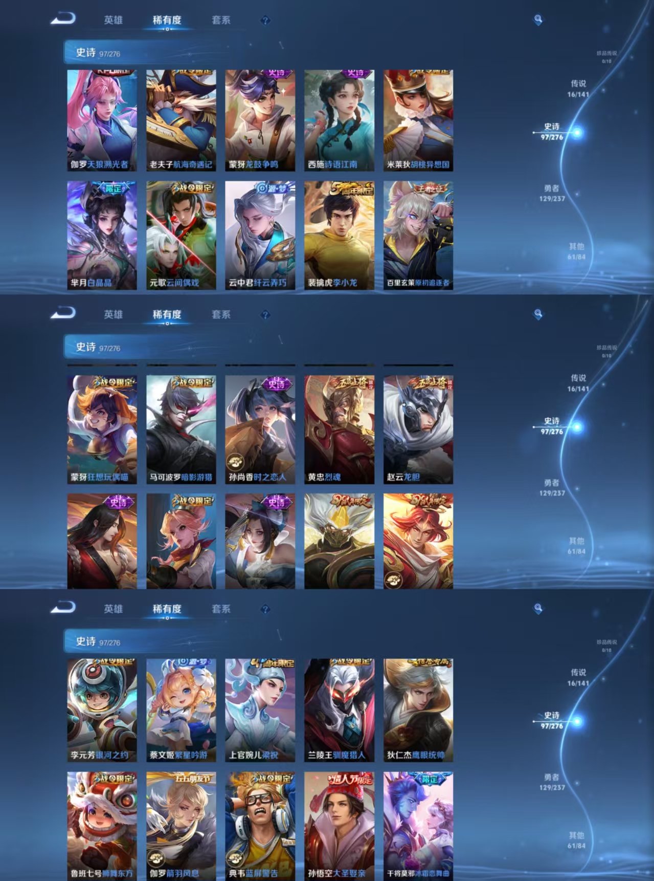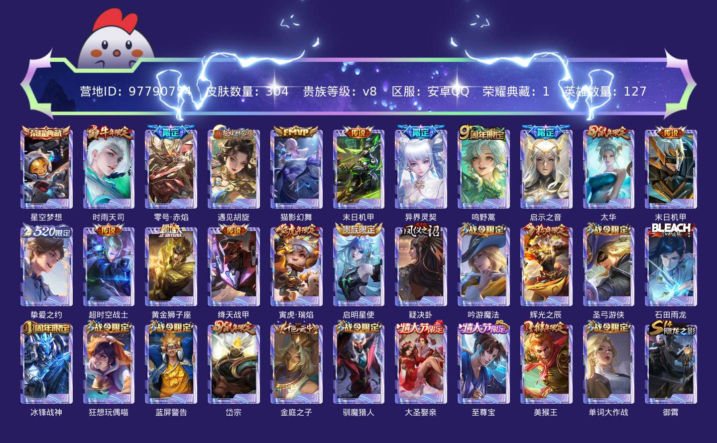 贵族等级:v8皮肤数:304生肖限定7 传说品质16 情人节限定2 荣耀典藏1 英雄数:127