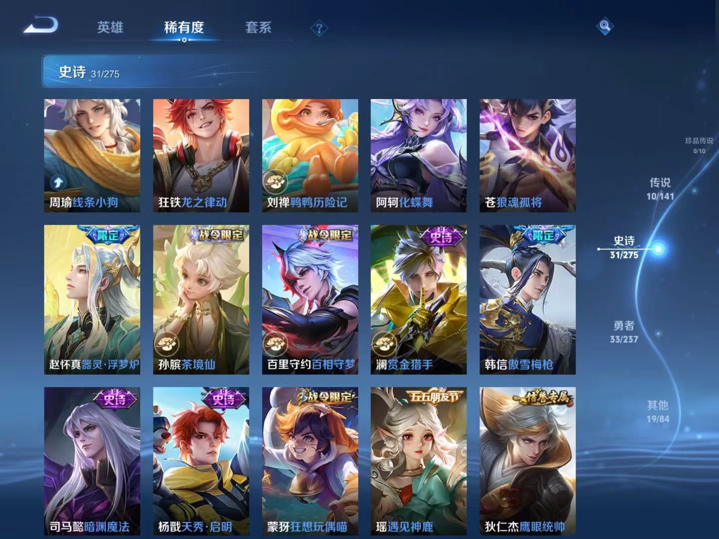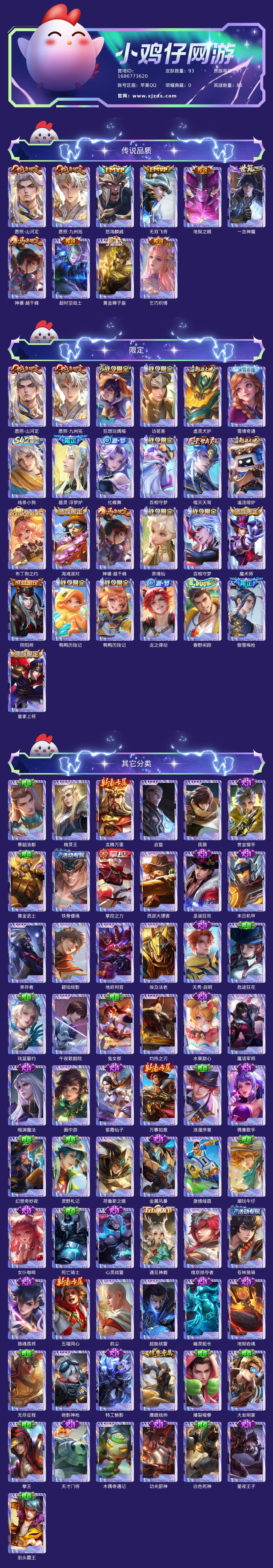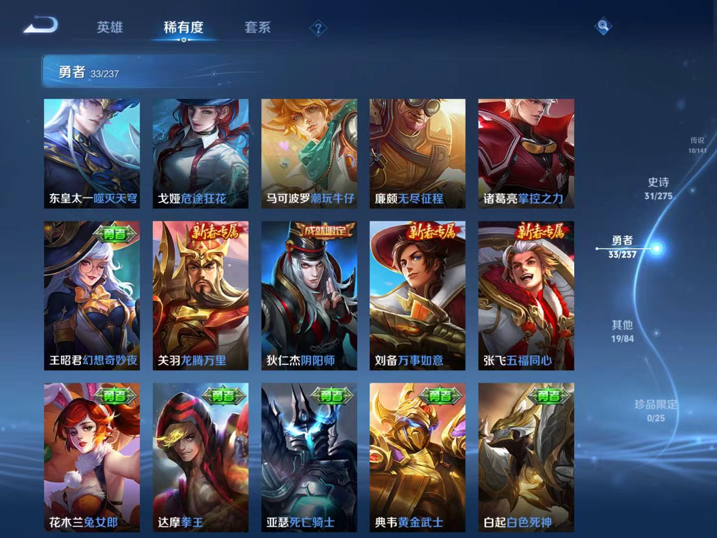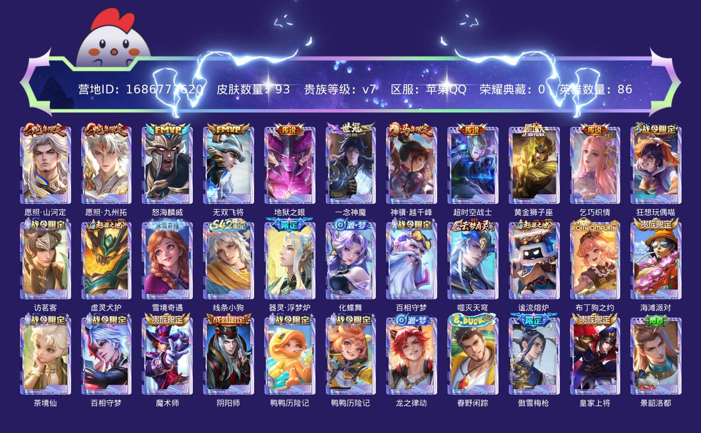 贵族等级:v7皮肤数:93传说品质10 生肖限定3 英雄数:86