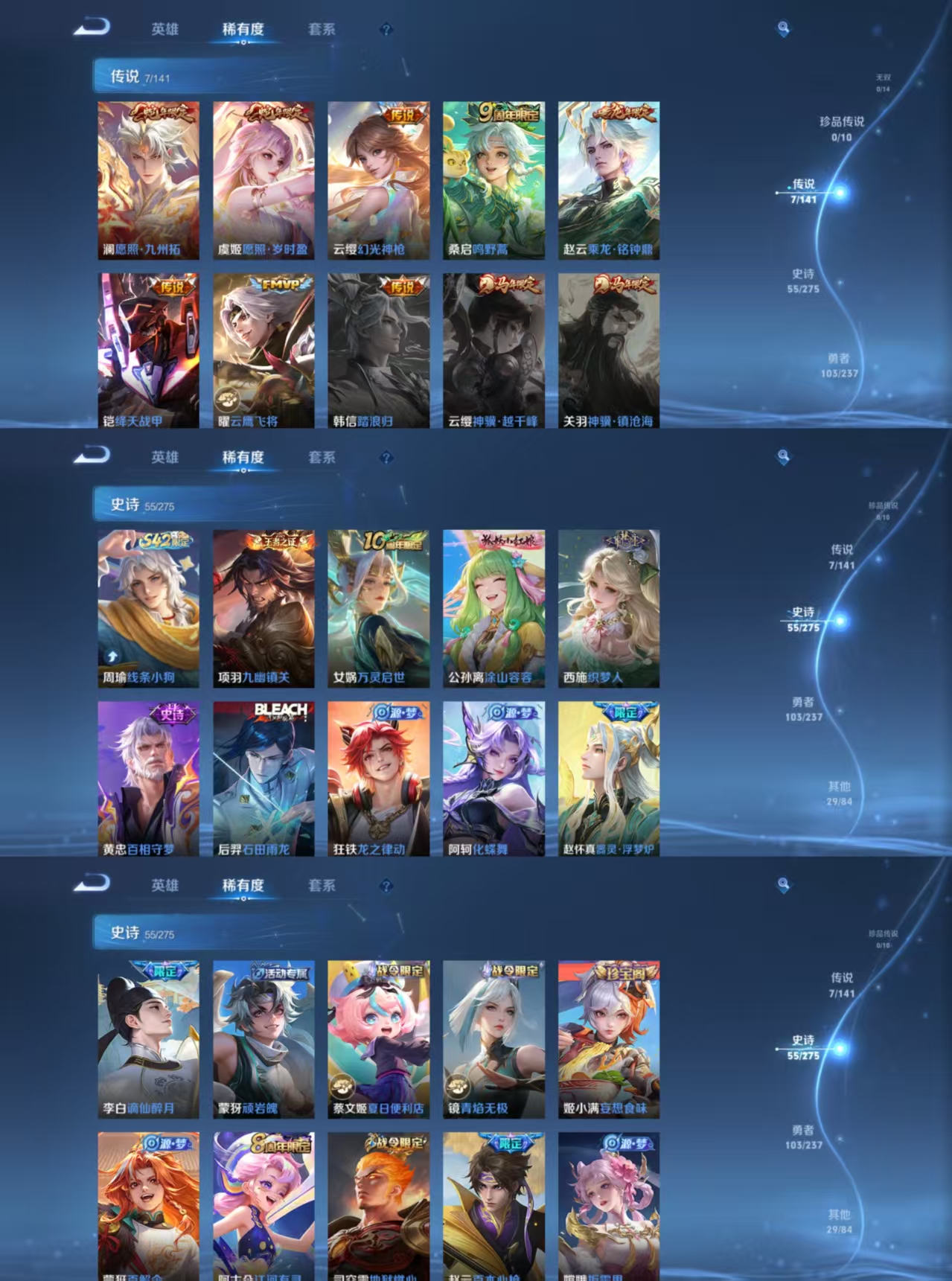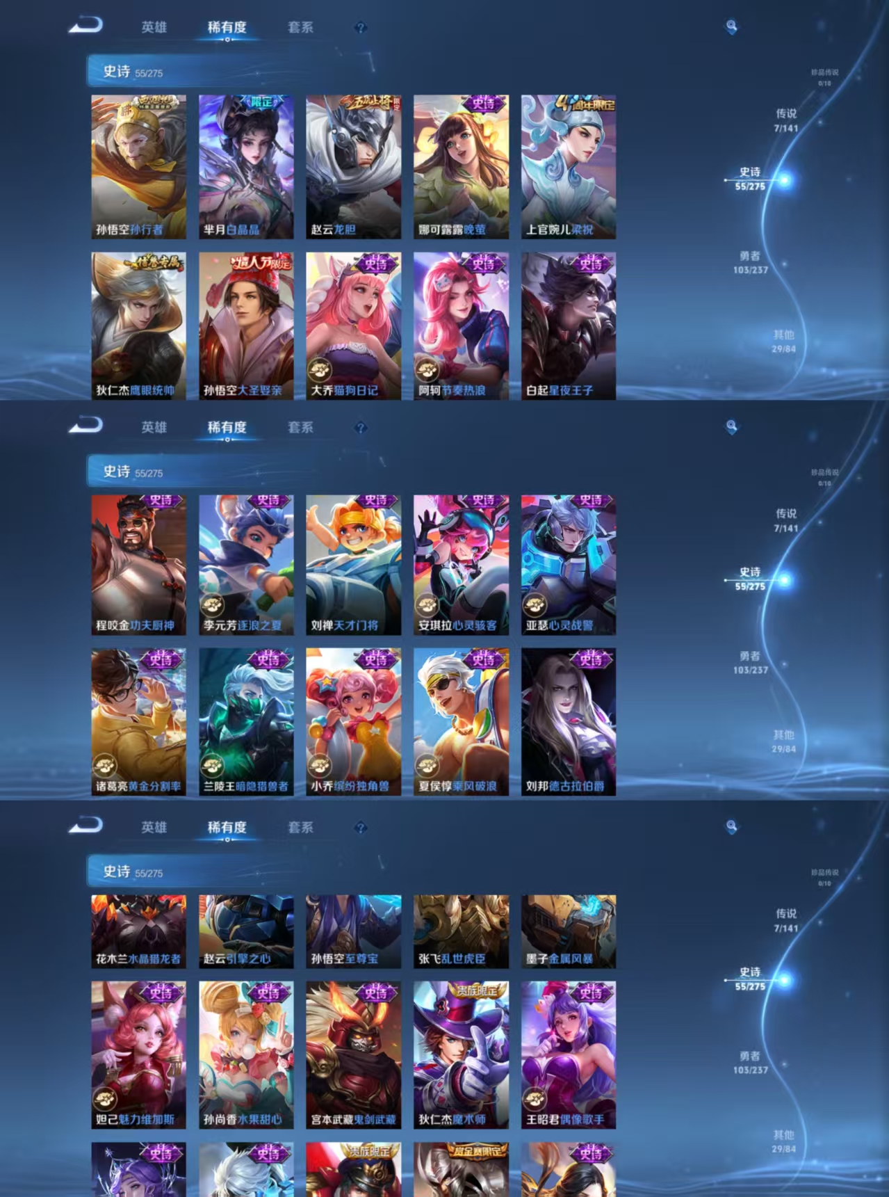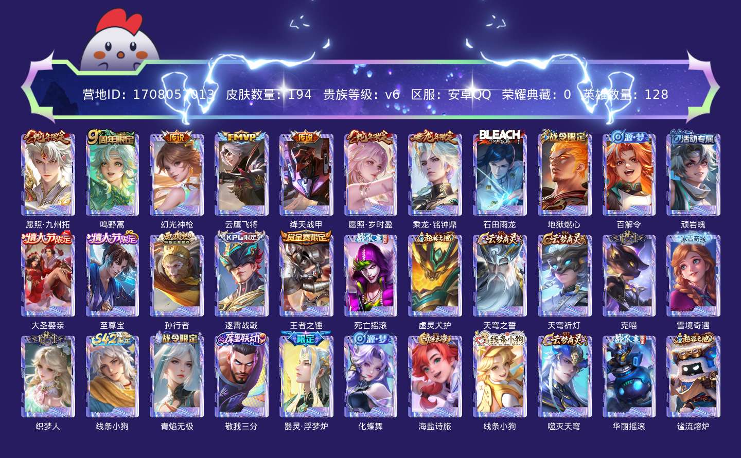 贵族等级:v6皮肤数:194传说品质7 生肖限定3 情人节限定2 英雄数:128