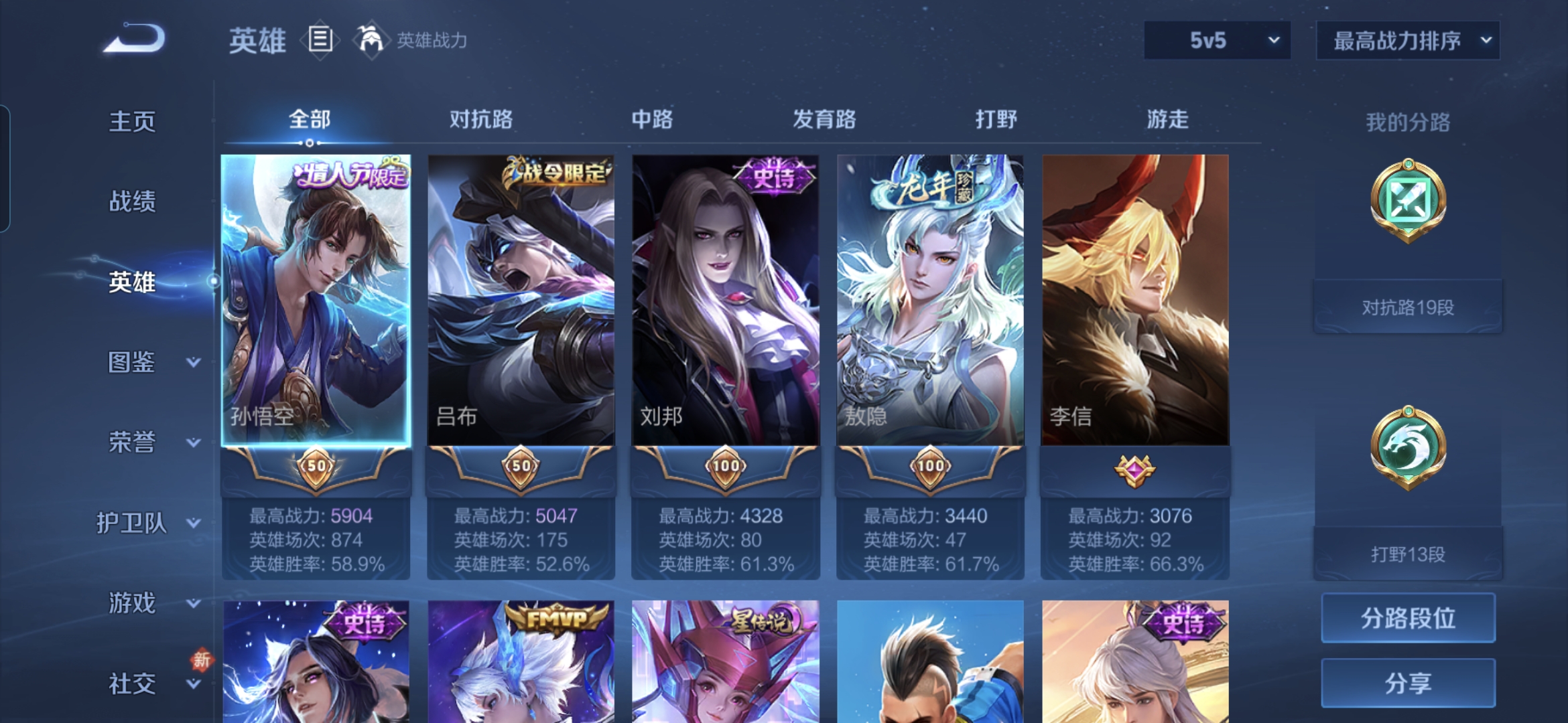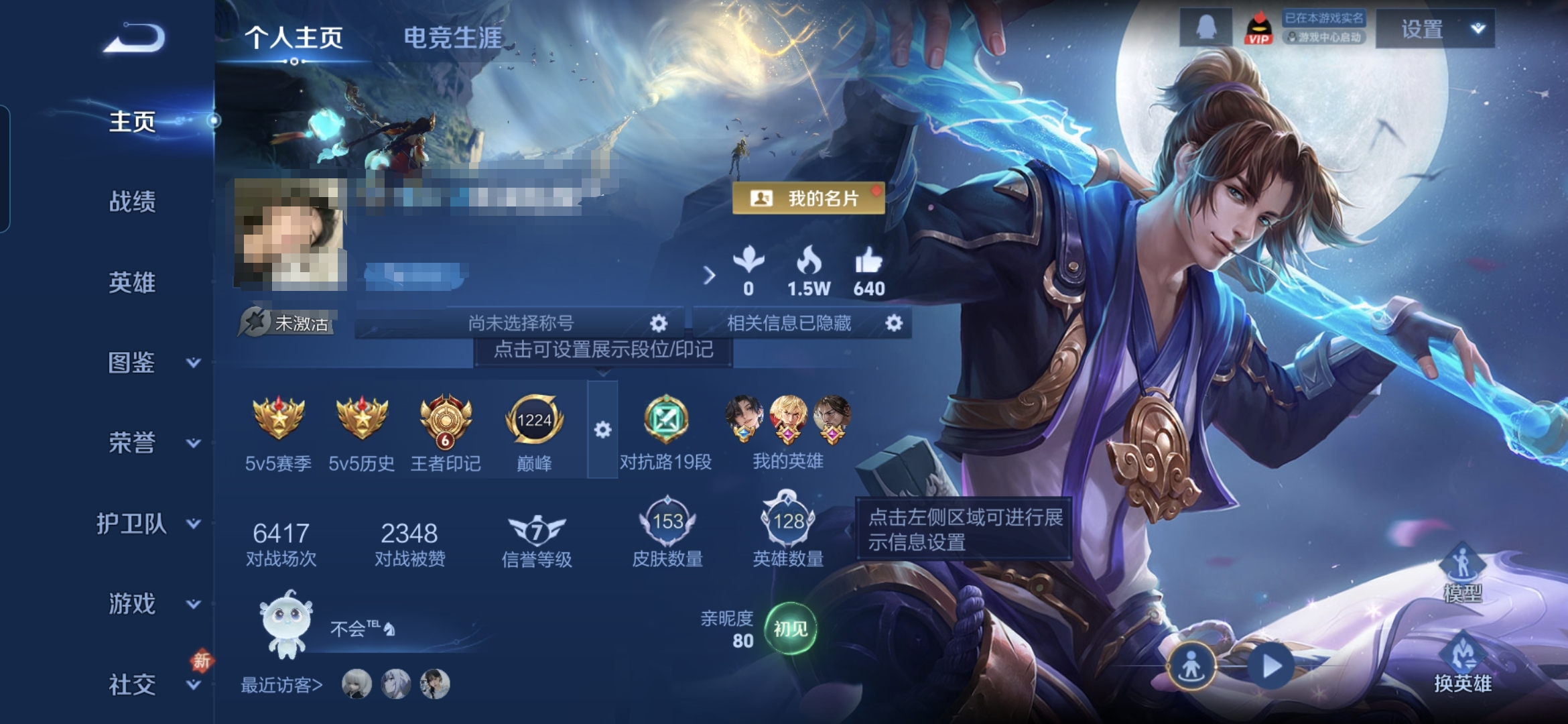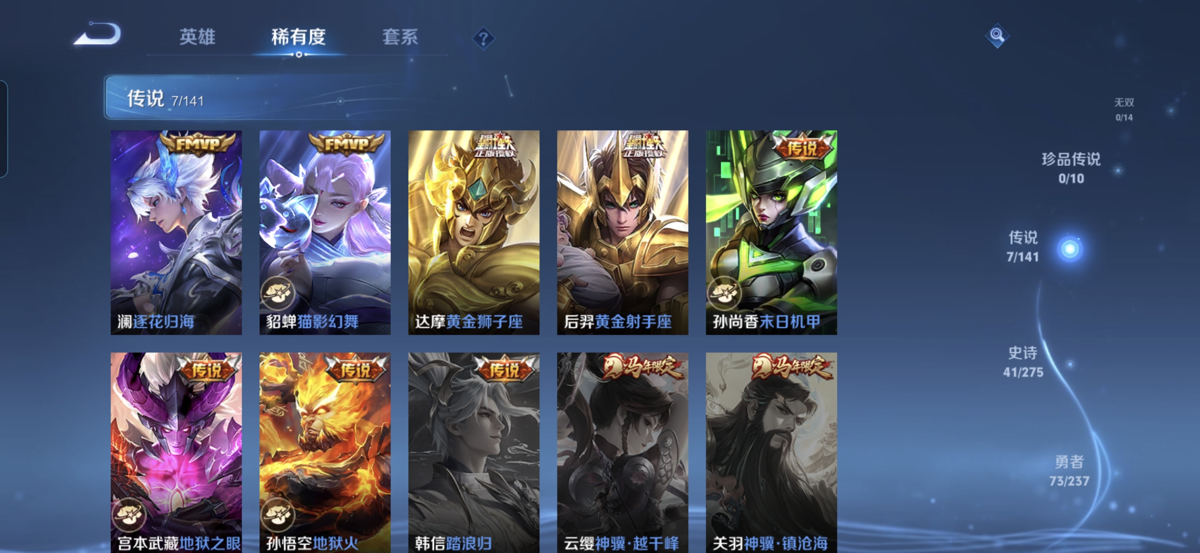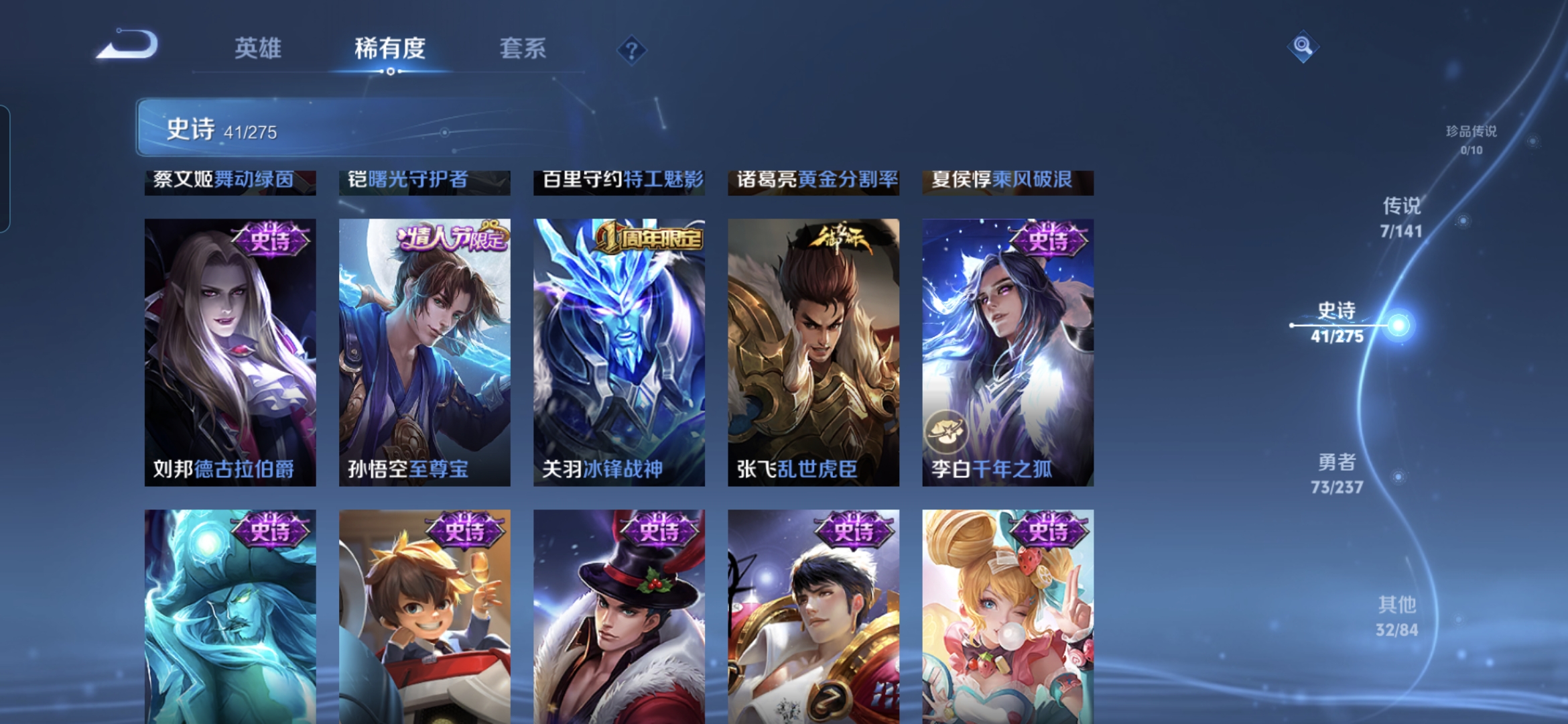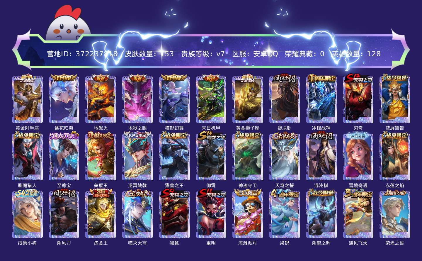 贵族等级:v7皮肤数:153传说品质7 情人节限定1 生肖限定1 英雄数:128