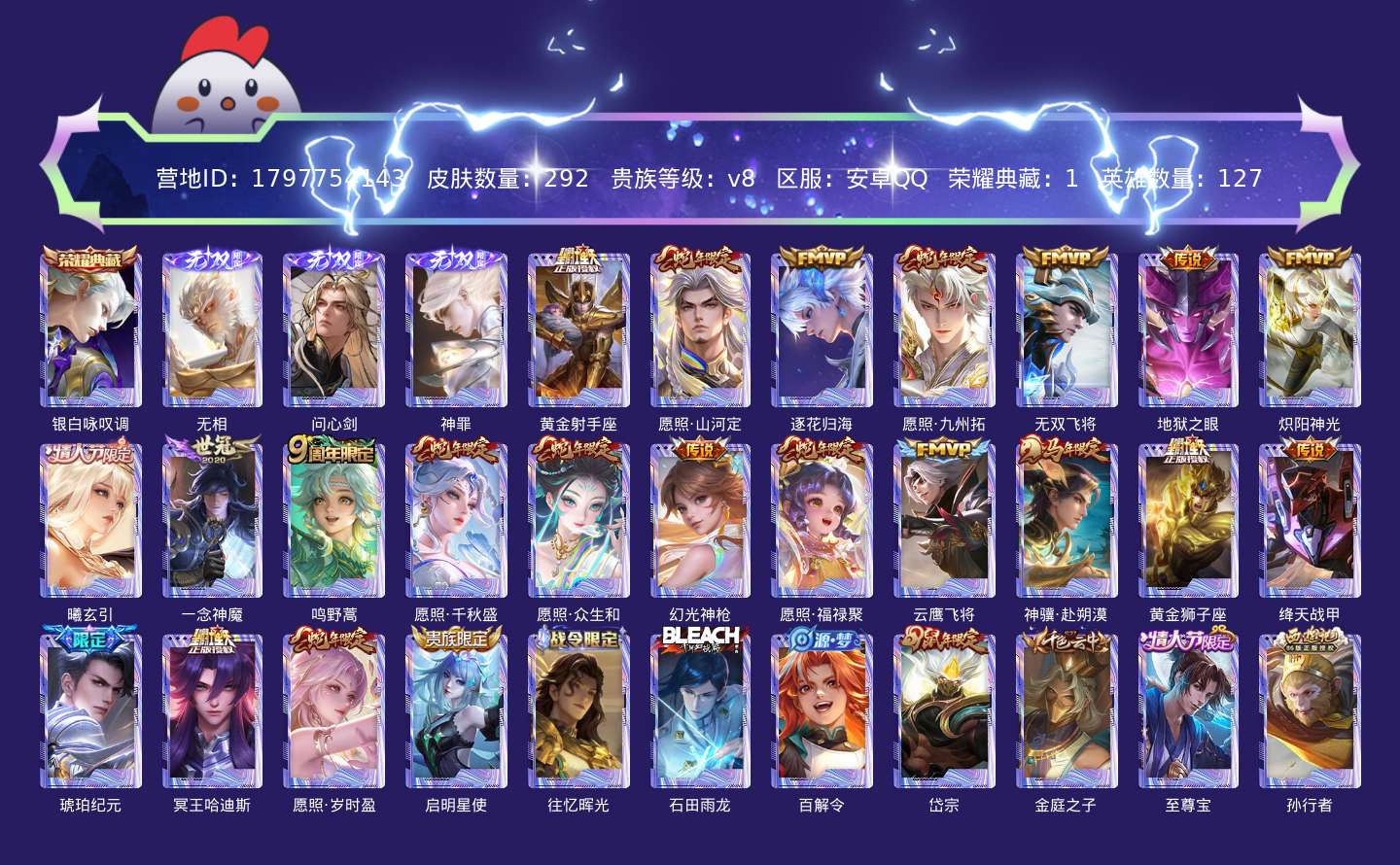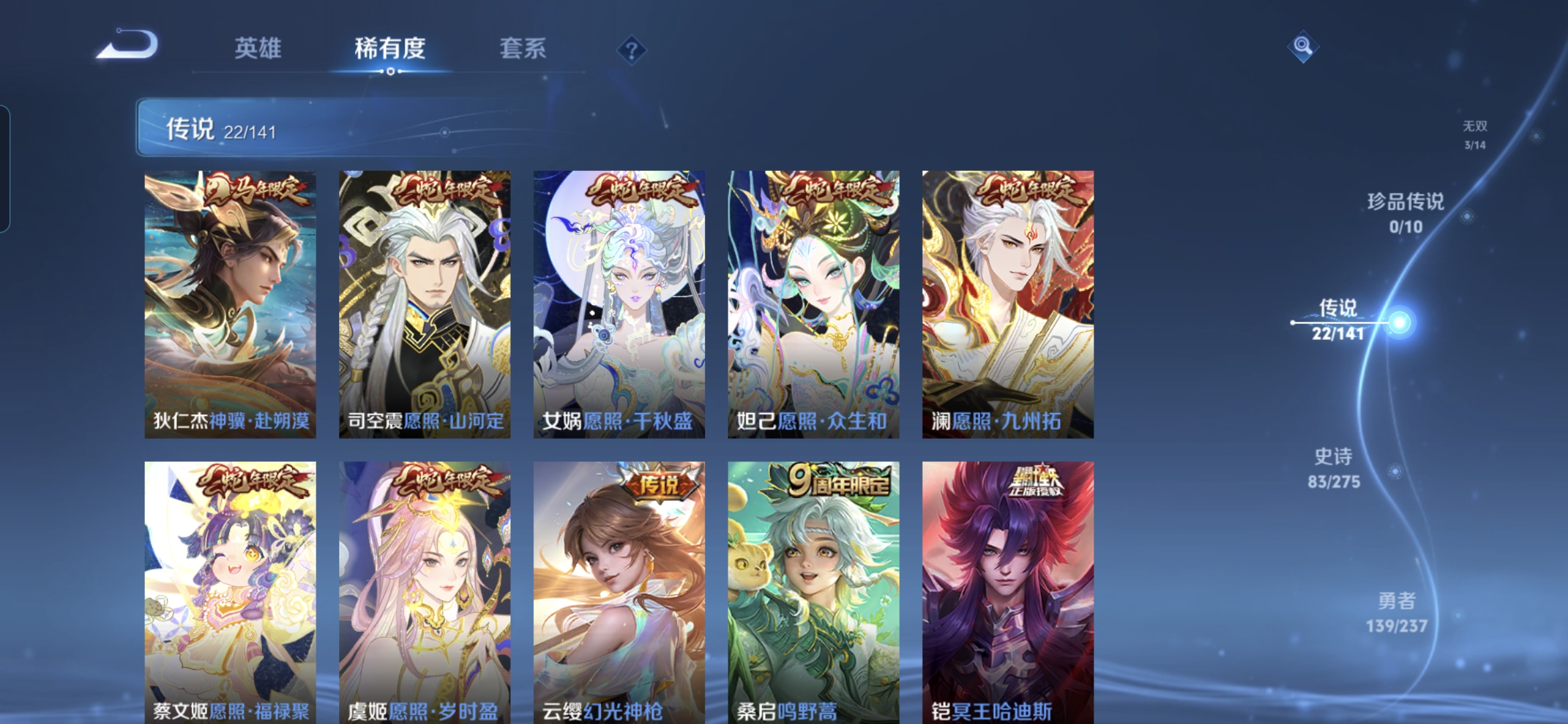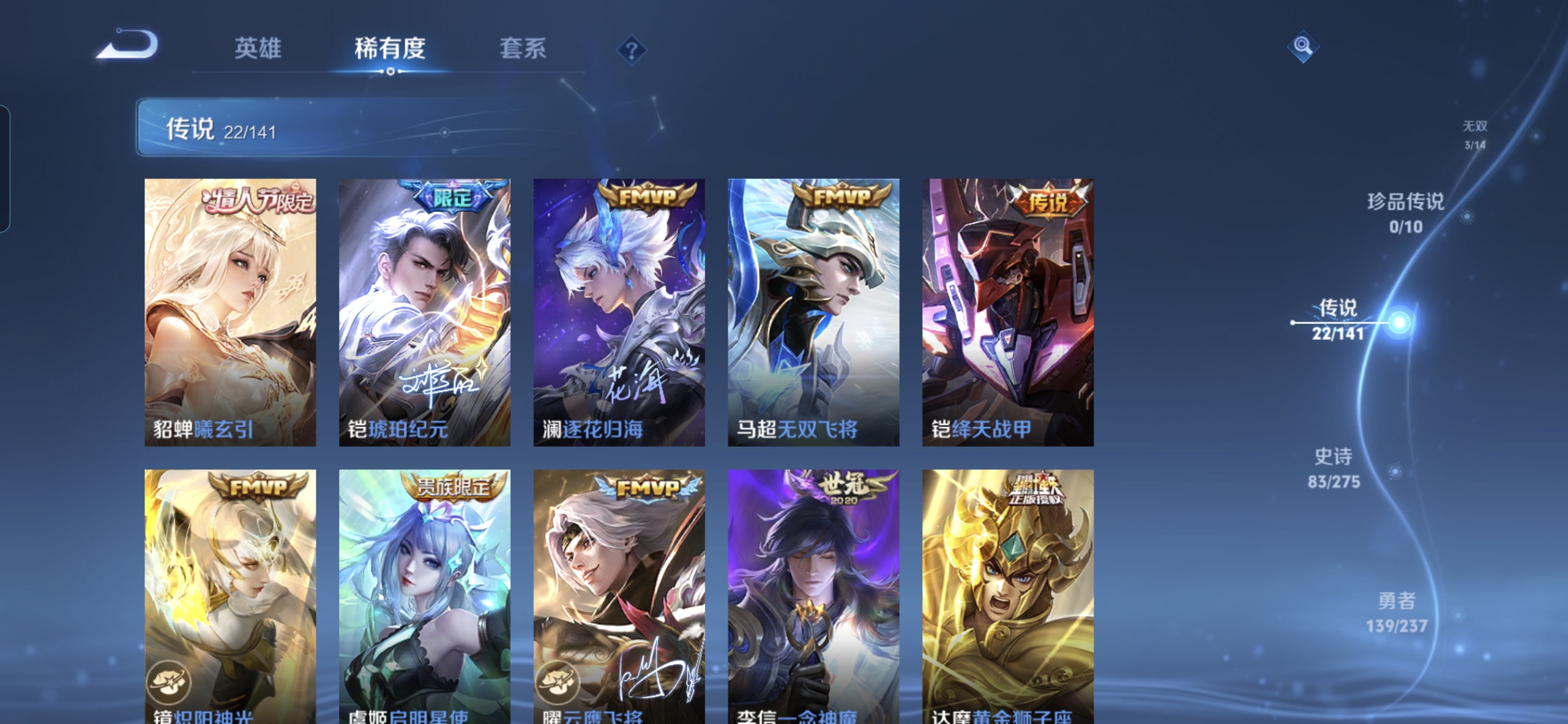 贵族等级:v8皮肤数:298传说品质22 生肖限定9 情人节限定2 无双3 荣耀典藏1 英雄数:127