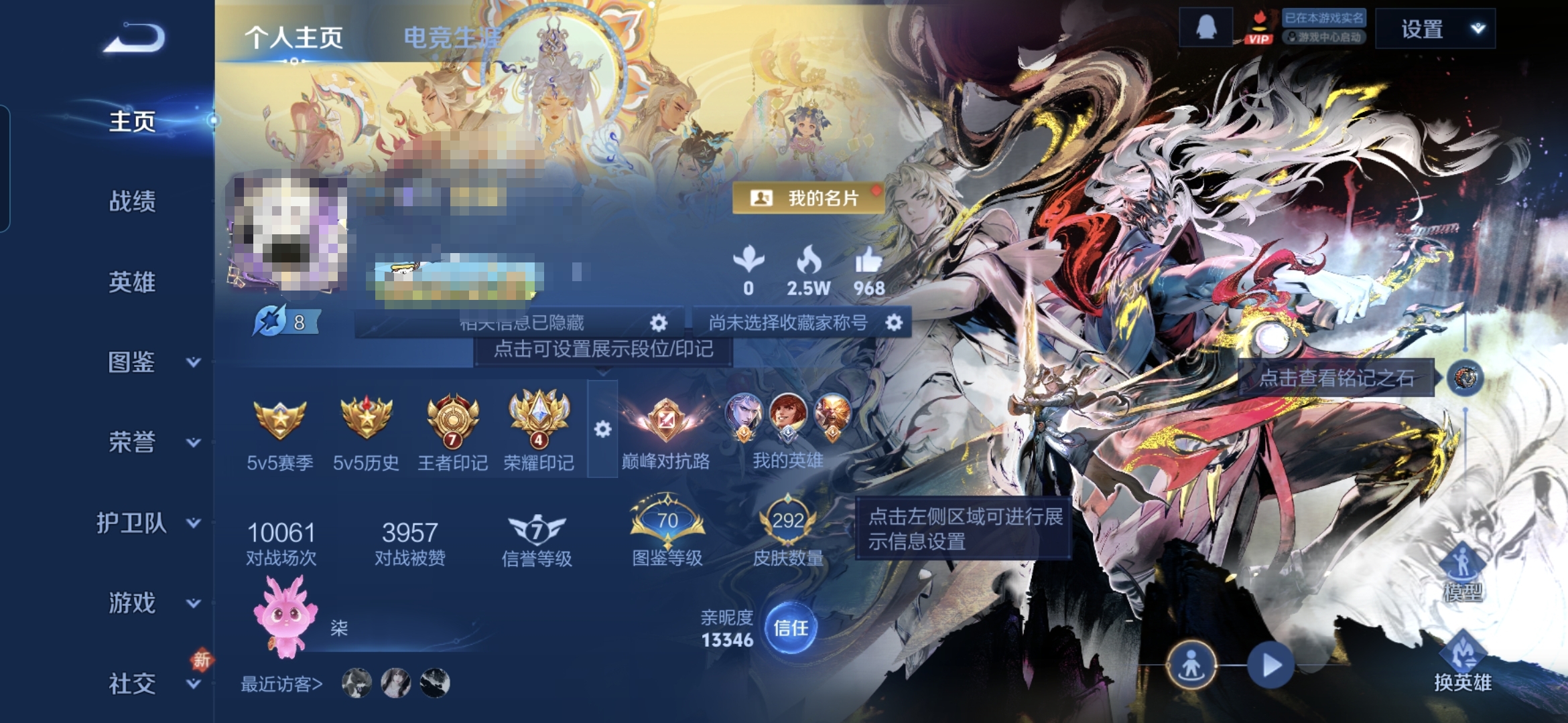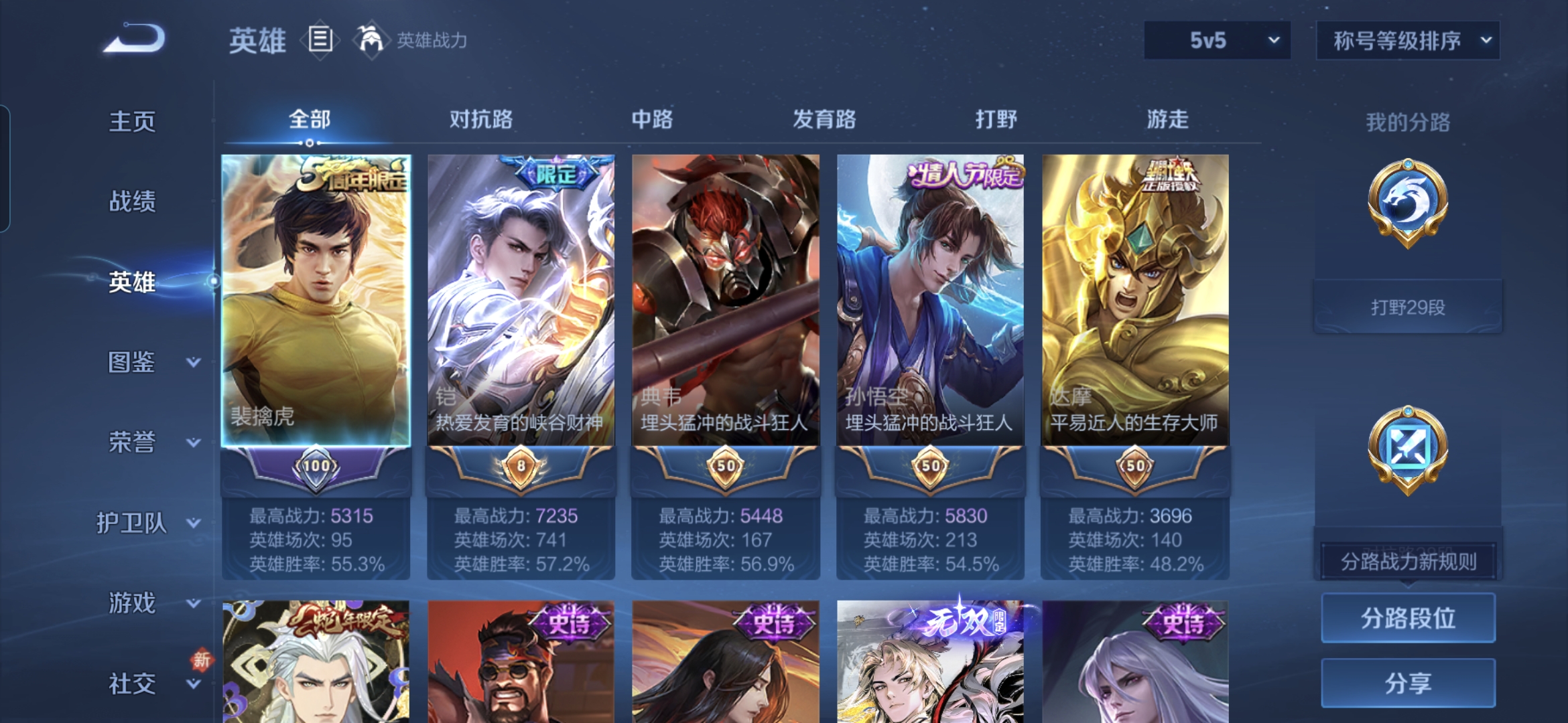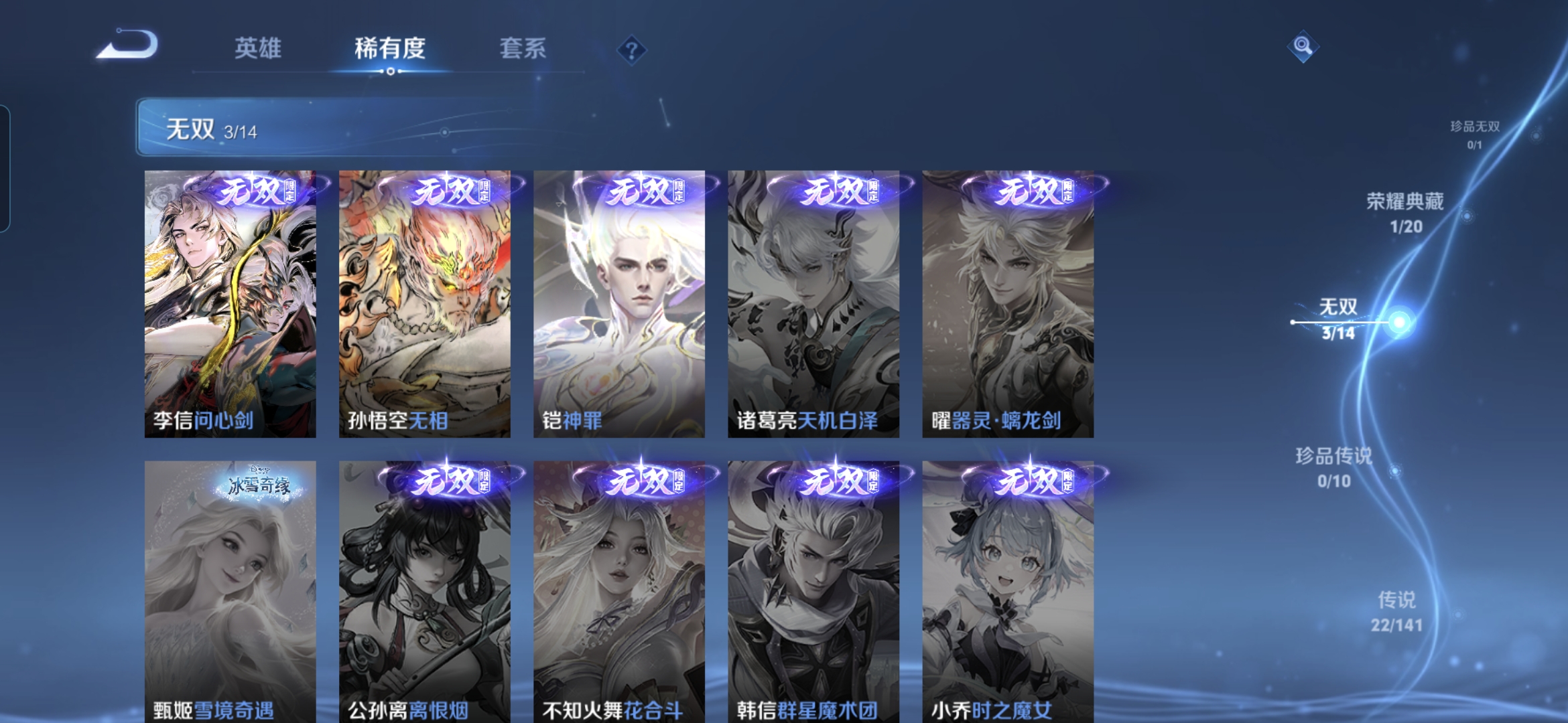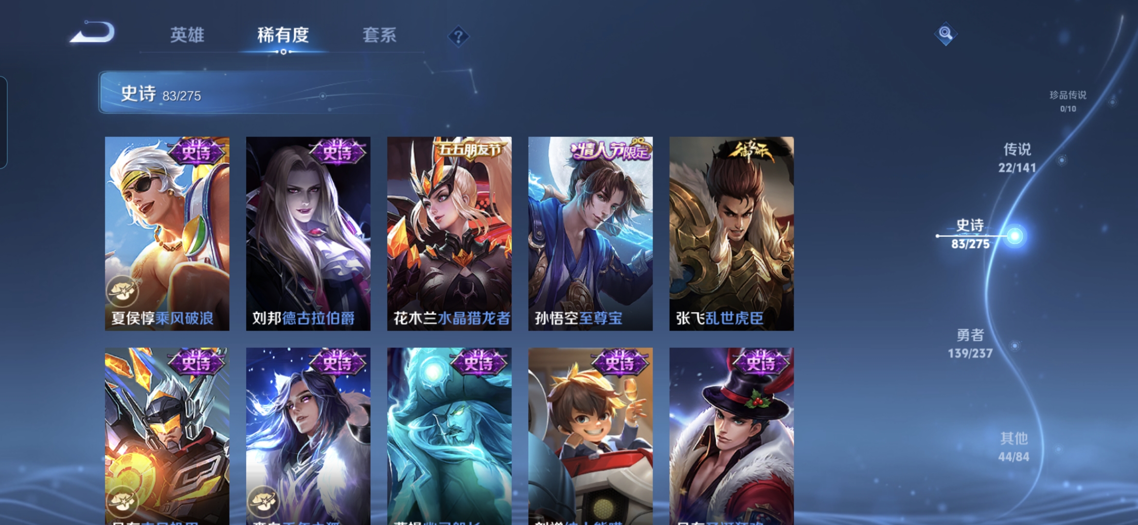 贵族等级:v8皮肤数:298传说品质22 生肖限定9 情人节限定2 无双3 荣耀典藏1 英雄数:127