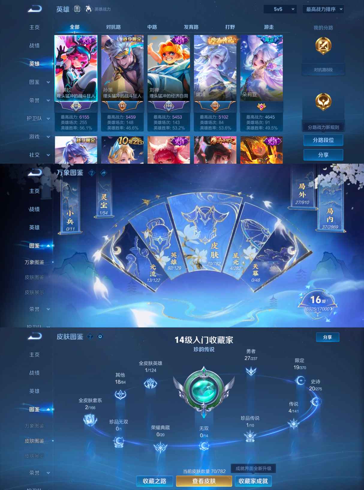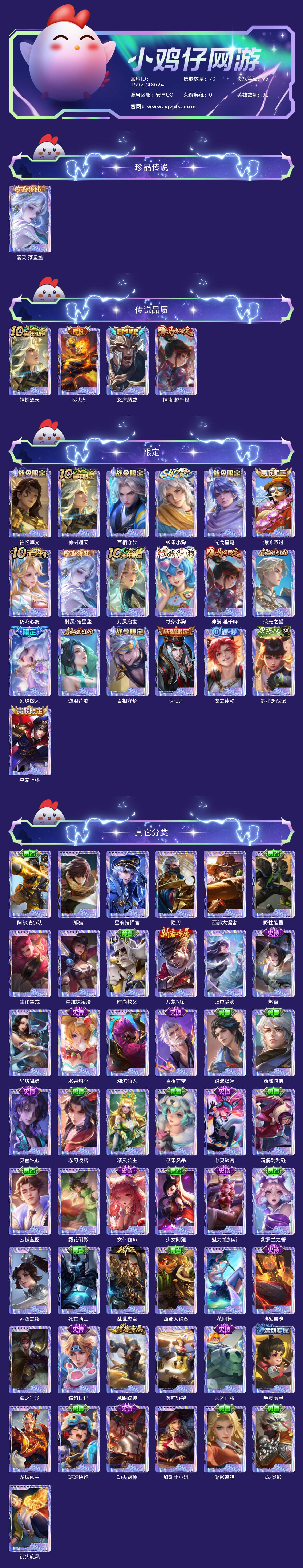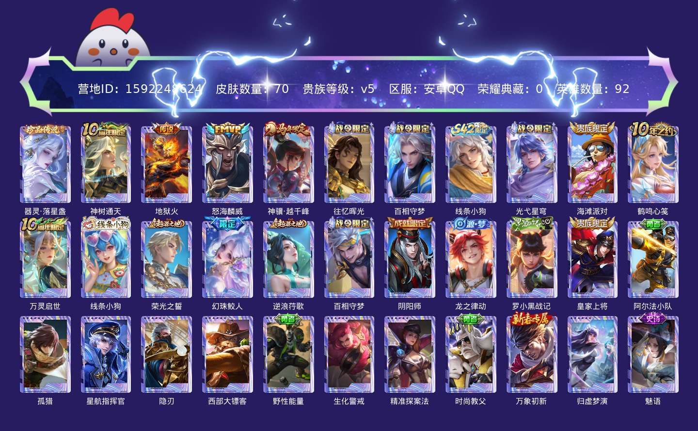 贵族等级:v5皮肤数:70传说品质4 珍品传说1 生肖限定1 英雄数:92