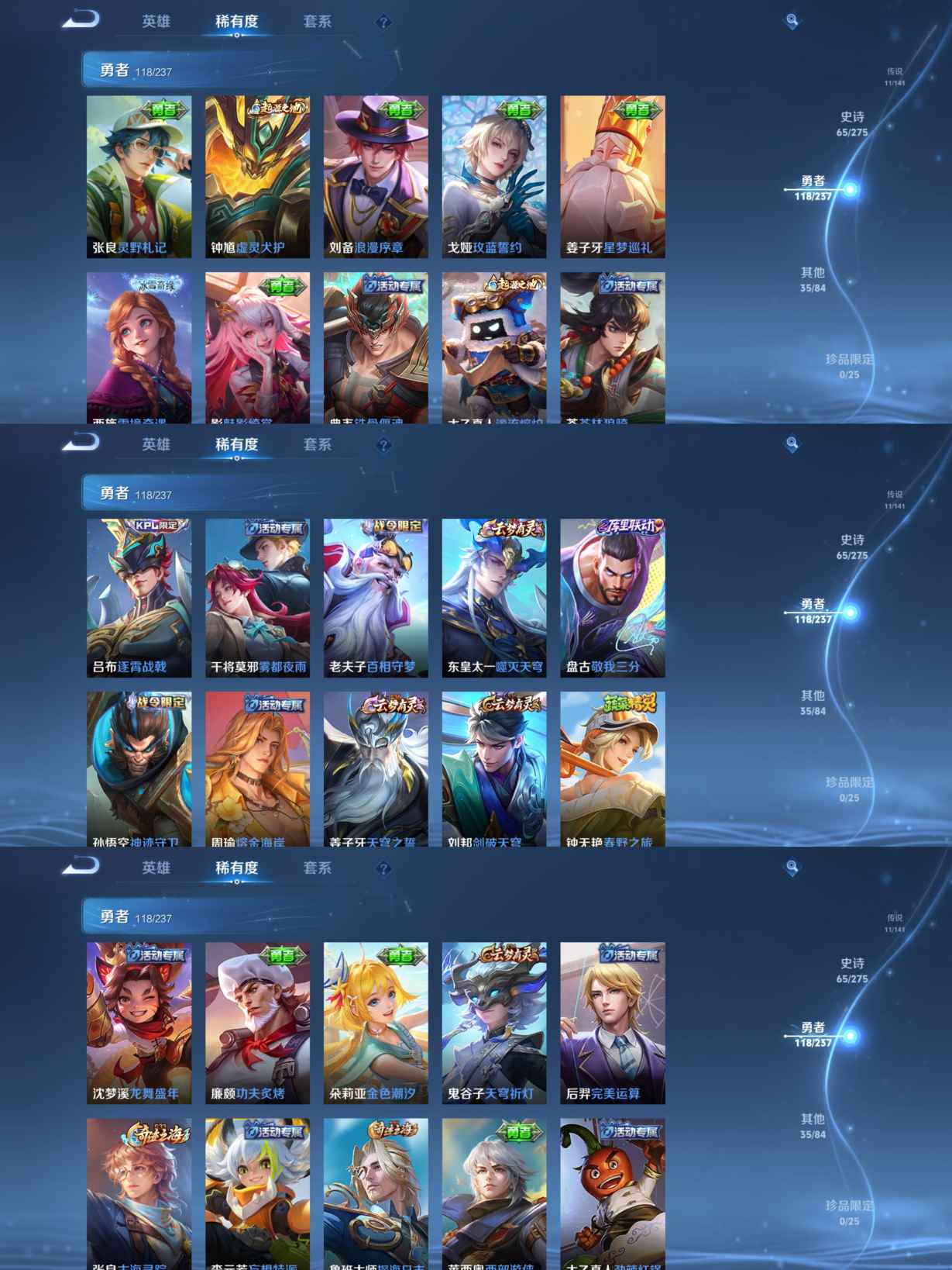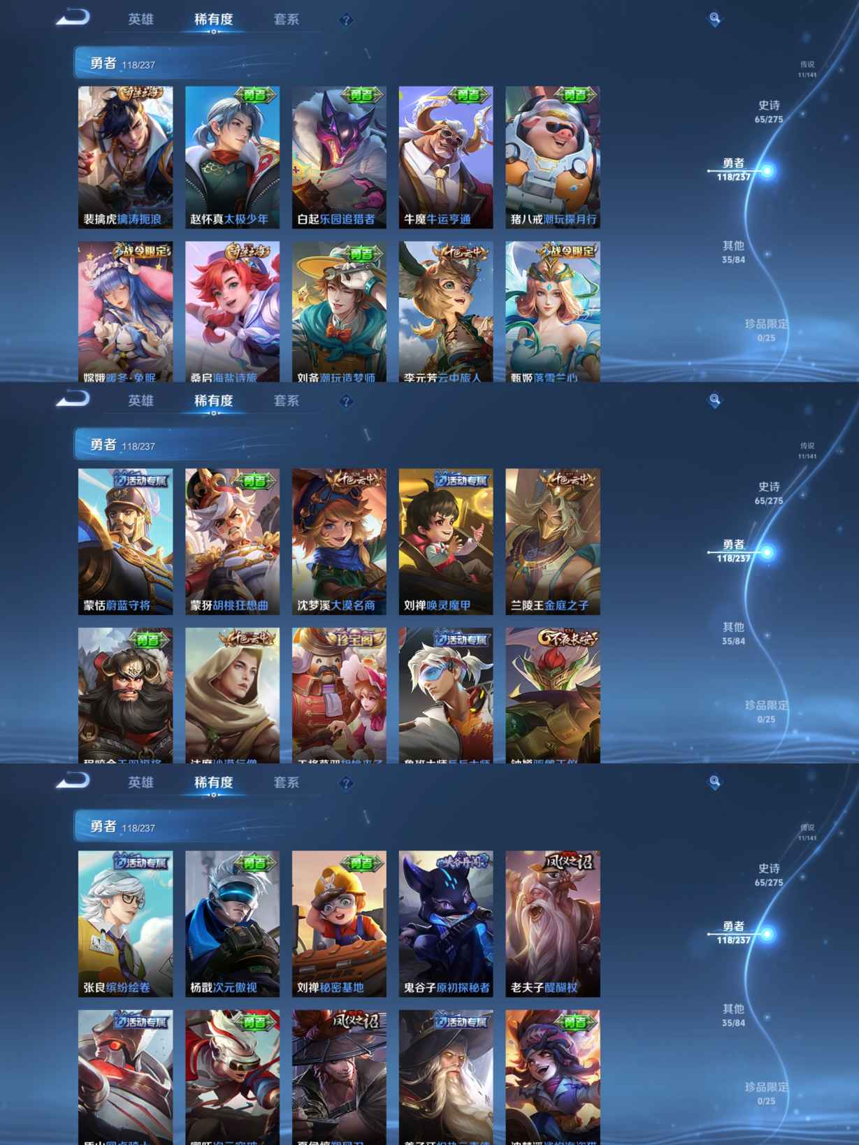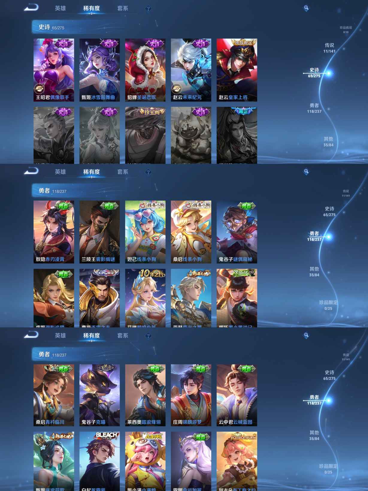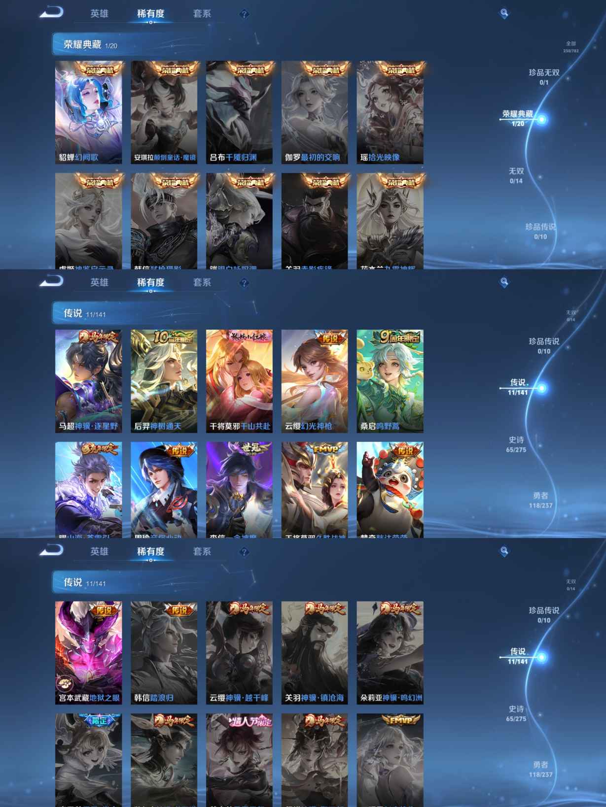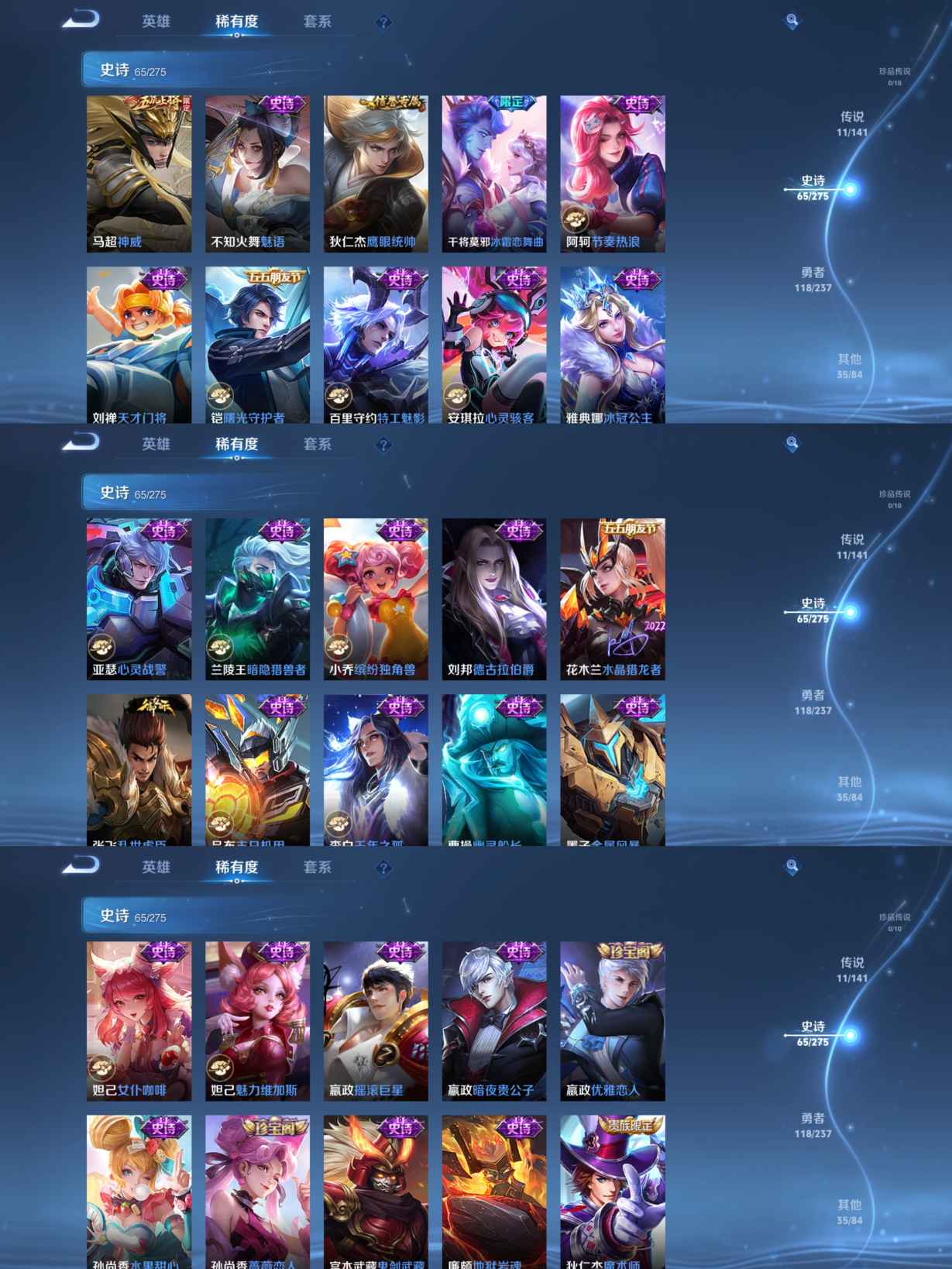 贵族等级:v6皮肤数:230传说品质11 生肖限定2 荣耀典藏1 英雄数:127