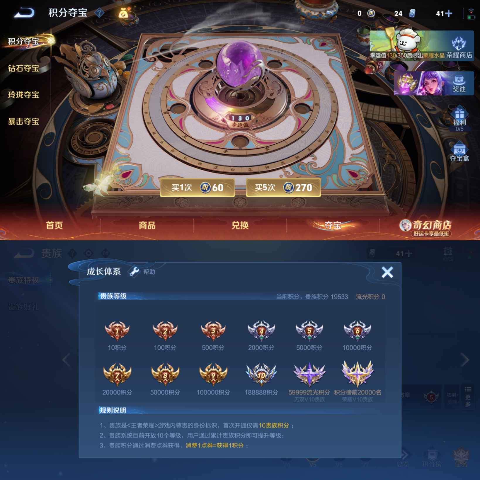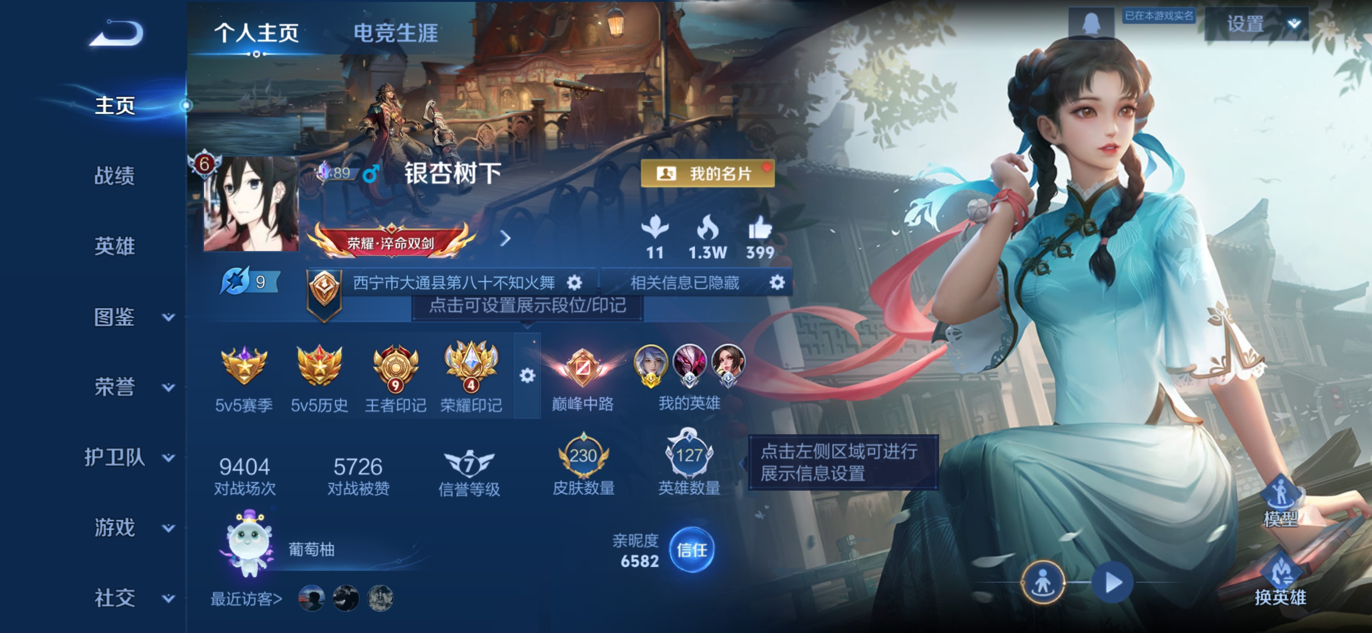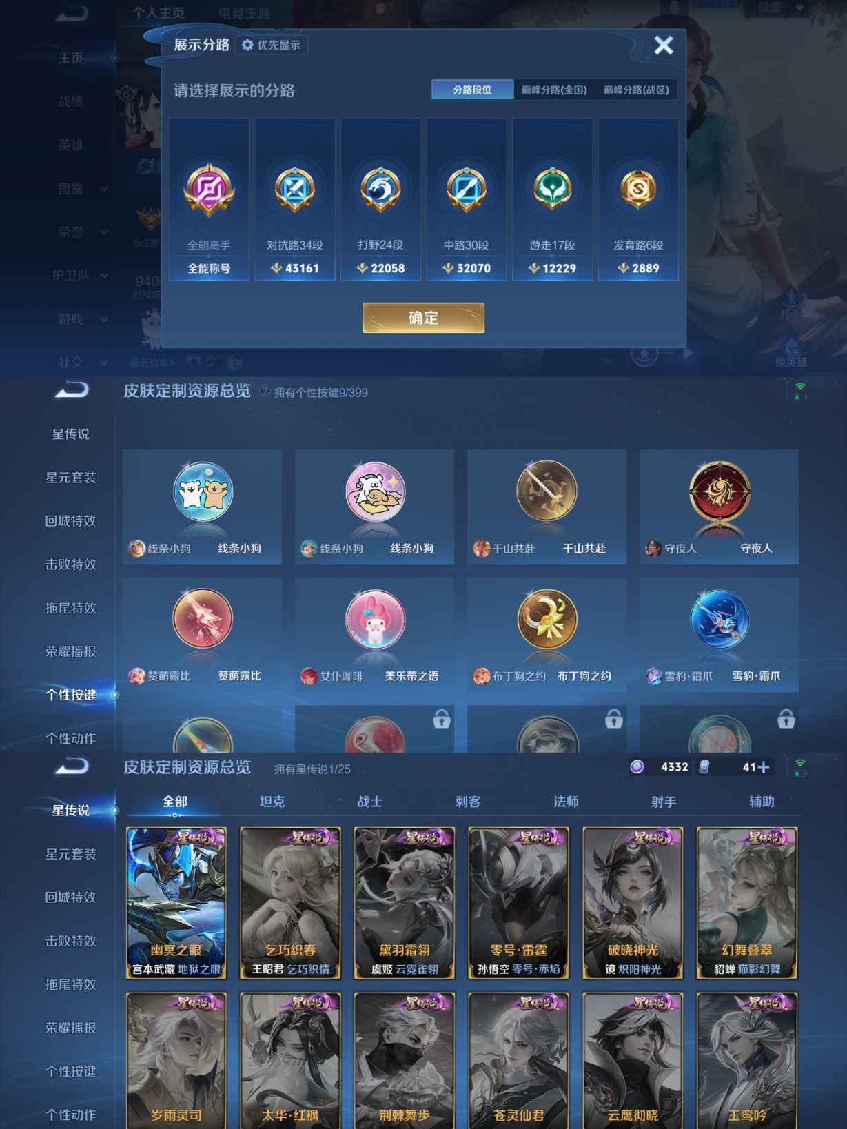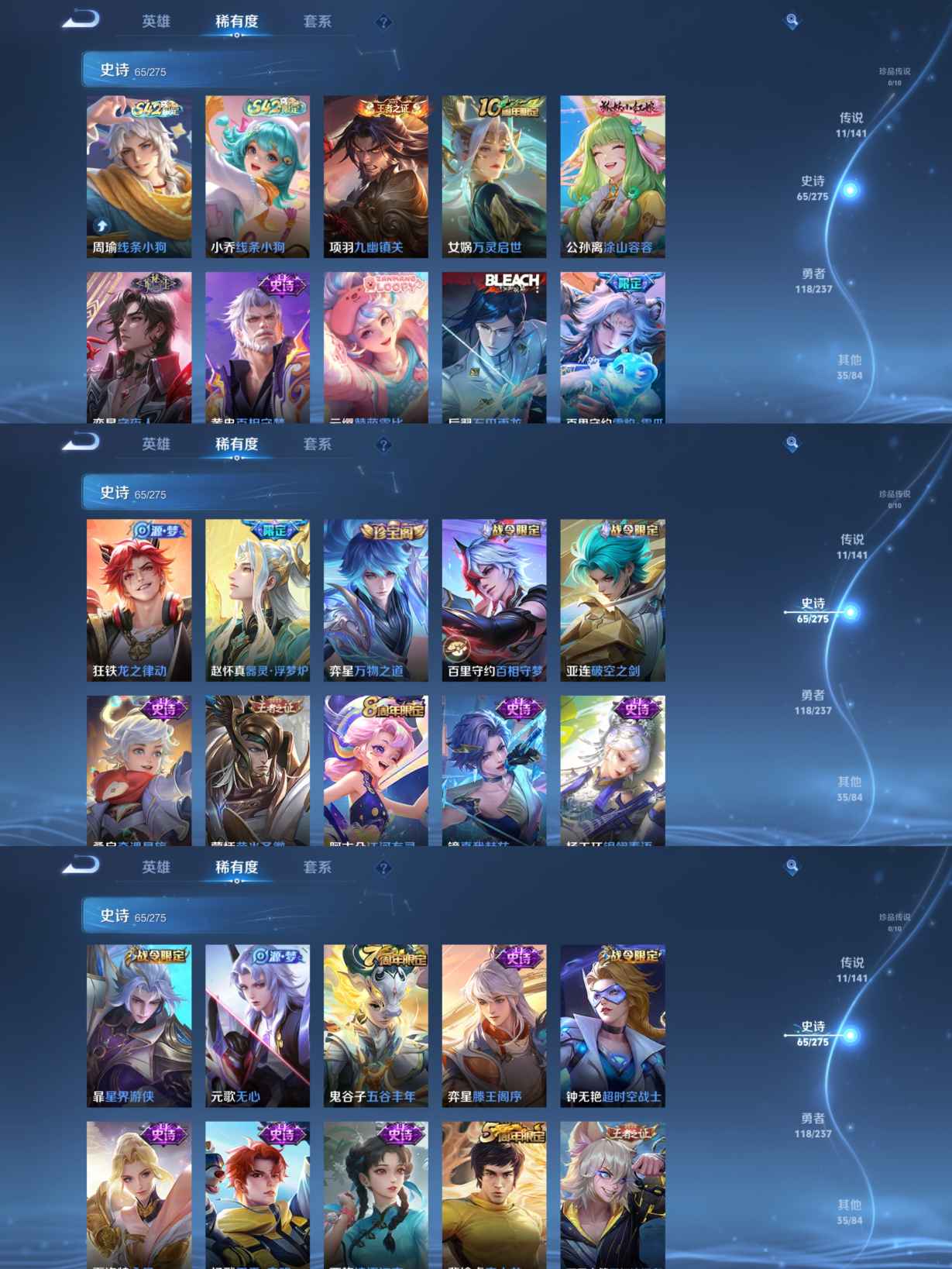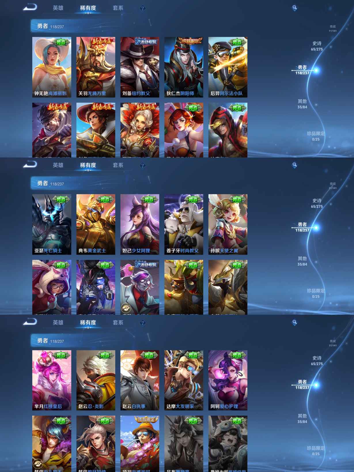 贵族等级:v6皮肤数:230传说品质11 生肖限定2 荣耀典藏1 英雄数:127