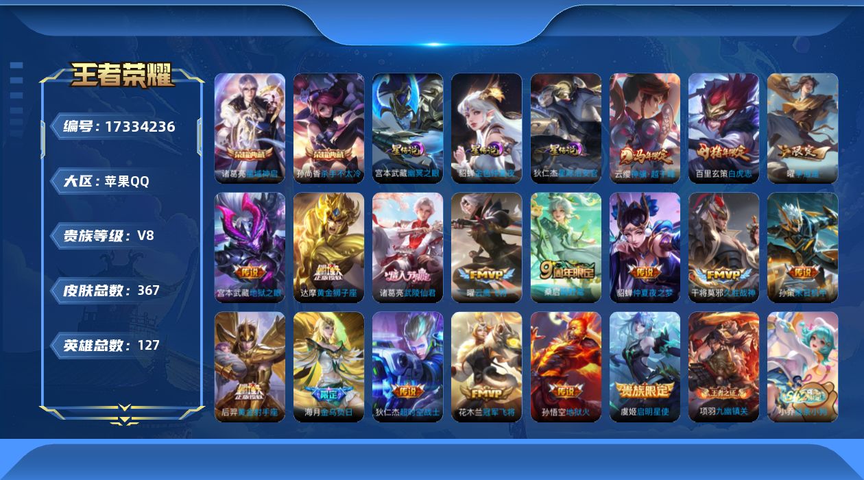 贵族等级:v8皮肤数:367传说品质17 情人节限定2 荣耀典藏2 生肖限定4 英雄数:127