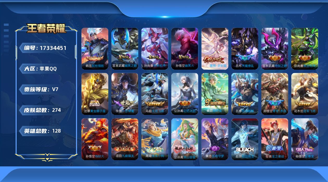 贵族等级:v7皮肤数:274生肖限定4 情人节限定1 传说品质13 荣耀典藏1 英雄数:128