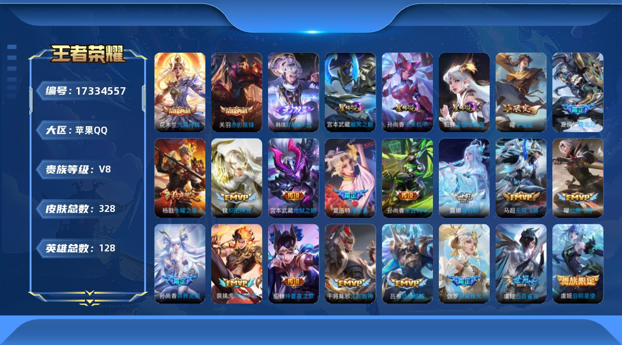 贵族等级:v8皮肤数:328生肖限定5 荣耀典藏2 情人节限定1 传说品质19 无双1 英雄数:128