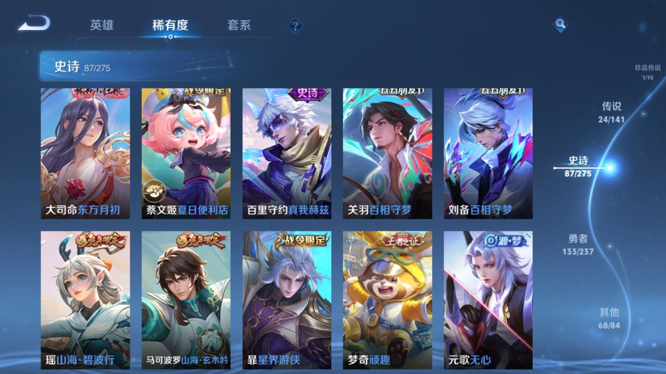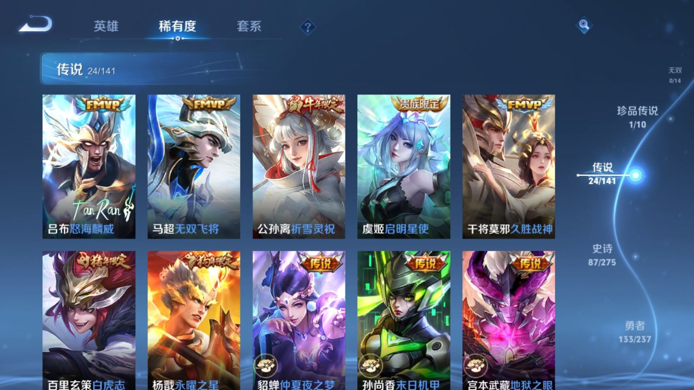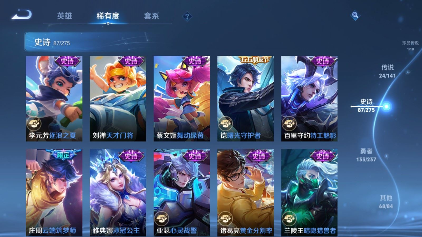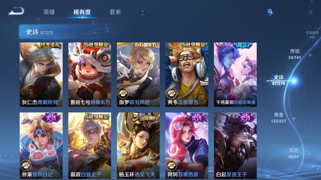贵族等级:v9皮肤数:314情人节限定2 荣耀典藏1 传说品质24 生肖限定11 珍品传说1 英雄数:128