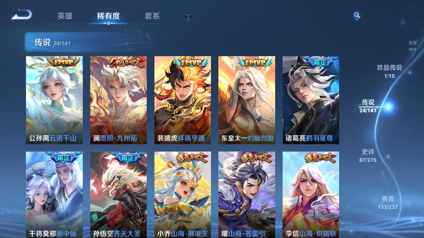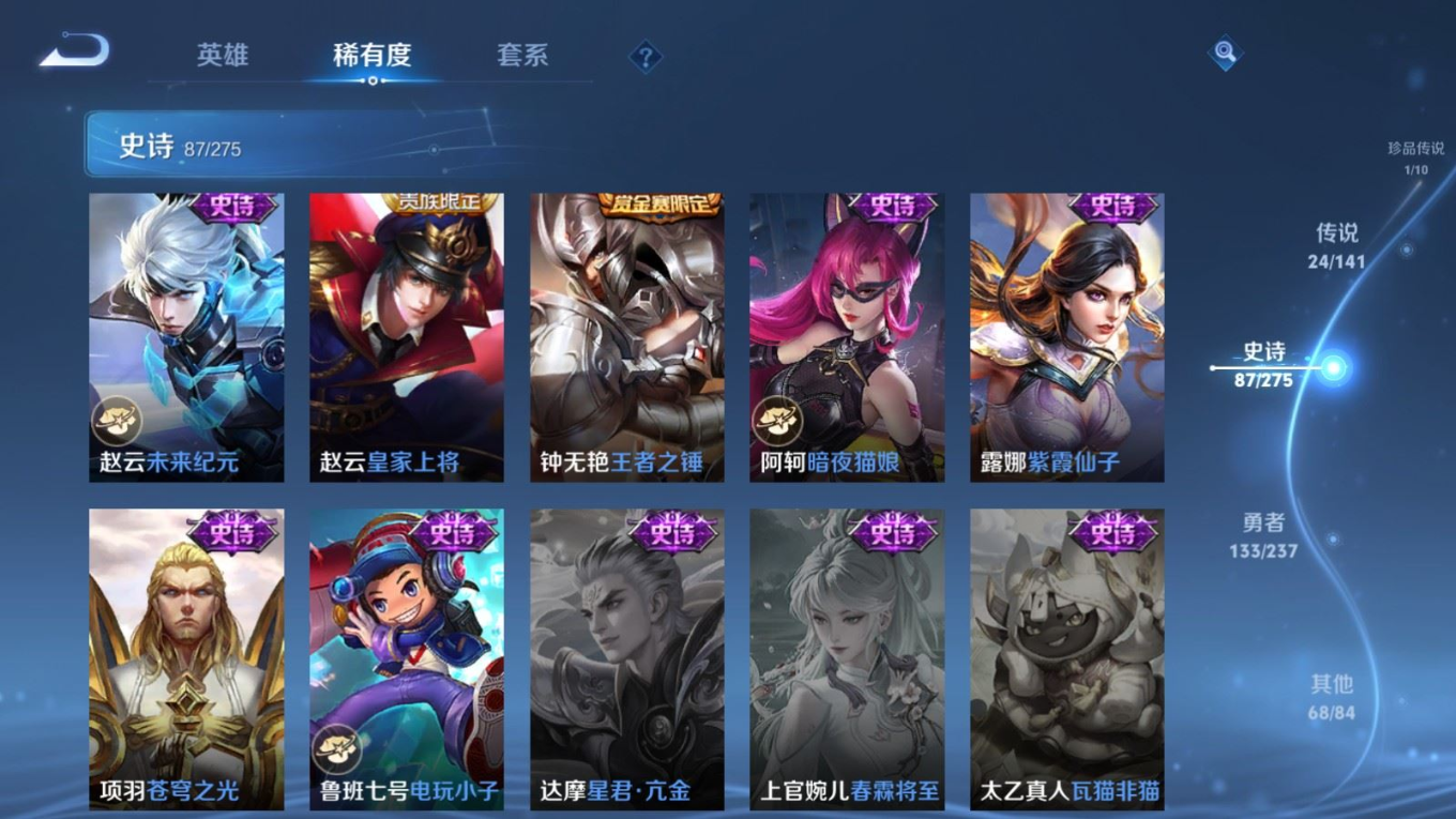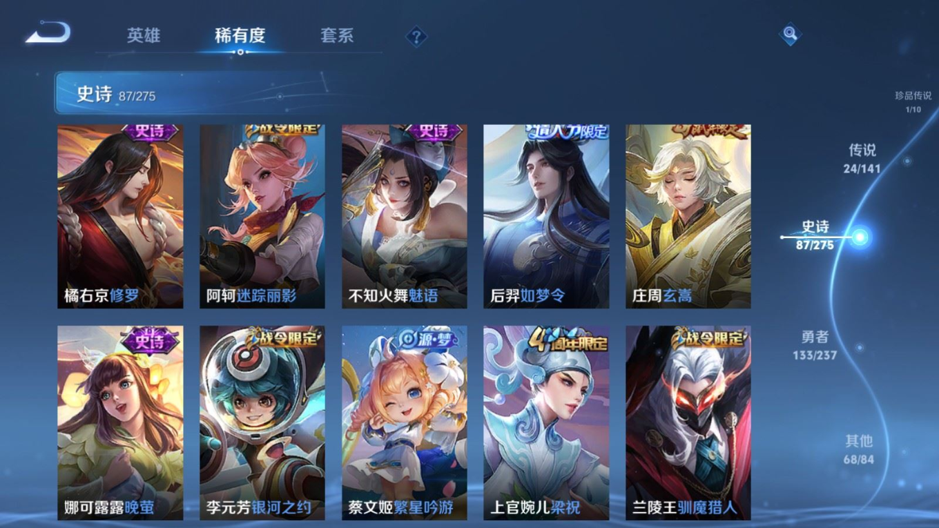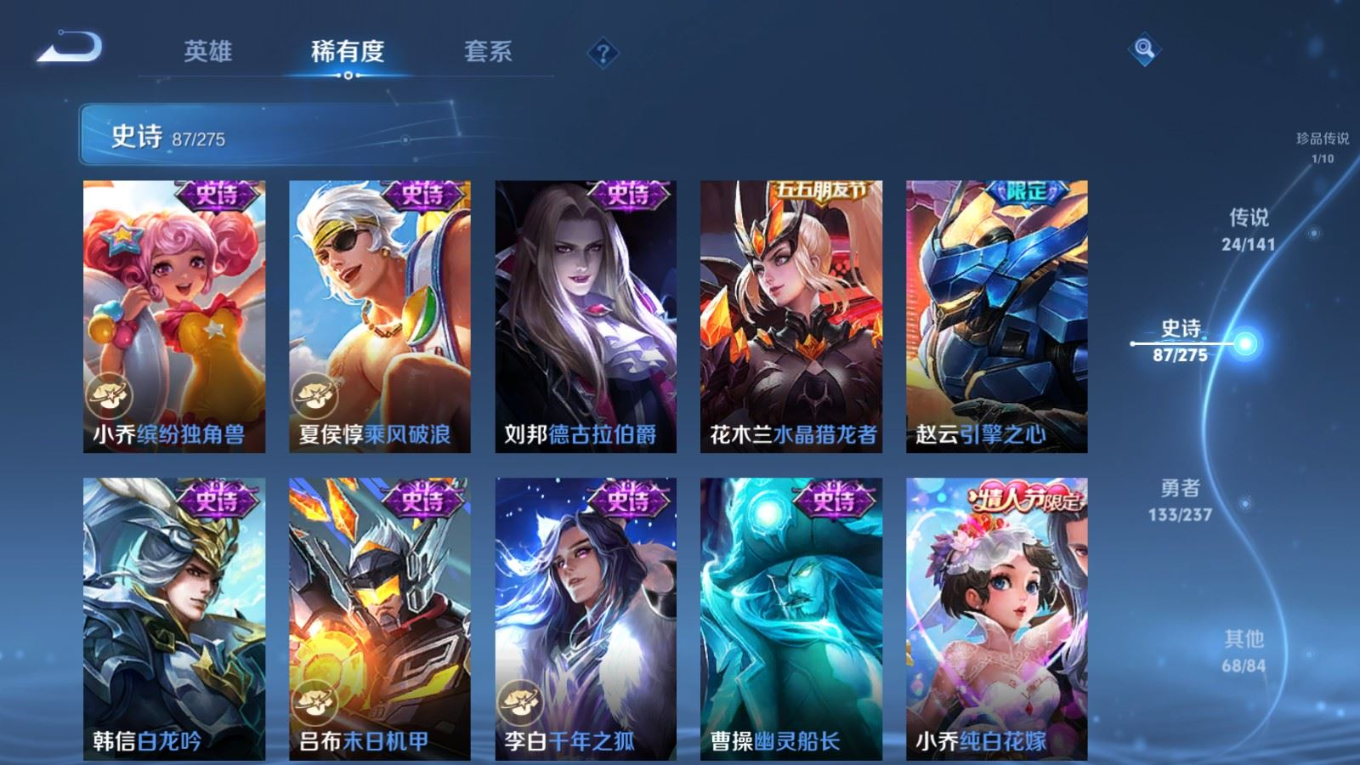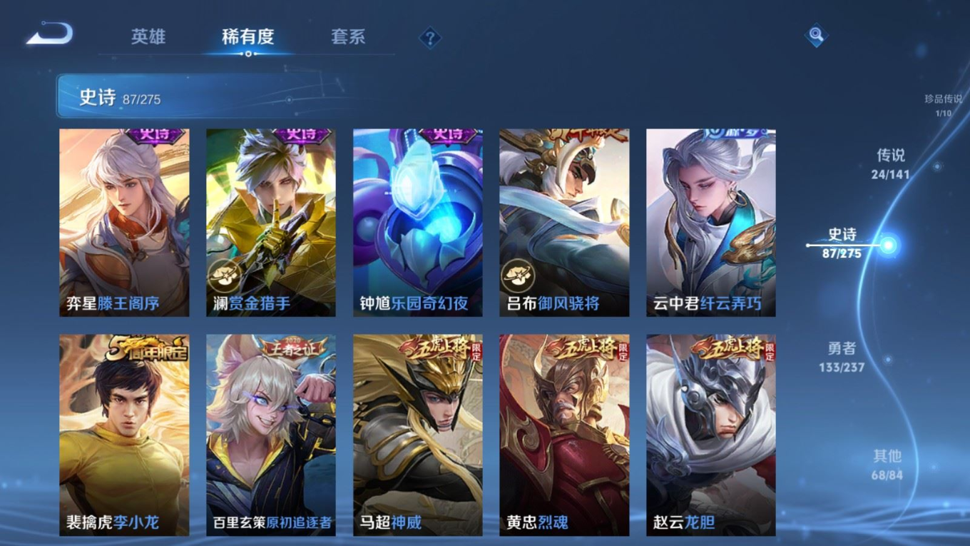 贵族等级:v9皮肤数:314情人节限定2 荣耀典藏1 传说品质24 生肖限定11 珍品传说1 英雄数:128