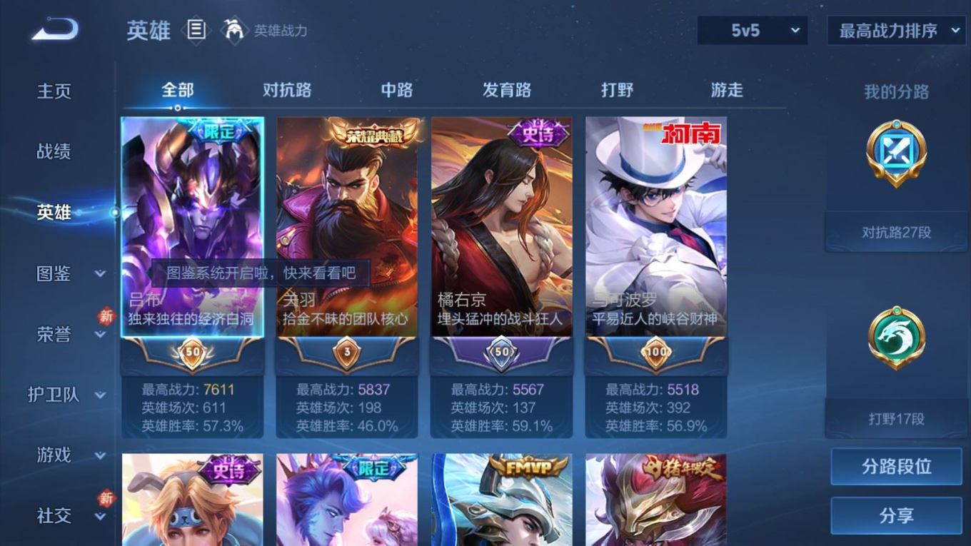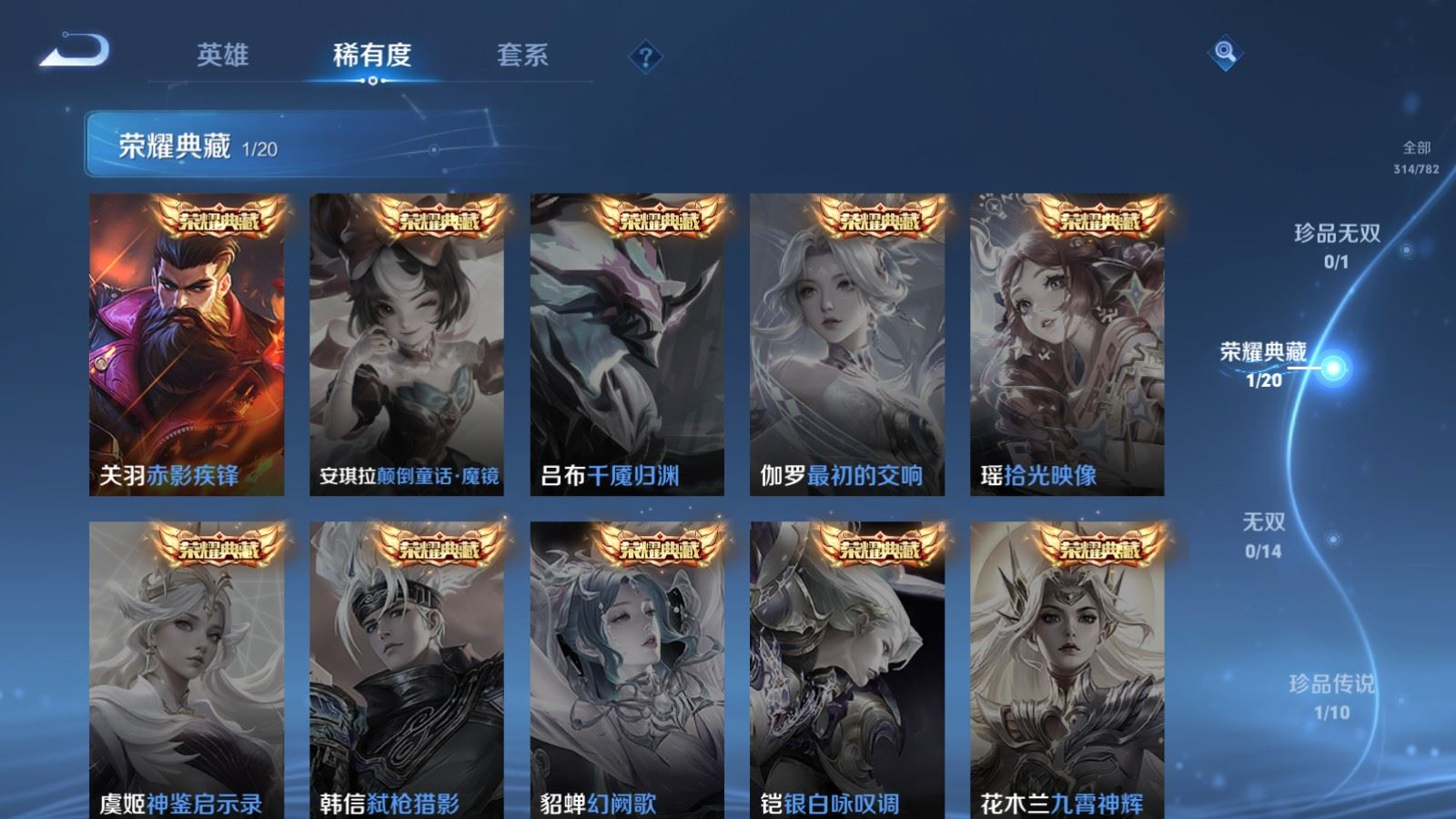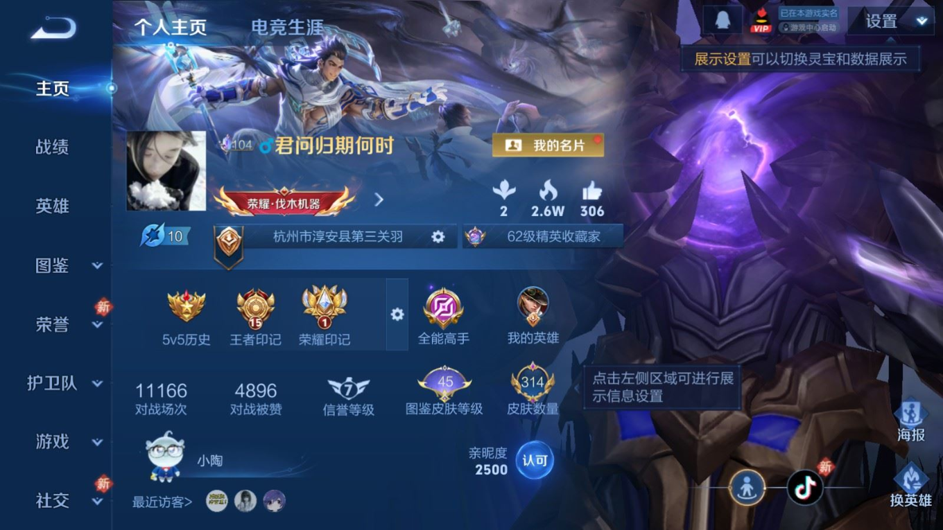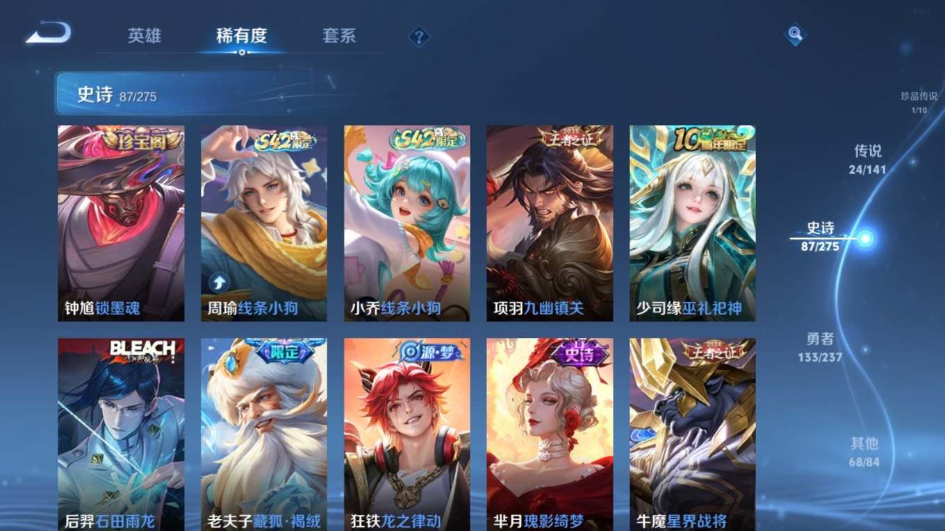 贵族等级:v9皮肤数:314情人节限定2 荣耀典藏1 传说品质24 生肖限定11 珍品传说1 英雄数:128
