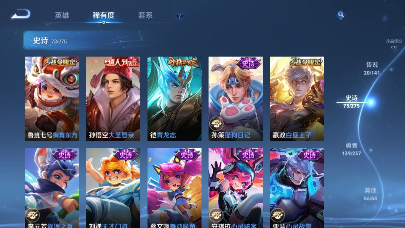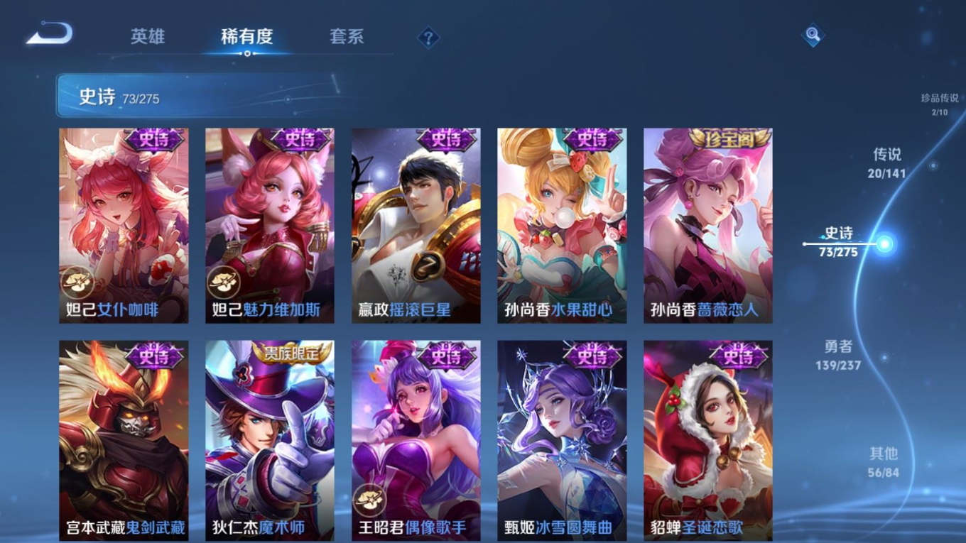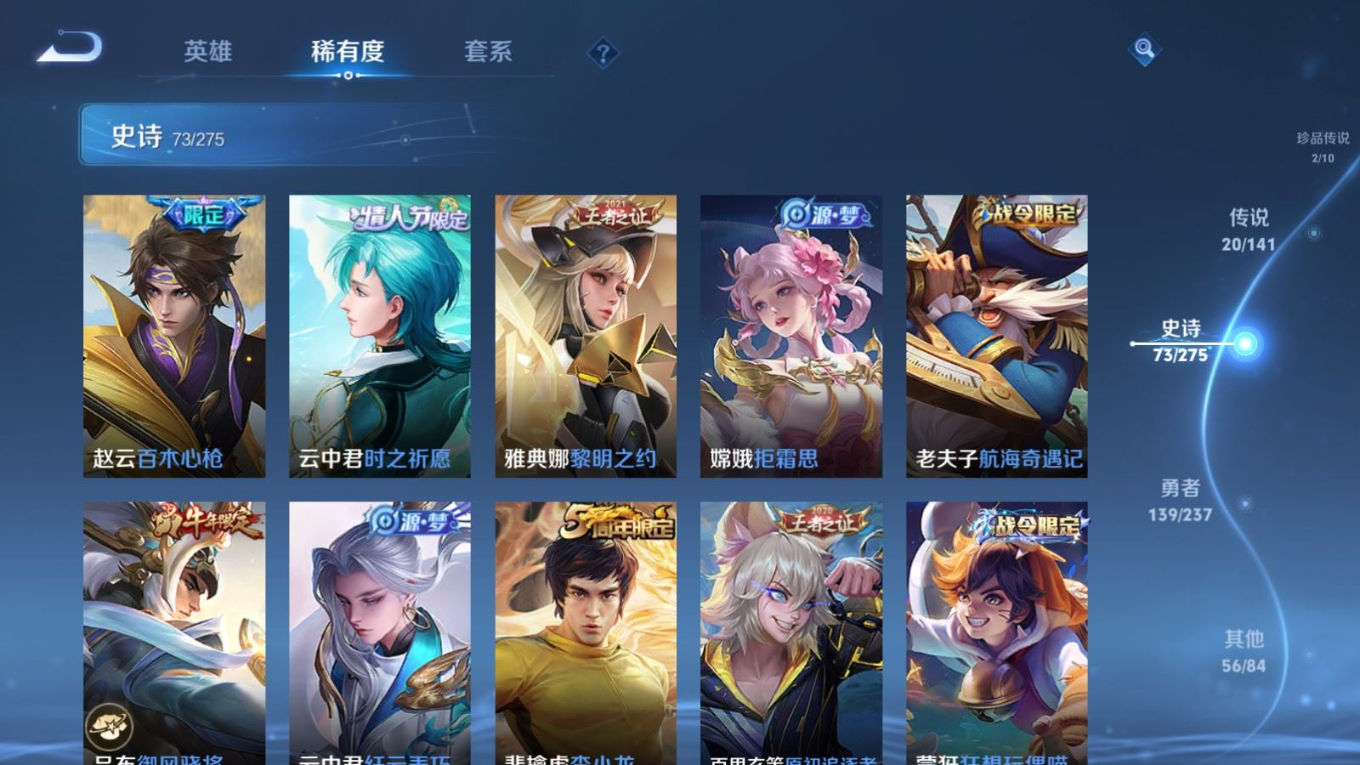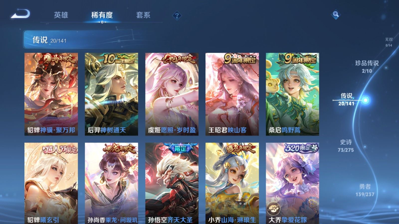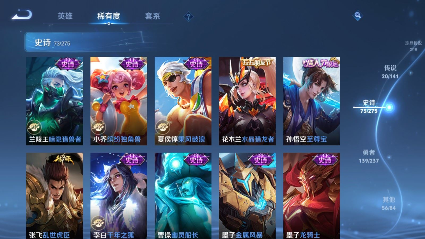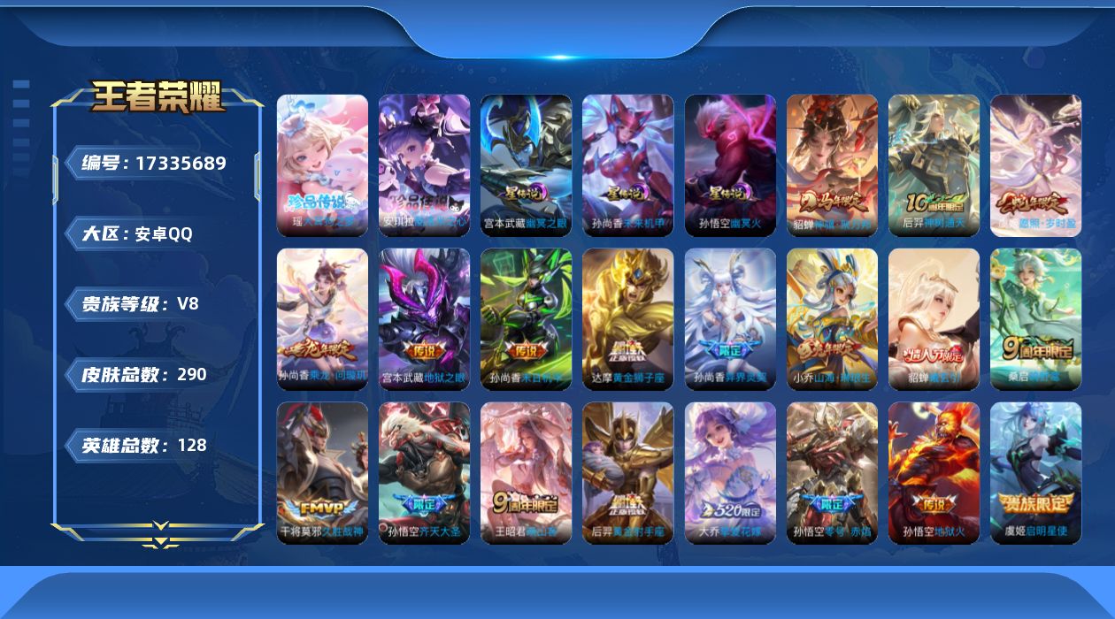 贵族等级:v8皮肤数:290传说品质20 情人节限定5 生肖限定8 珍品传说2 英雄数:128