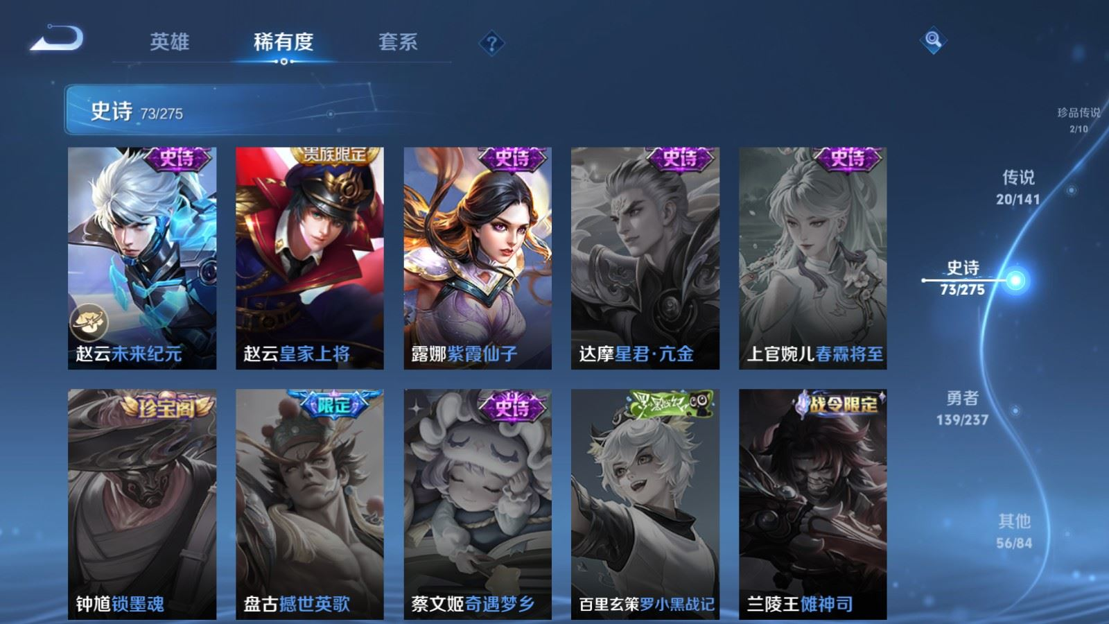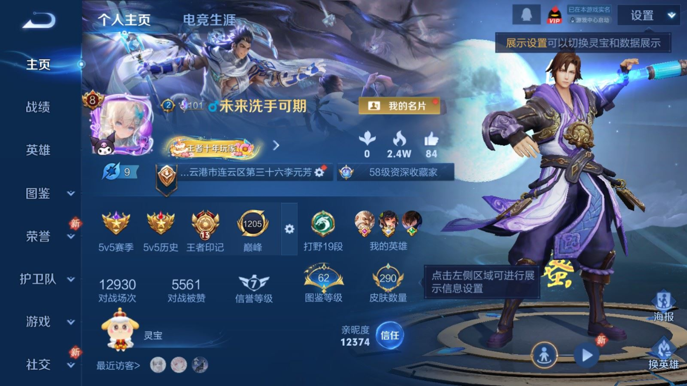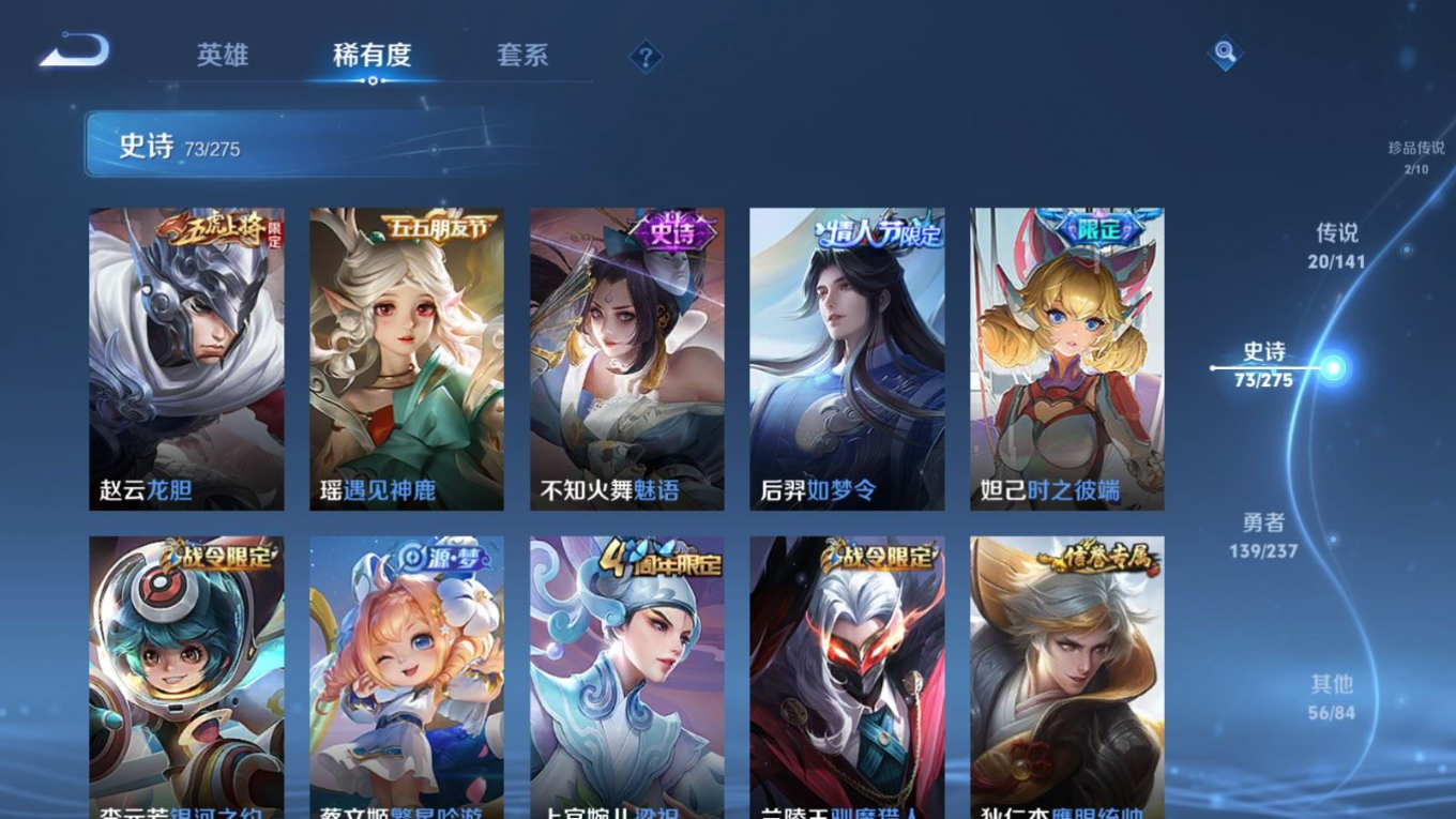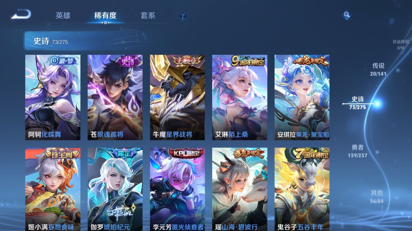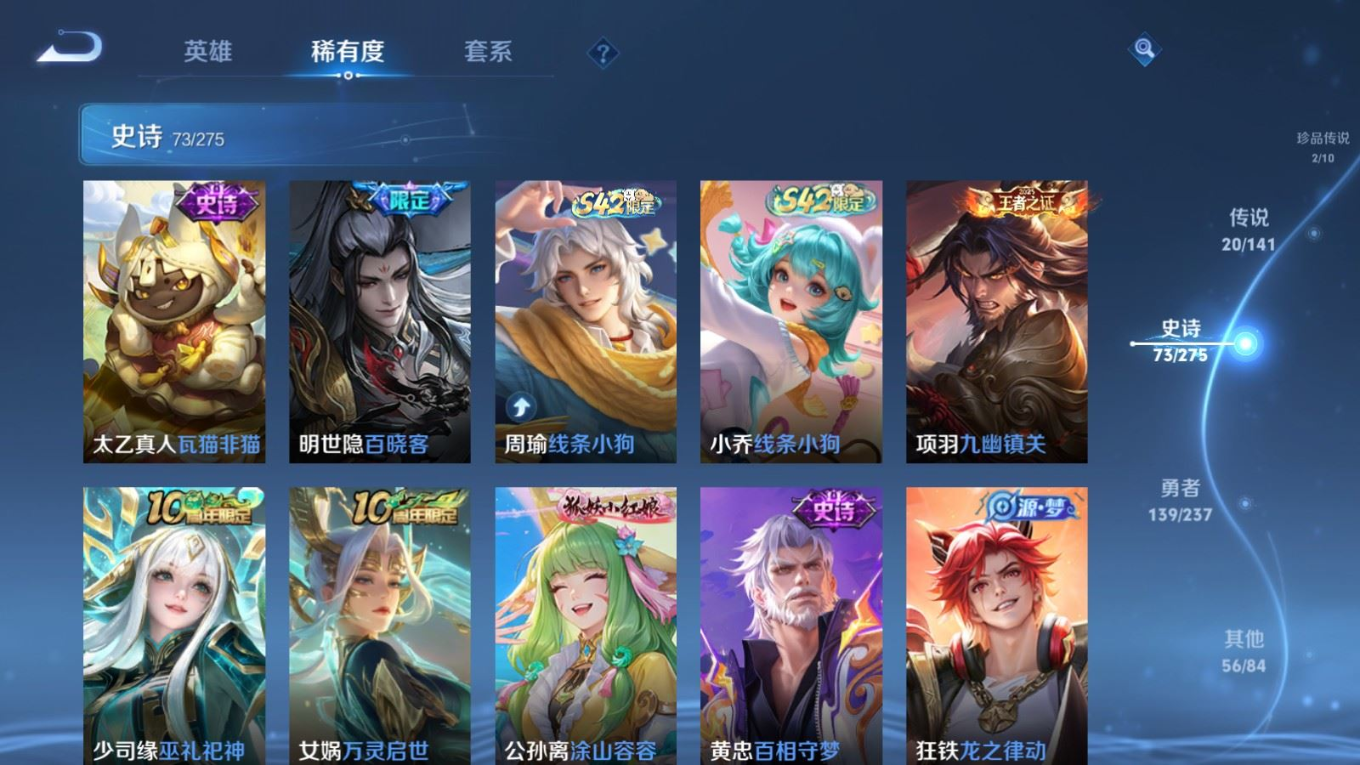 贵族等级:v8皮肤数:290传说品质20 情人节限定5 生肖限定8 珍品传说2 英雄数:128